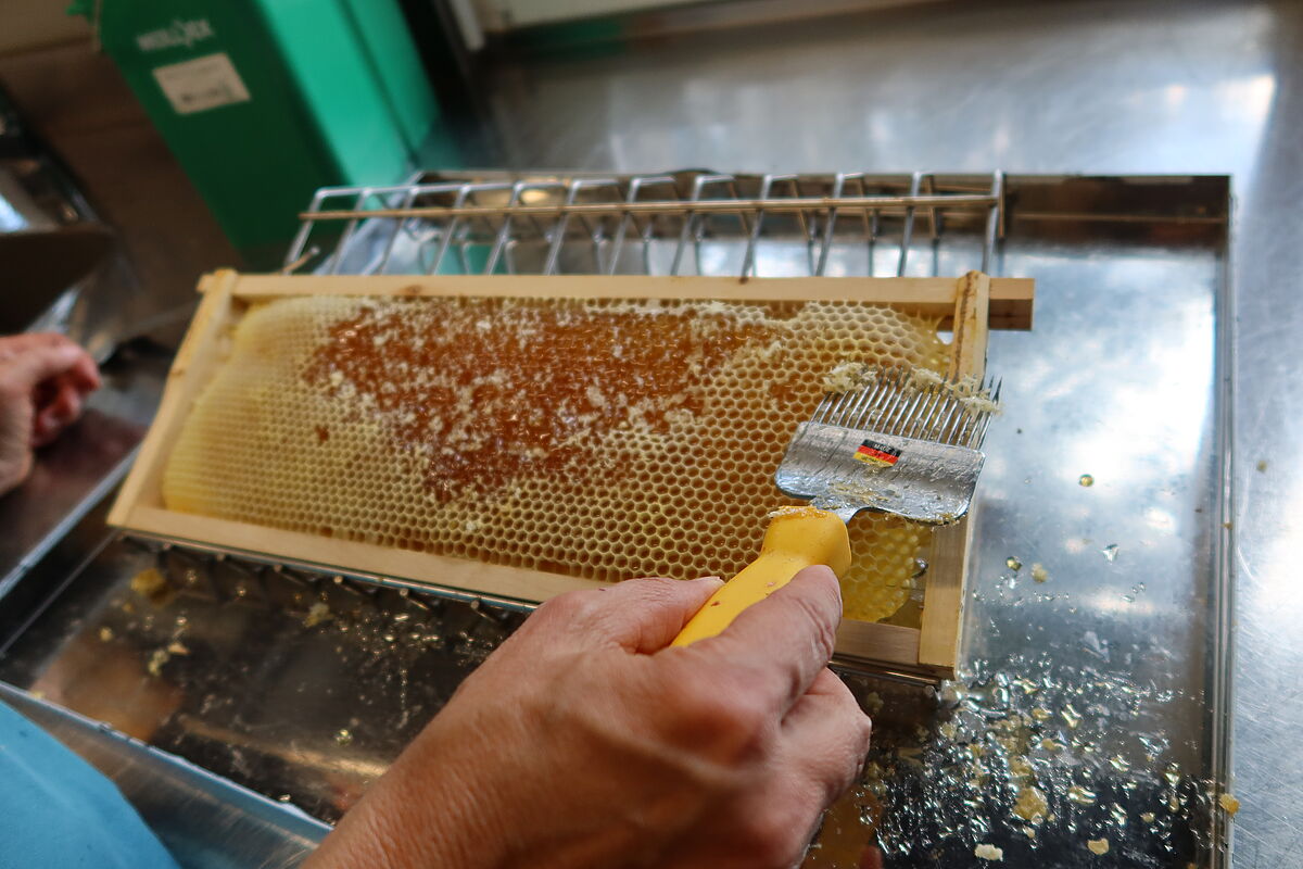 In der Küche des Parreizentrums St. Michael waren die idealen Bedingungen, um den Sommerhonig hygienisch zu ernten. Herzlichen Dank an Guido Ludin und Esther Häusermann für diese tolle Arbeitsstätte. Was es zur Honigernte braucht: ein paar motovierte Helferinnen und Helfer, spezielle Gabeln, um das Deckelwachs zu entfernen und eine Schleuder, um den Honig aus den Waben zu bekommen. Die Bienen vom Quartier Garten Michael haben dieses Jahr 26 kg feinsten Sommerhonig hergestellt.