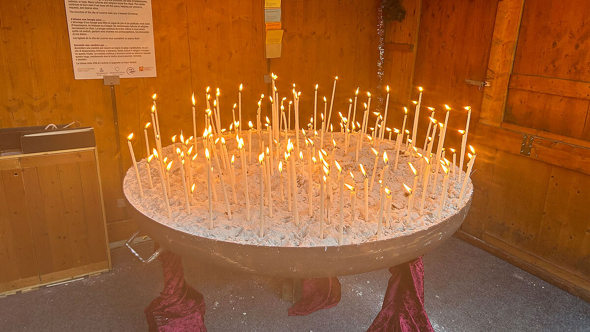 Die Katholische Kirche Stadt Luzern beteiligt sich dabei am ökumenischen Stand zusammen mit der Reformierten Kirche Stadt Luzern und der Christkatholischen Kirche Luzern. Im Zentrum des Standhäuschens steht eine grosse Feuerschale, wo die Besucher:innen eine Kerze anzünden können.