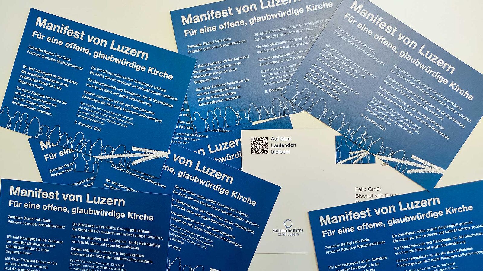 Diese Postkarte wurde am 8. November an der Kungebung in Luzern verteilt. Auf der Rückseite ist Platz für eine persönliche Notiz an Bischof Felix Gmür. Das Manifest von Luzern erhielten auch die Mitglieder der Synode anlässlich ihrer Herbstsession am 8. November.