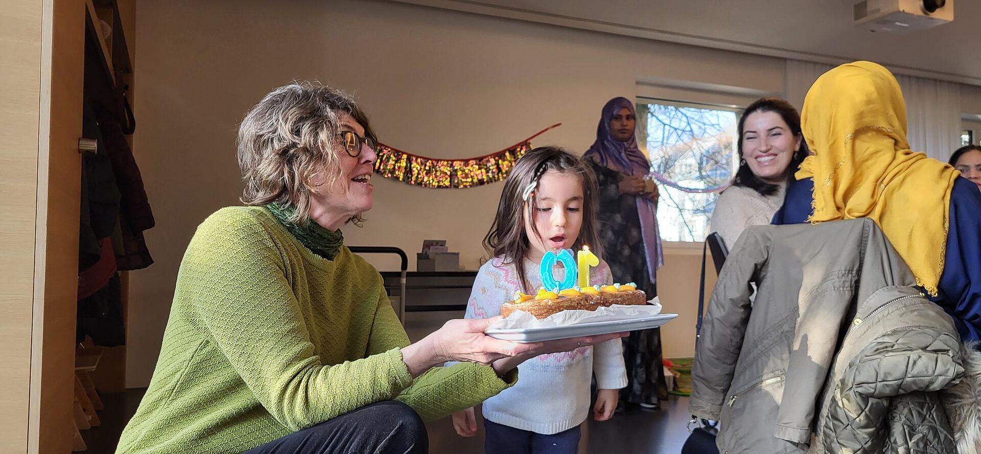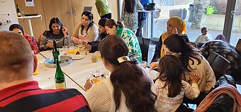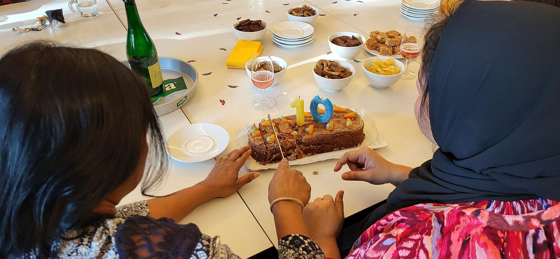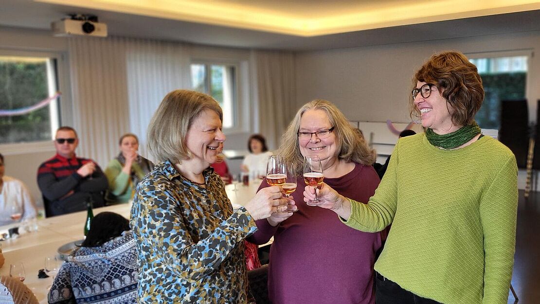 Schon vor einigen Jahren wurde der Treff in den kleinen Saal verlegt. Hier begrüssten die drei Moderatorinnen des Vereins ZML auch die zahlreichen Gäste der Jubiläumsfeier. Drei Frauen, die seit 2014 den Treff regelmässig besuchen, berichten über Berührendes, Erstaunliches und Lehrreiches aus der Anfangszeit. Anhand von Fotos erinnerten sich die Gäste an spezielle Ereignisse und an frühere Besucher:innen. Mit alkoholfreiem Sekt wurde auf die Erfolgsgeschichte MaiHof-Treff angestossen.