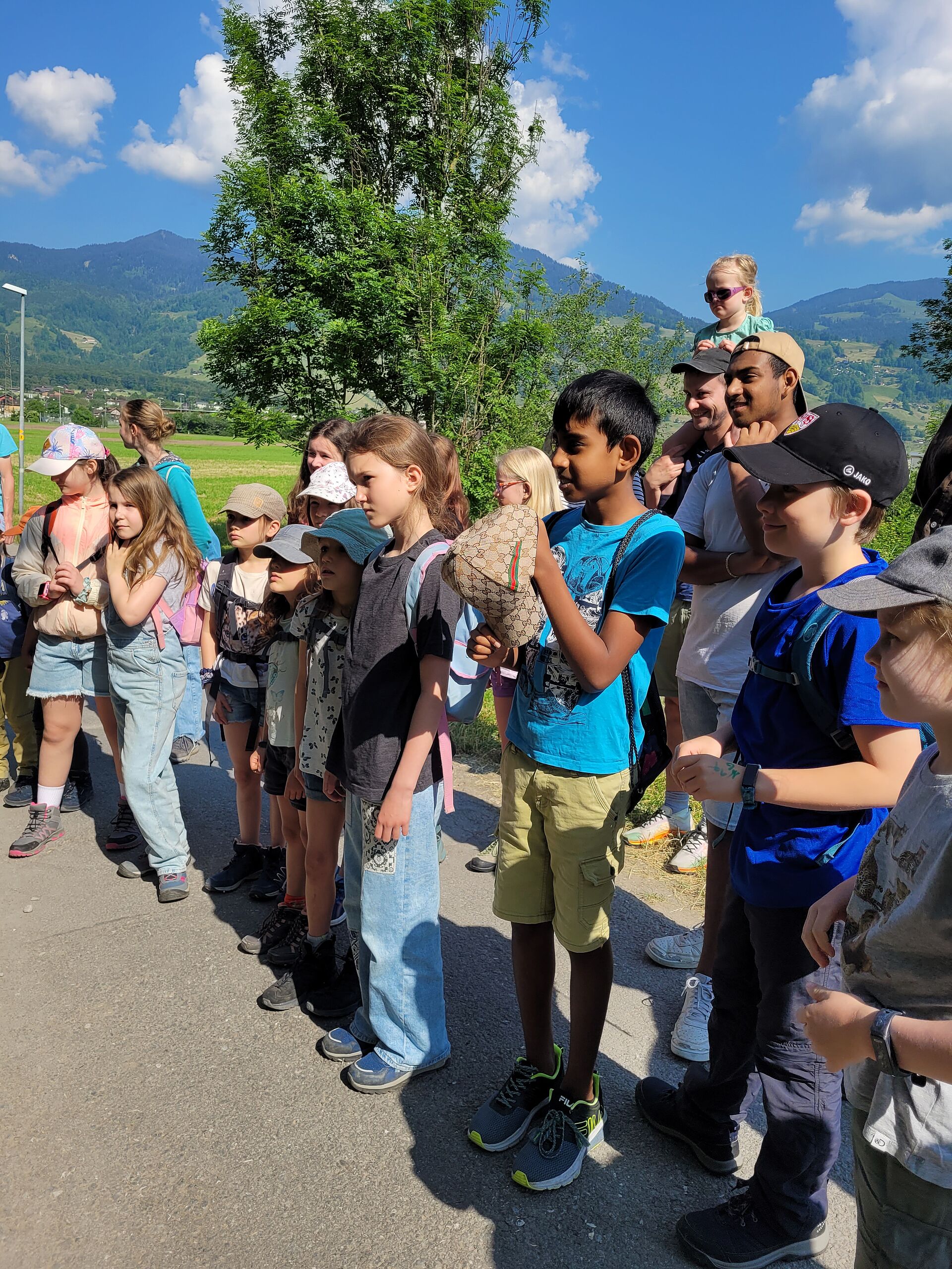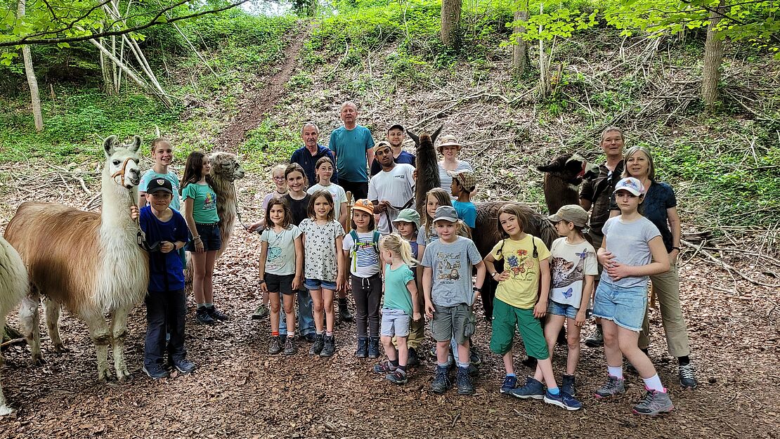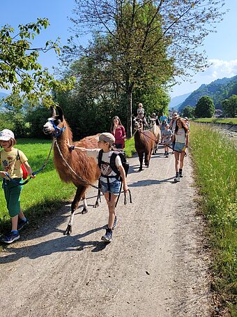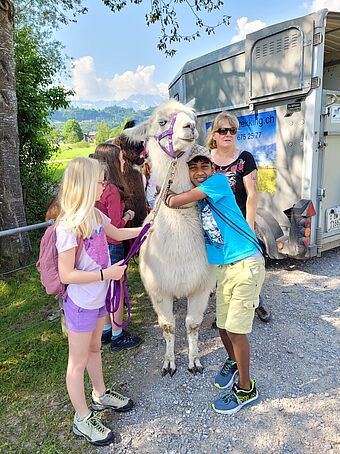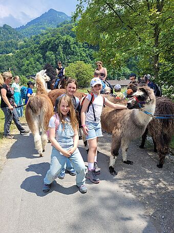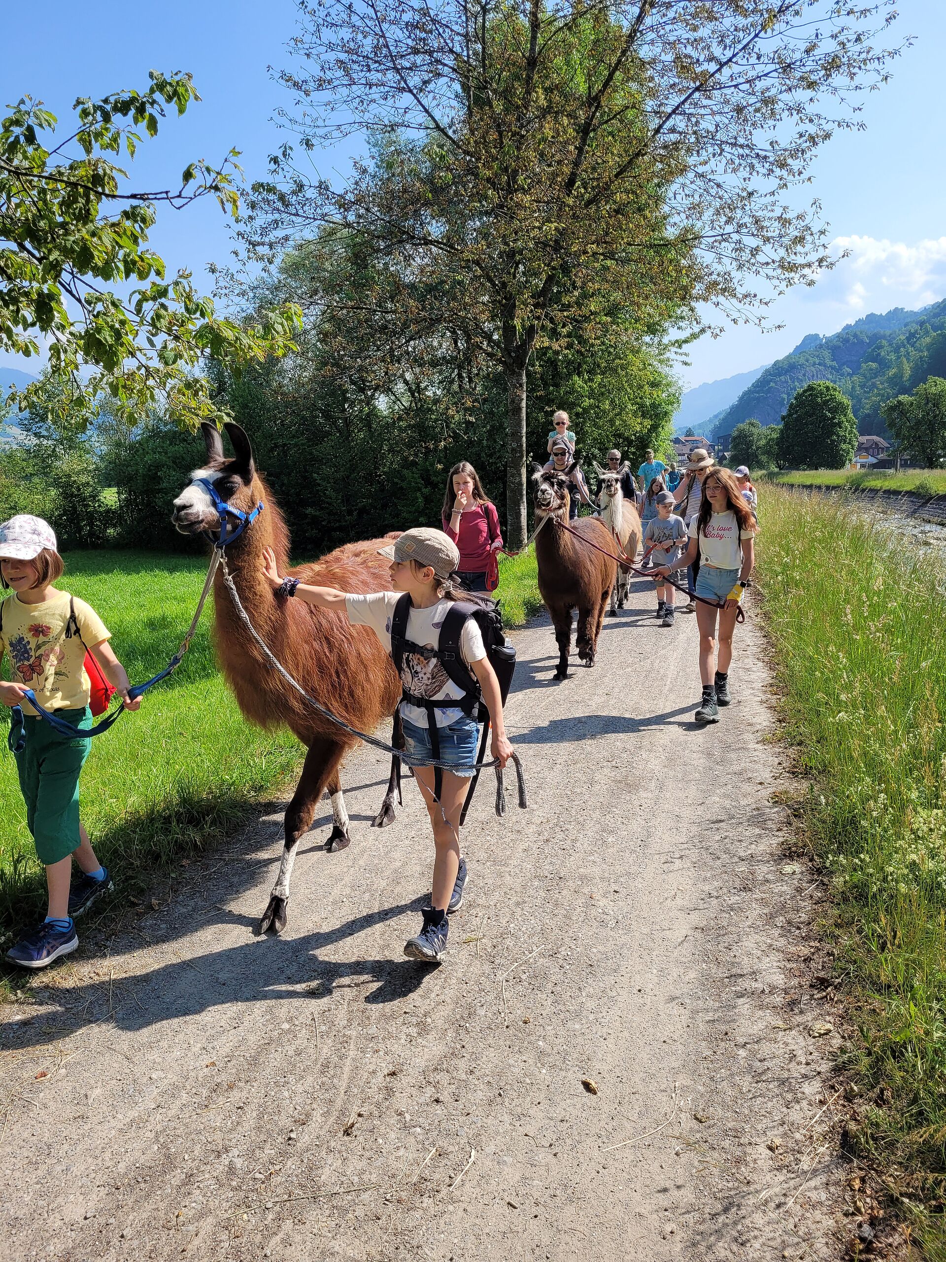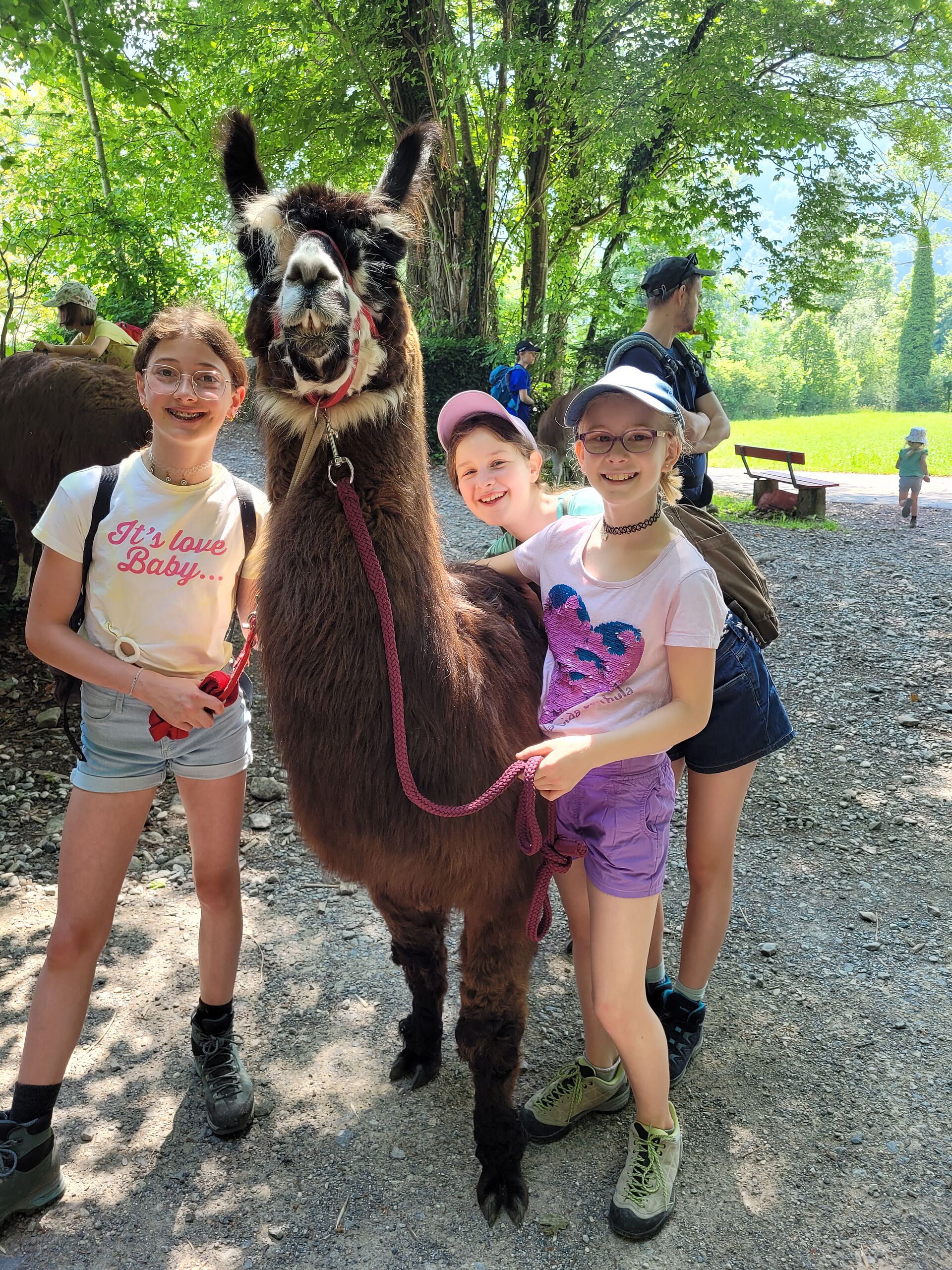Jeweils zwei Kinder zusammen durften sich ein Lama aussuchen. Das war gar nicht einfach, denn alle waren sie wunderschön und hatten klangvolle Namen. Nun starteten wir auf einen schönen, langen Spaziergang entlang dem Fluss, übers Feld und durch den Wald. Immer wieder mal musste angehalten werden, weil ein Lama dem saftigen Gras am Wegesrand oder den grünen Blättern an den Bäumen nicht widerstehen konnte.