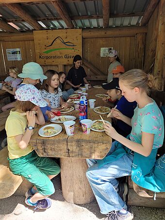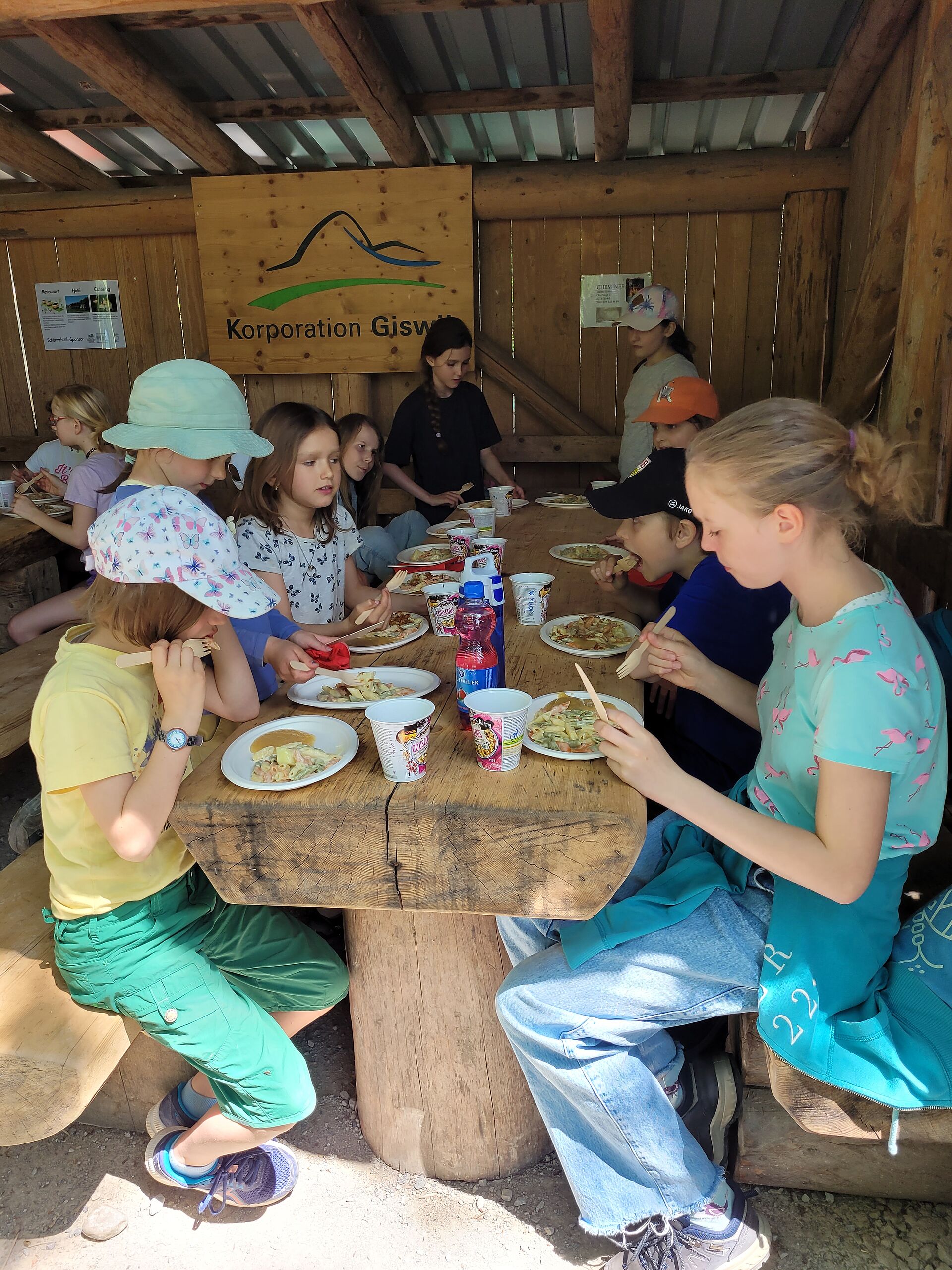 Zur Mittagszeit erreichten wir die „Schacherseppi-Hütte“, bei der der Rauch in der Feuerstelle auf ein feines Zmittag hindeutete und im Brunnen kühle Getränke gegen den Durst bereitstanden. Nun durften sich die Lamas im Schatten der Bäume ausruhen, während dessen wir uns über die feinen Älplermakronen und Apfelmus hermachten. Zum Dessert gab es Süsses und für Rafal einen Geburtstagskuchen. Zum 50. Geburtstag sangen ihm die Spatzen und die Minis ein „Happy Birthday“ aus vollen Kehlen. Viel Glück, lieber Rafal!