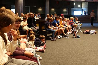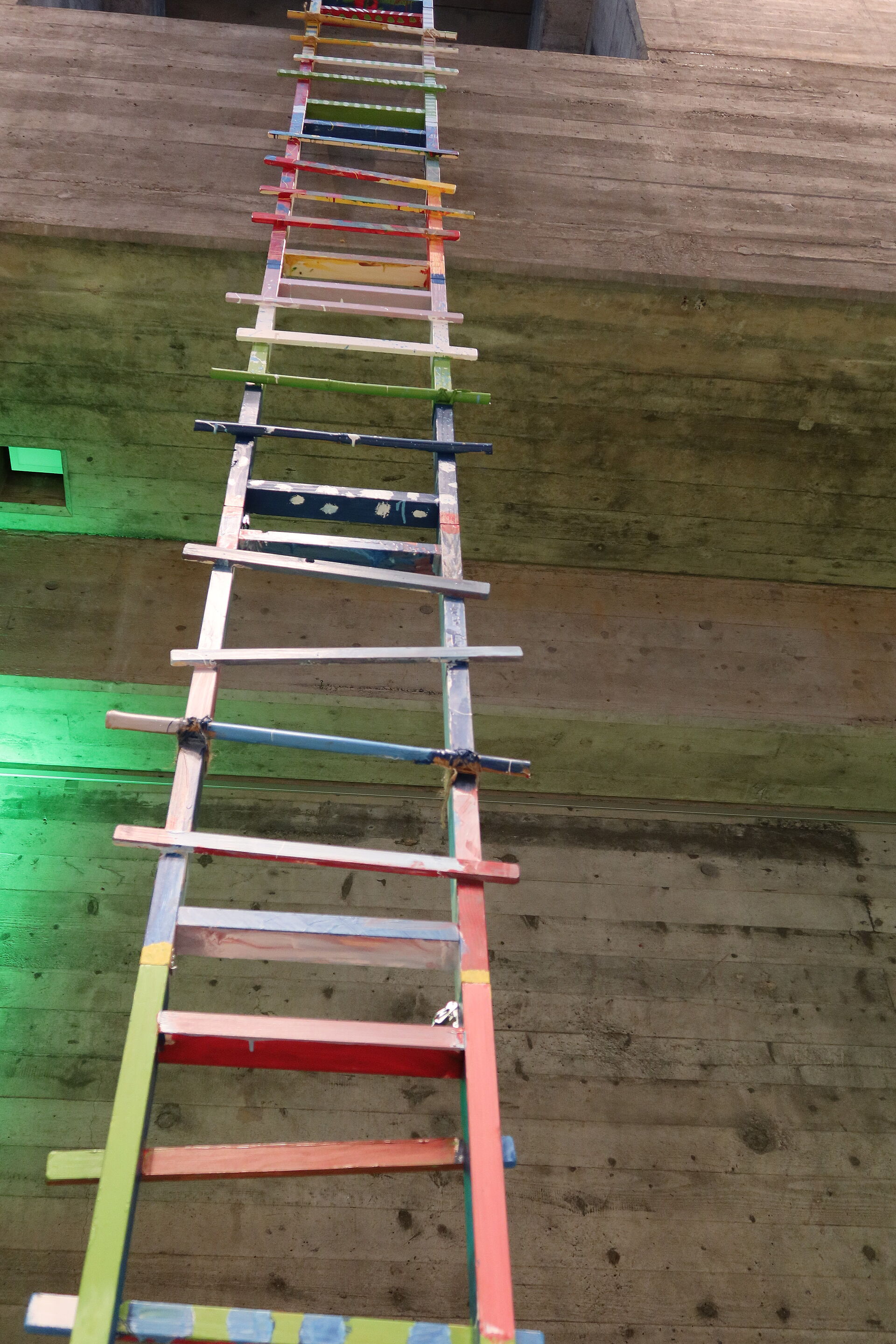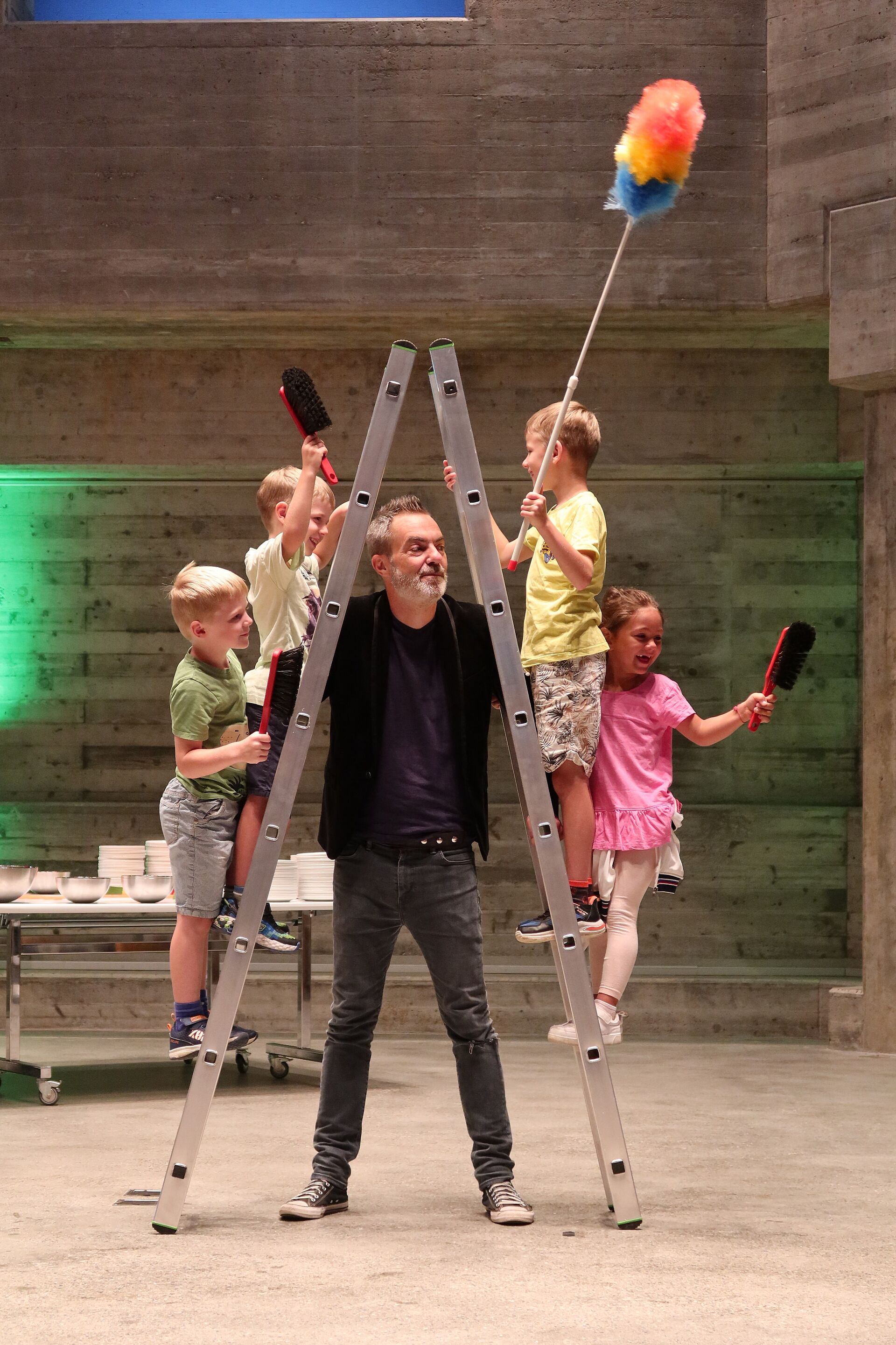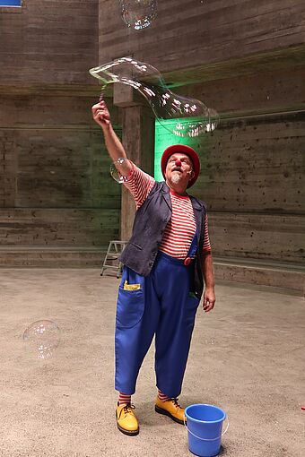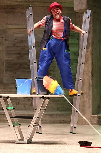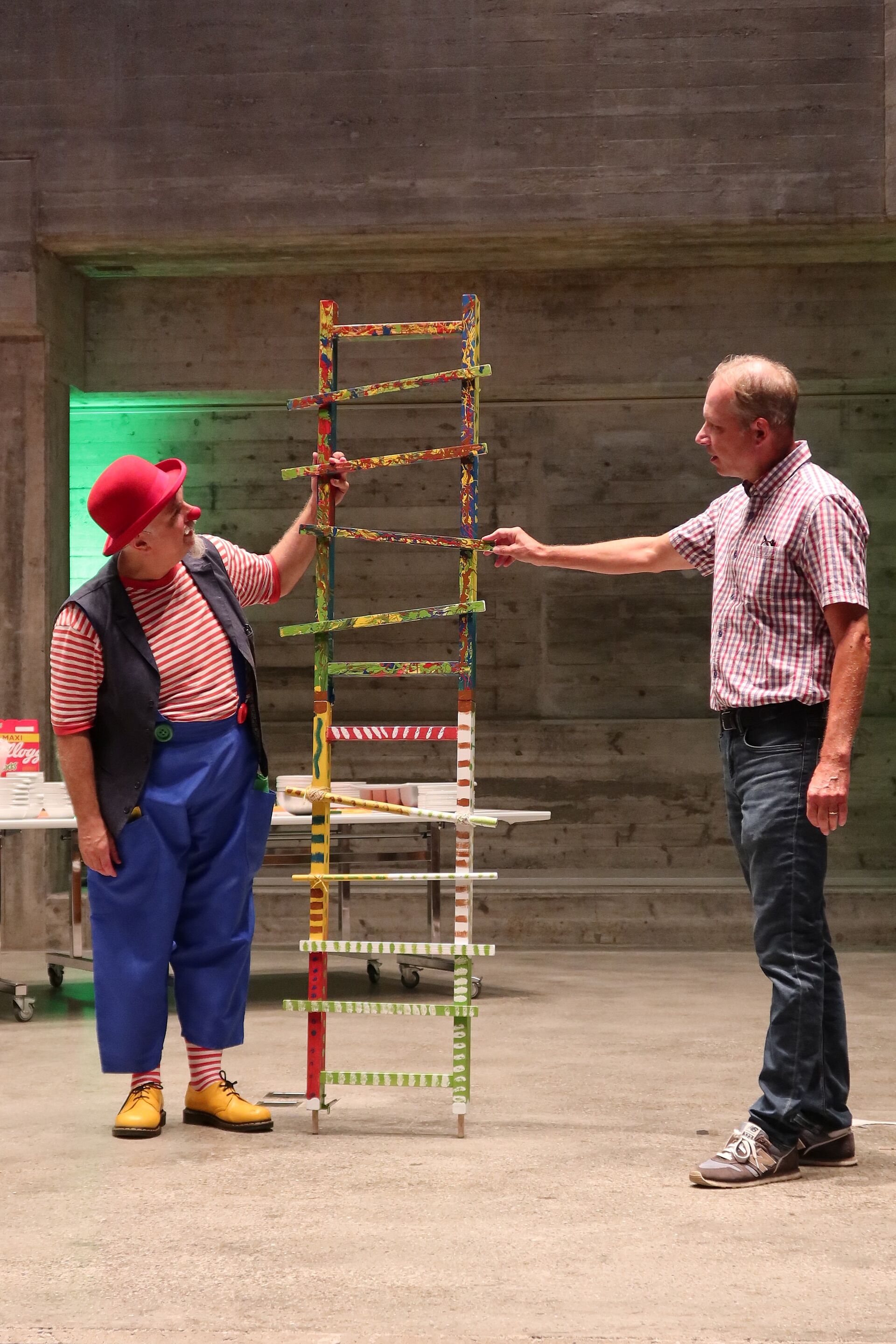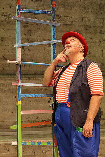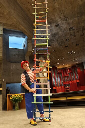 Mit der Bibelgeschichte von Jakob und der Himmelsleiter hören wir von der Leiter, die Himmel und Erde verbindet. Clown Fidibus baut aus den farbigen Leiterteilen, die Schülerinnen und Schüler im vergangenen Schuljahr erstellt und bemalt hatten, eine beeindruckend grosse Leiter zusammen. In seiner tiefgründigen Art brachte er uns die Bibelgeschichte näher.