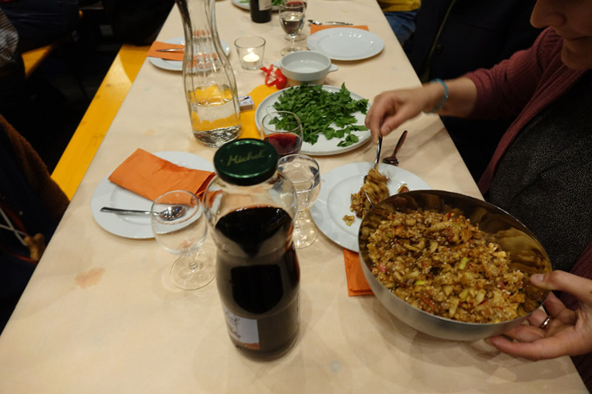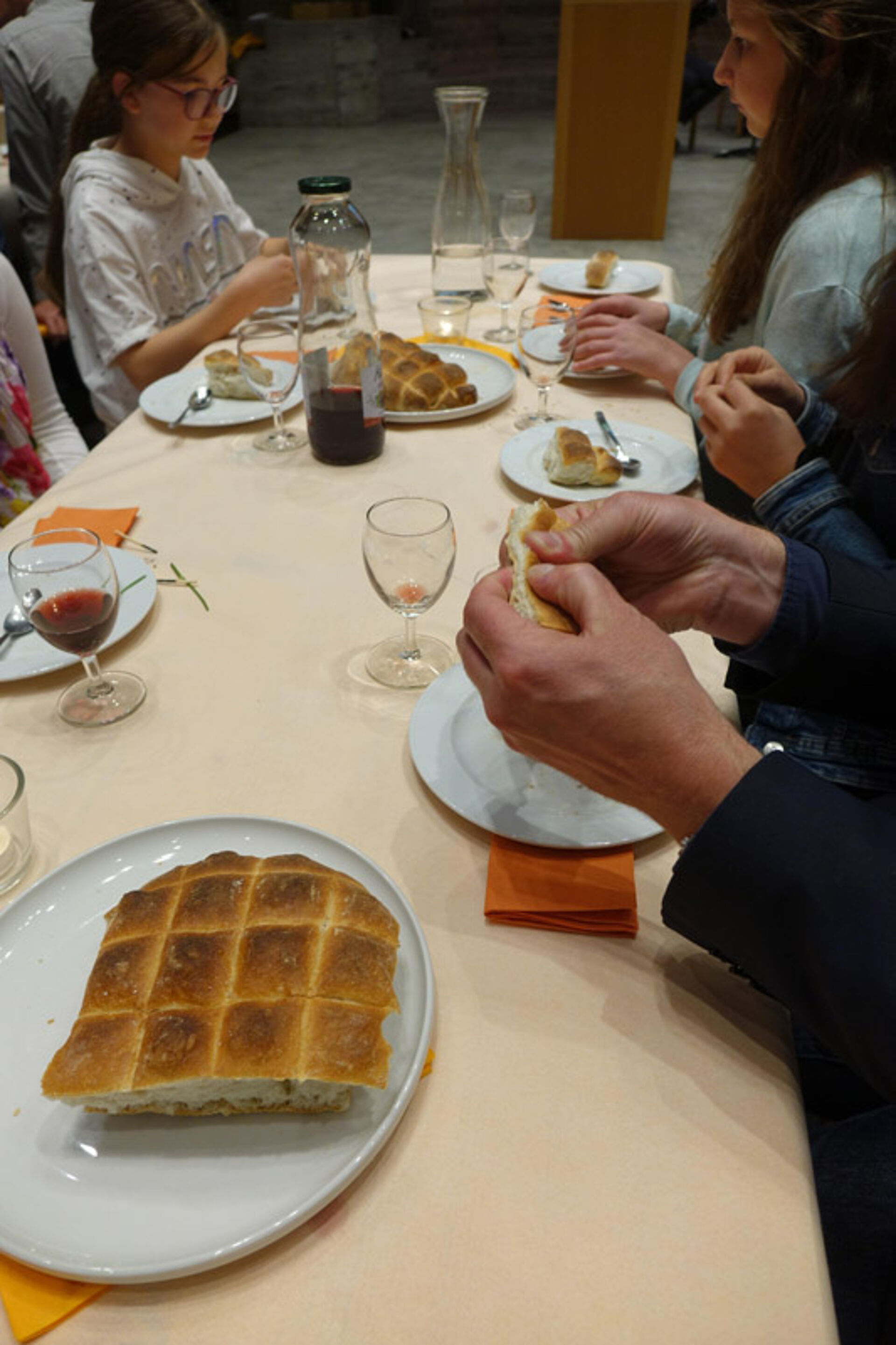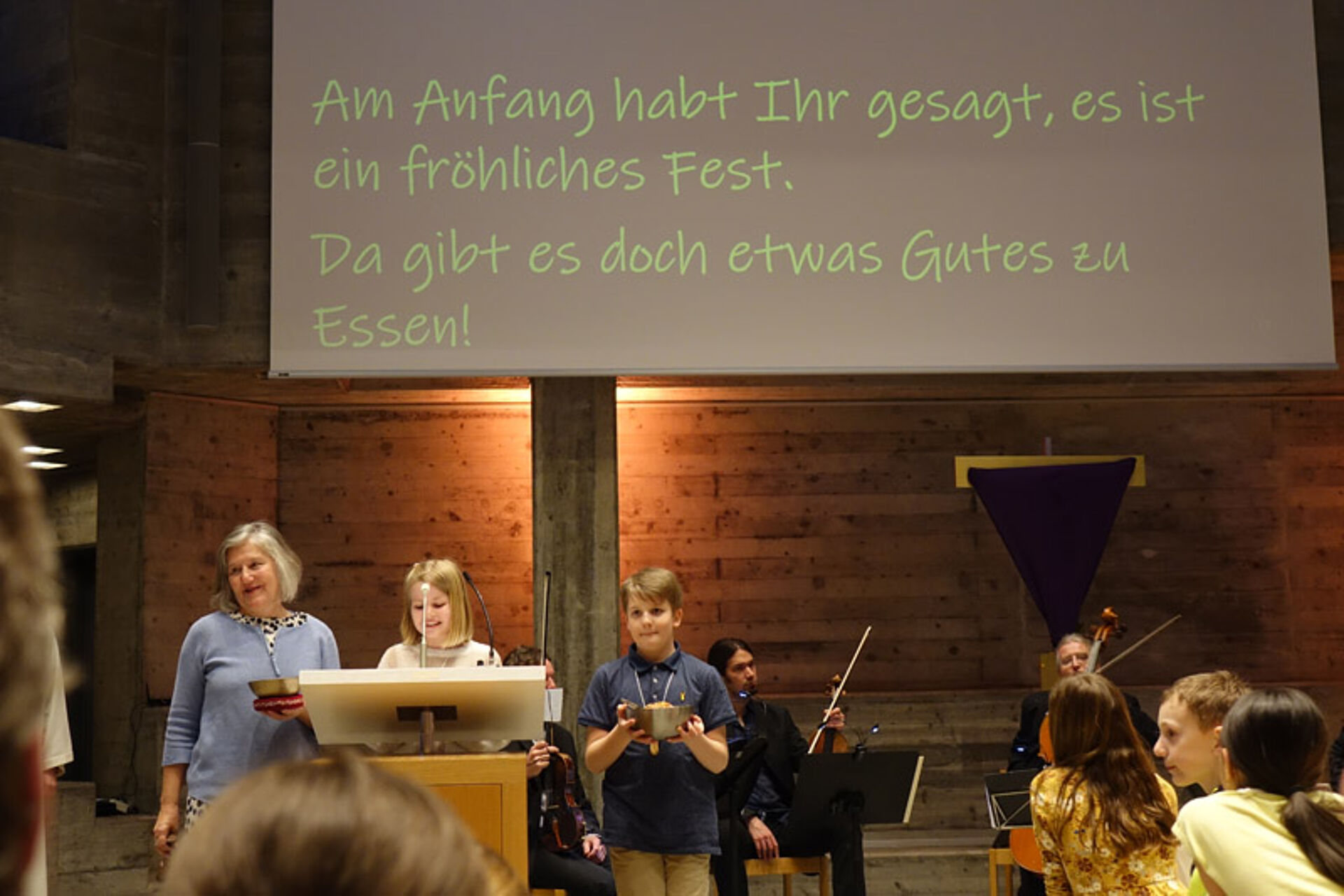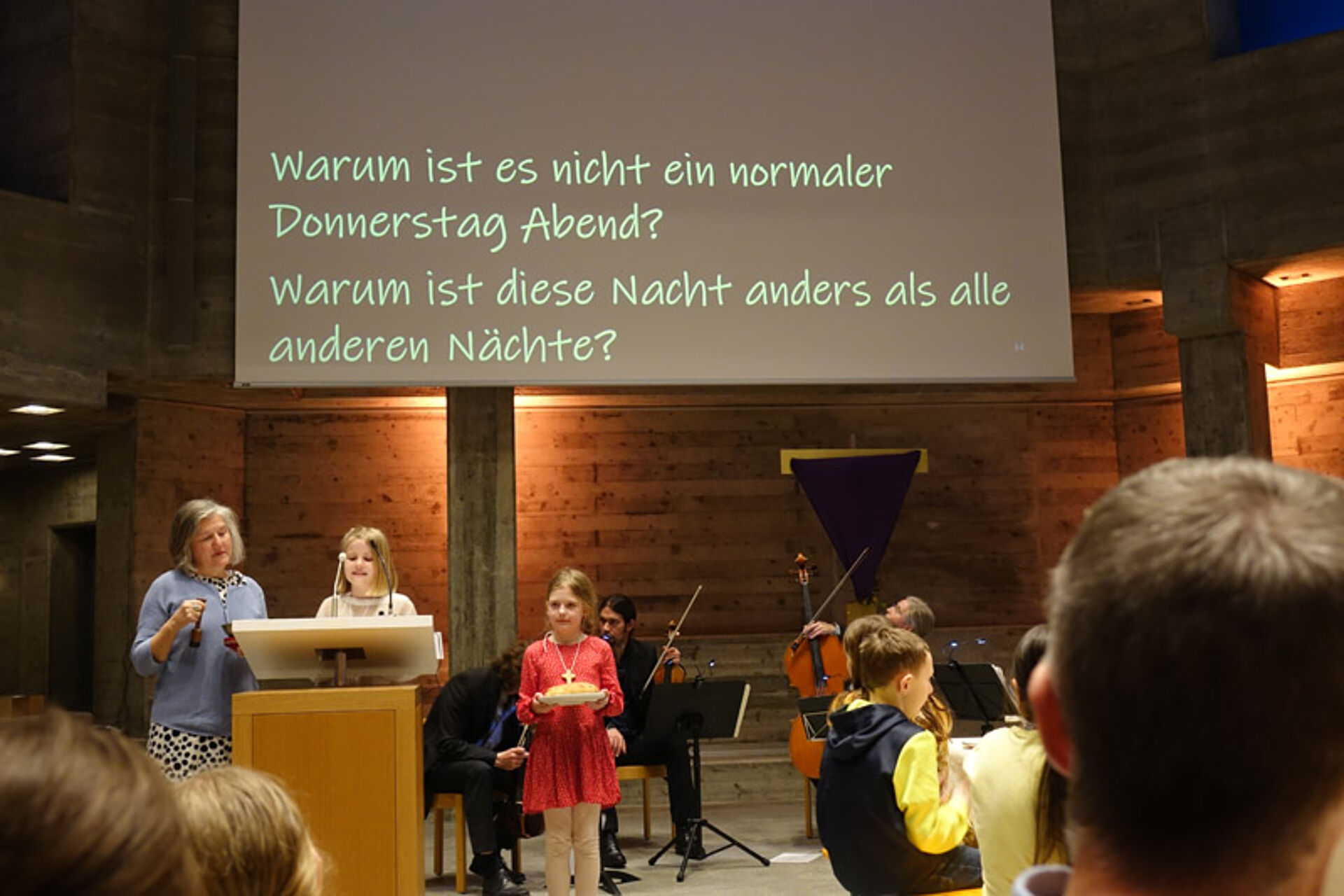 Beim Eingang werden die Hände gewaschen. Dies in Anlehnung an die Fusswaschung durch Jesus. Danach kann das Pessachfest beginnen, so wie dies Jesus mit seinen Gästen auch feierte. Mit Wein, Traubensaft, Bitterkräutern, dem Chassat Mus und Brot wird diese spezielle Nacht gefeiert. Begleitet von passender Musik durch das Spring String Quartett. Gegen Schluss wird das gesamte Festmahl abgeräumt.