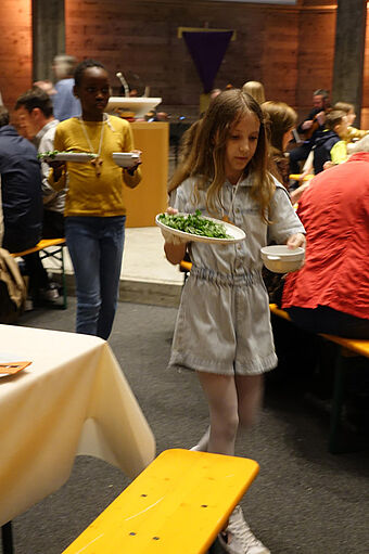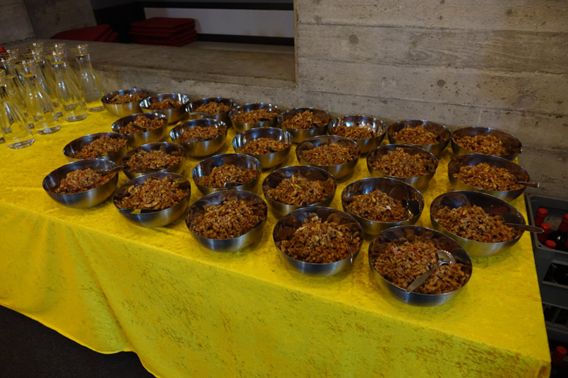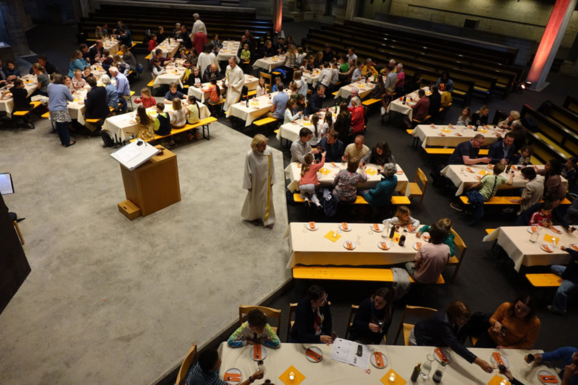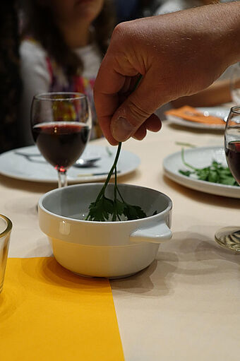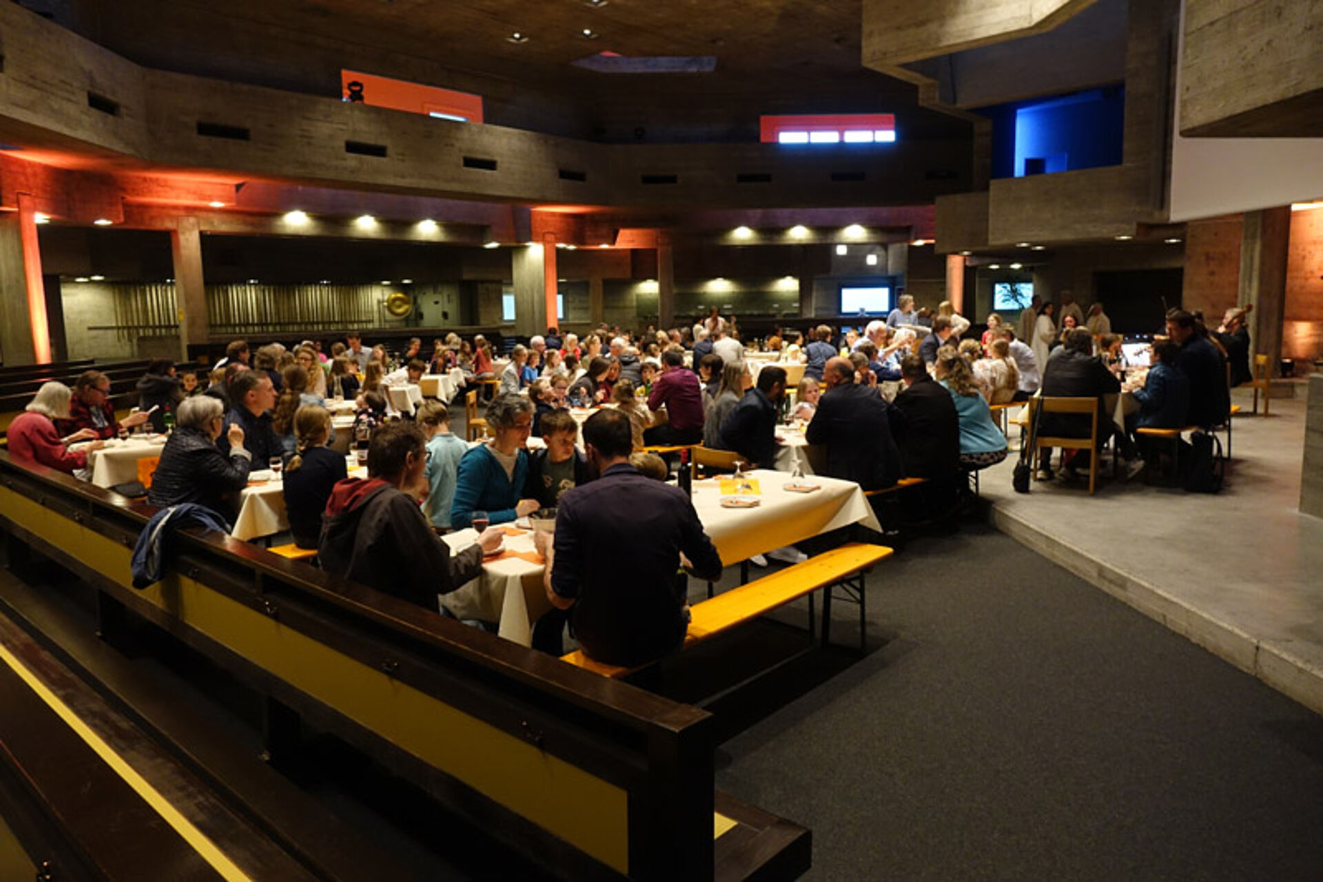 Beim Eingang werden die Hände gewaschen. Dies in Anlehnung an die Fusswaschung durch Jesus. Danach kann das Pessachfest beginnen, so wie dies Jesus mit seinen Gästen auch feierte. Mit Wein, Traubensaft, Bitterkräutern, dem Chassat Mus und Brot wird diese spezielle Nacht gefeiert. Begleitet von passender Musik durch das Spring String Quartett. Gegen Schluss wird das gesamte Festmahl abgeräumt.
