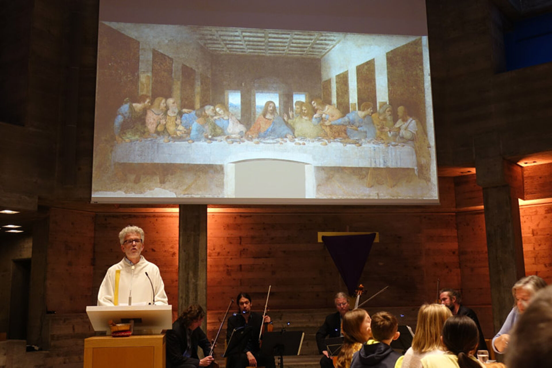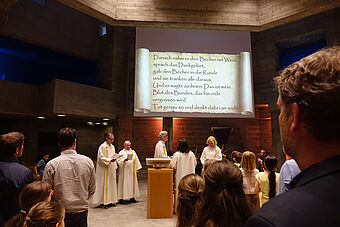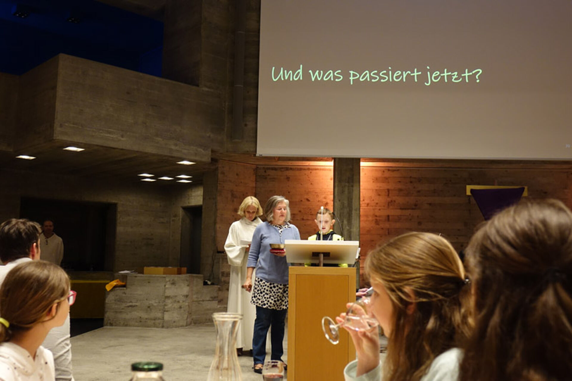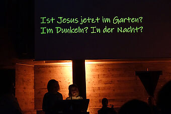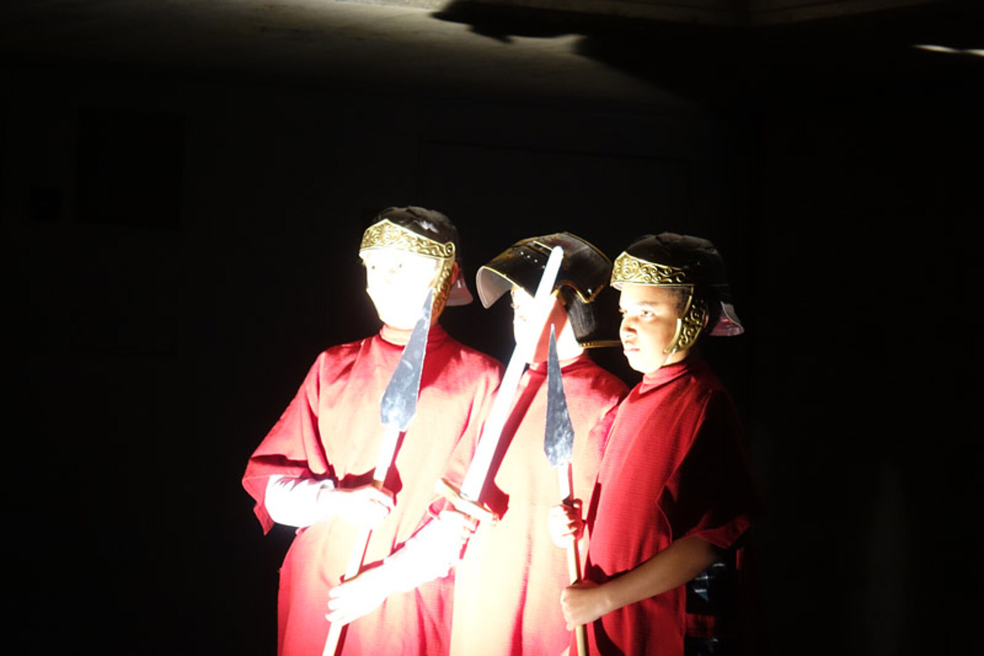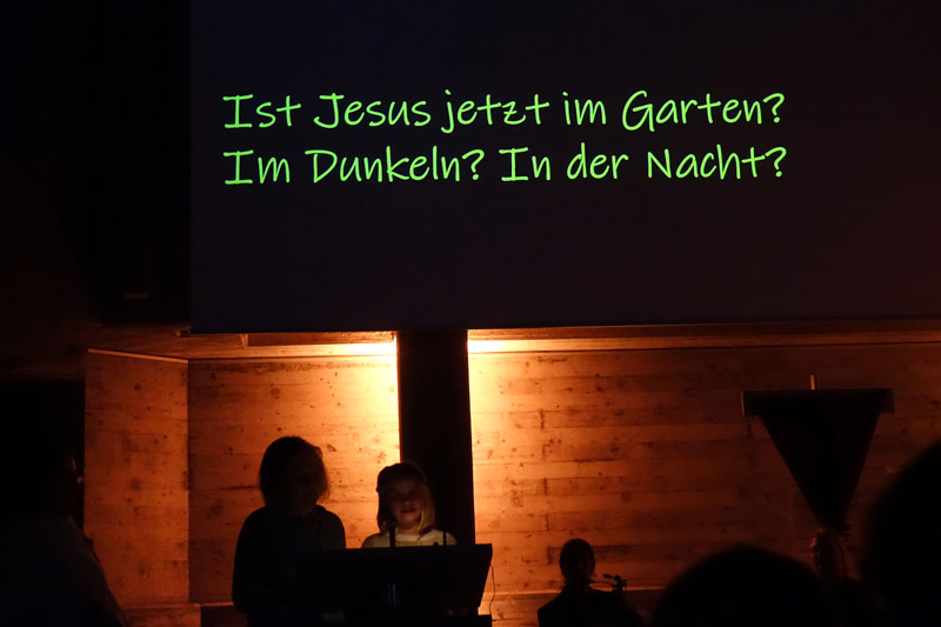 In der Kirche wird es dunkel. Schüler stellen die Szene der Verhaftung Jesu dar.