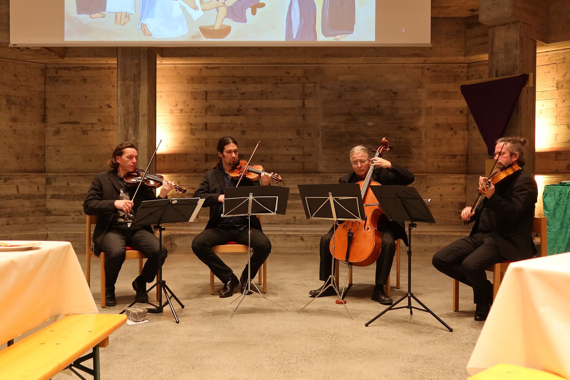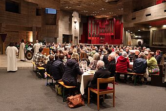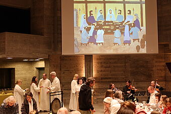 Mehr als 20 festlich gedeckte Tische stehen für die Besuchenden bereit. Beim Eingang werden die Hände gewaschen. Dies in Anlehnung an die Fusswaschung durch Jesus. Danach kann das Pessachfest beginnen, so wie dies Jesus mit seinen Gästen auch feierte. Mit Wein, Traubensaft, Bitterkräutern, dem Charoset Mus und Brot wird diese spezielle Nacht gefeiert. Begleitet von passender Musik durch das Spring String Quartett. Gegen Schluss wird das gesamte Festmahl abgeräumt. In der Kirche wird es dunkel. Schüler:innen stellen die Szene der Verhaftung Jesu dar.
