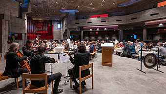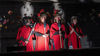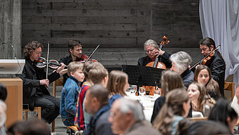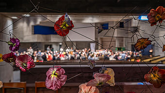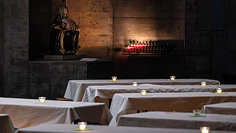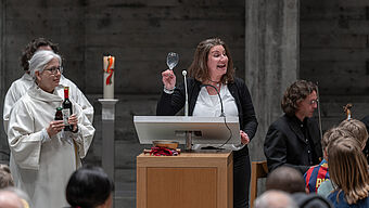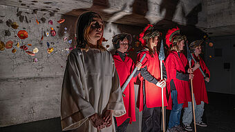 In der Kirche wird es dunkel. Schüler:innen stellen die Szene der Verhaftung Jesu dar.