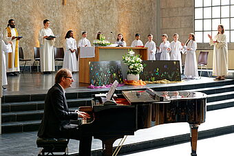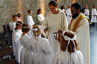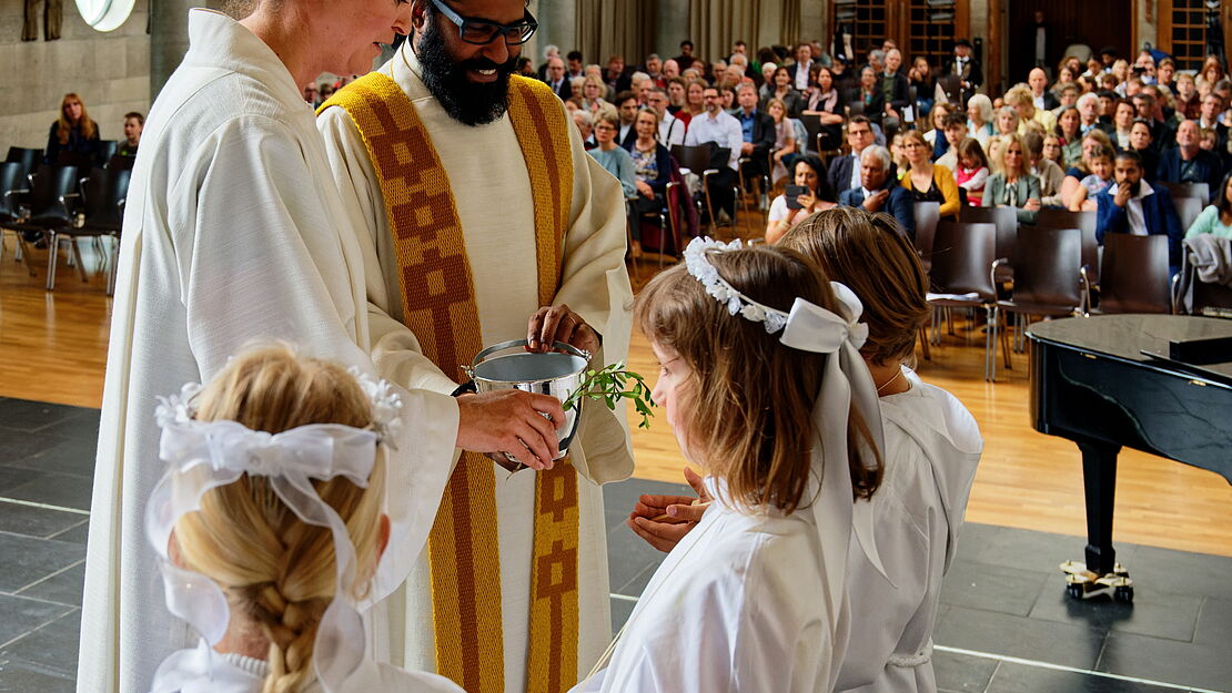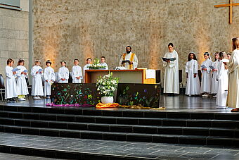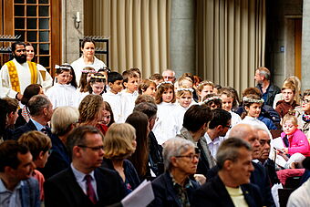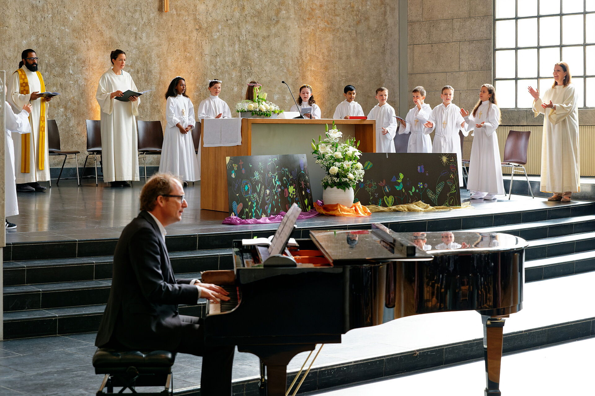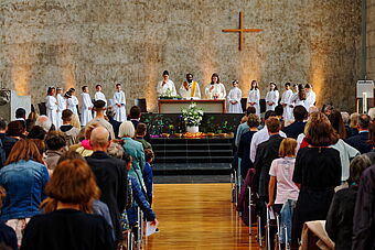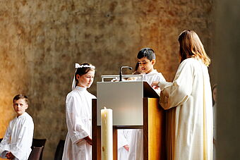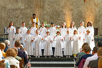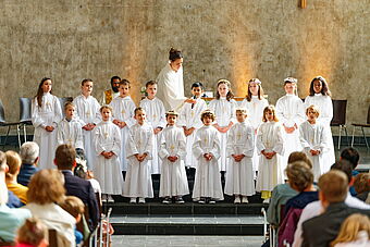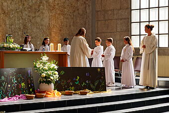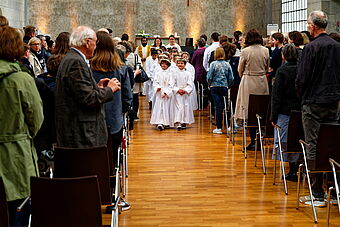 Nach dem Einzug mit der festlichen Kleidung in den Kirchensaal erzählten die Kinder, was für sie das Brot bedeutet, was sie nährt oder was ihnen Kraft und Mut gibt.