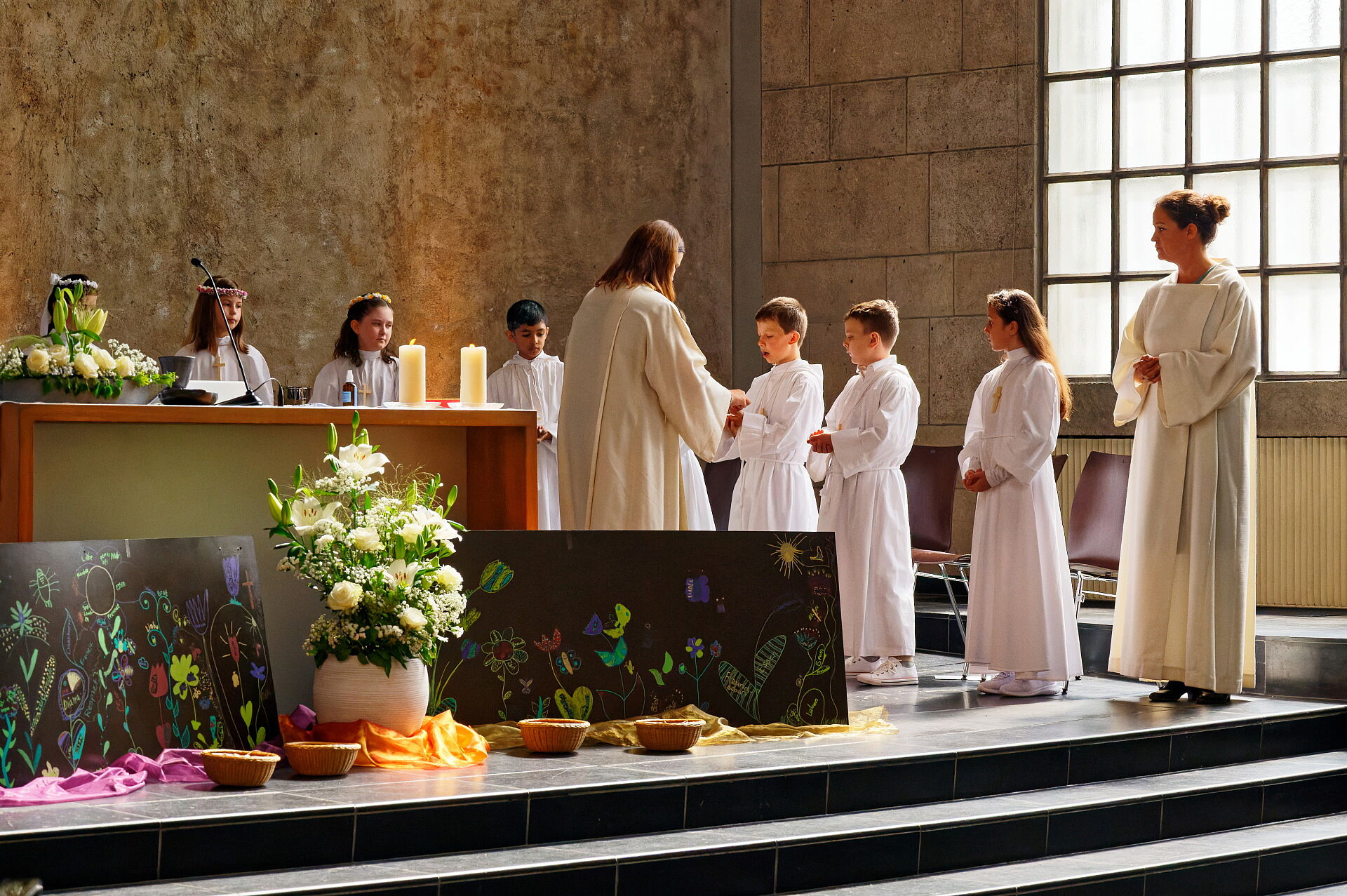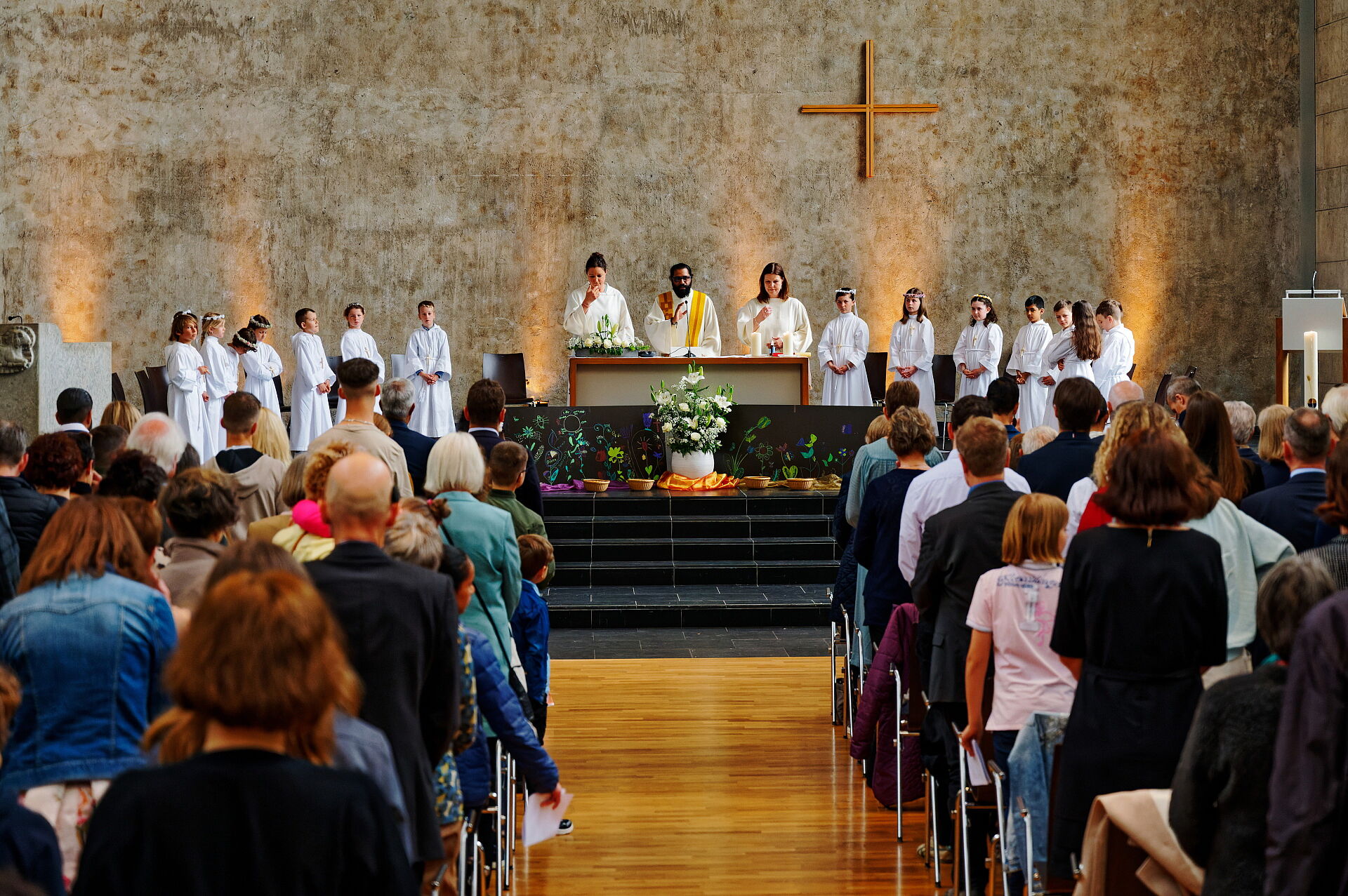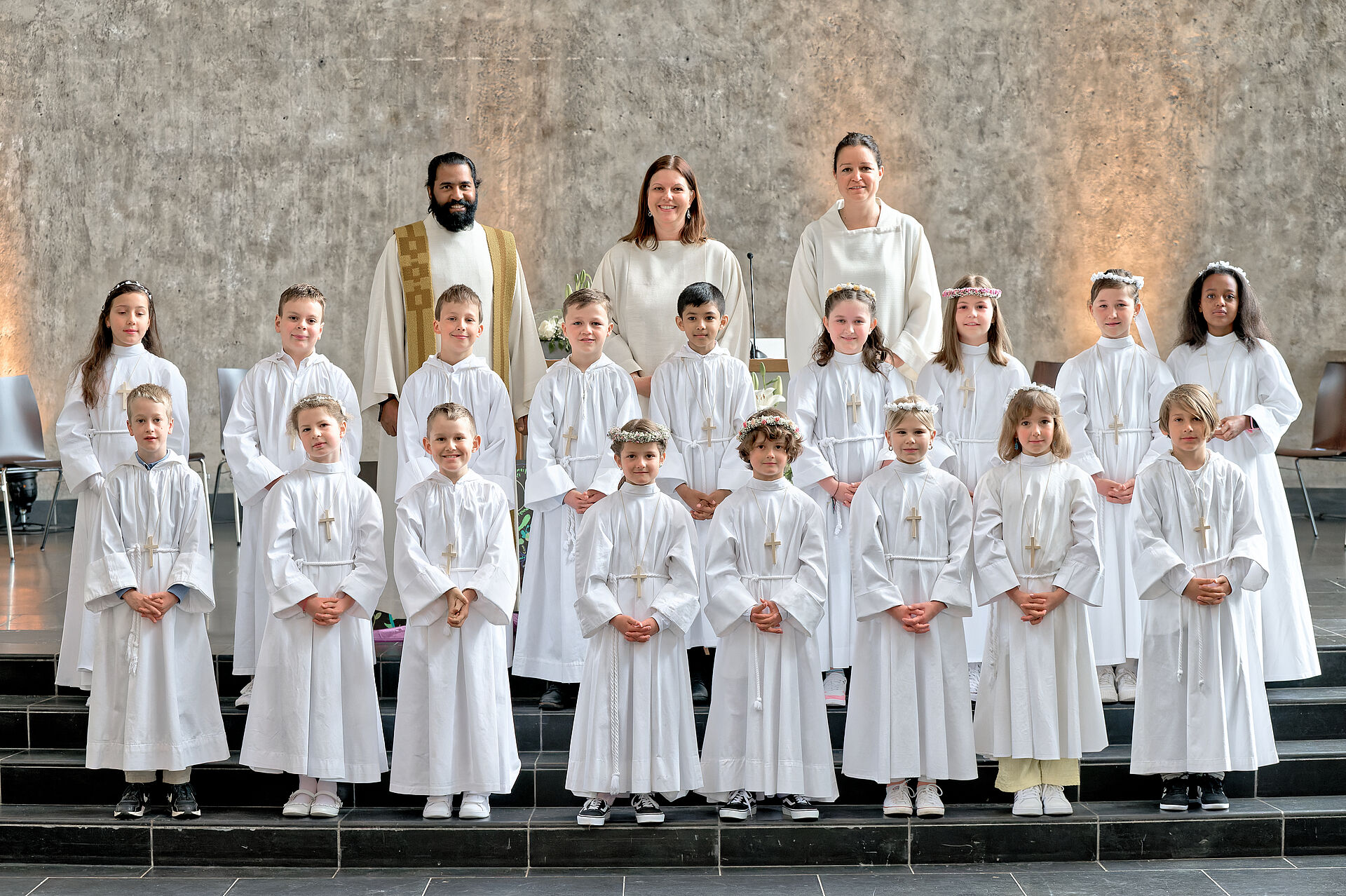 Wir wünschen unseren Erstkommunionkindern, dass ihr Herz immer mehr für Jesus brennt, dass sie die Gemeinschaft, die sie auf dem Erstkommunionweg erlebt haben, immer wieder spüren. Jesus lädt uns immer wieder ein an seinem Tisch und geht mit uns auf unserem Weg.