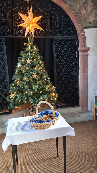 In der Kapelle steht ein Weihnachtsbaum, bei dem die Besucher mit einem goldenen
