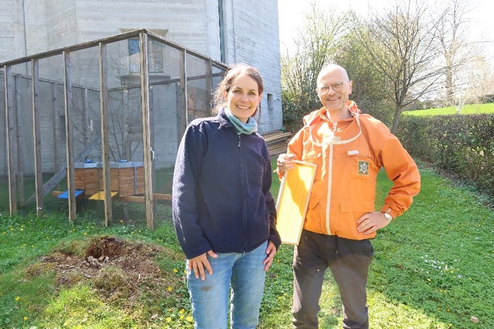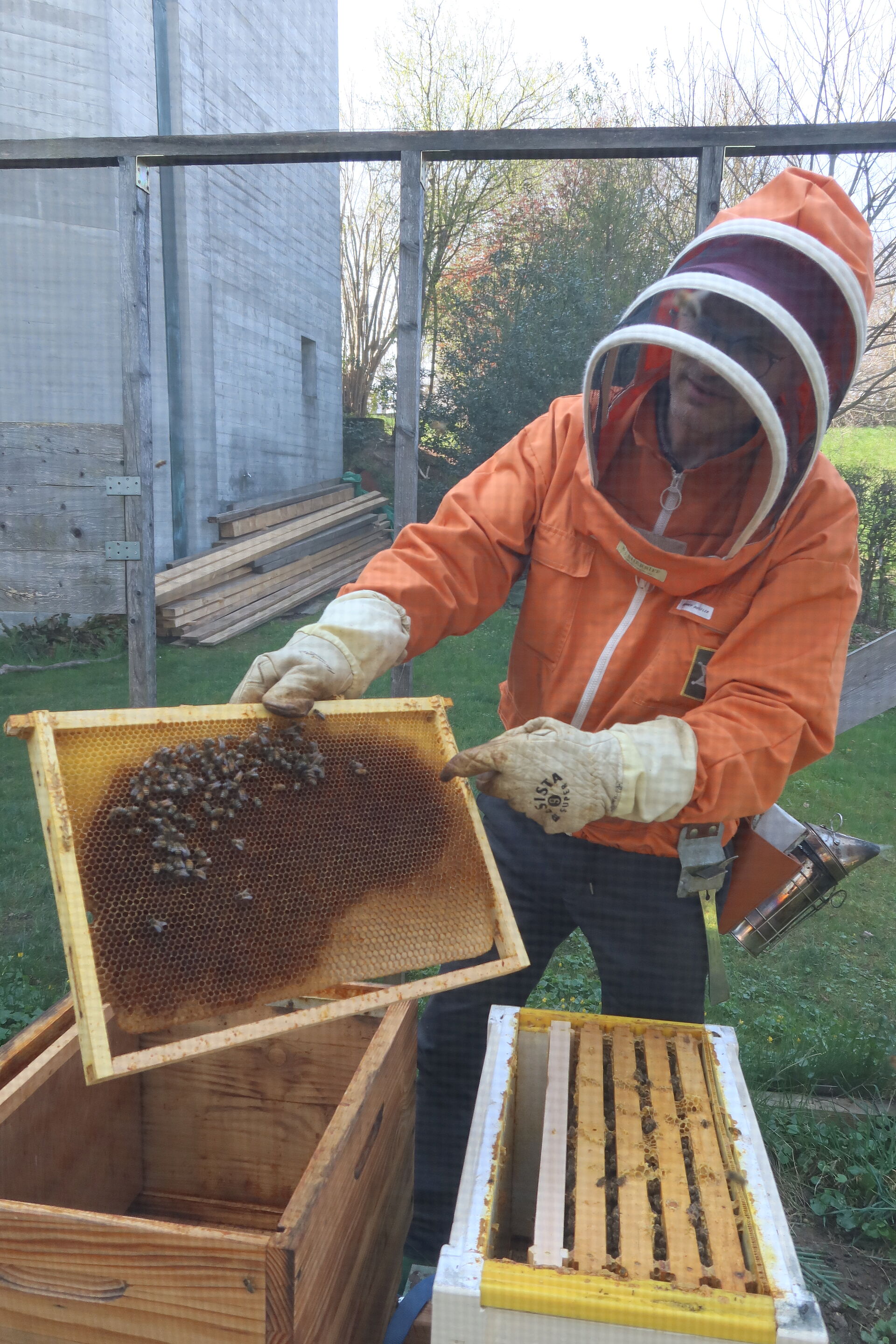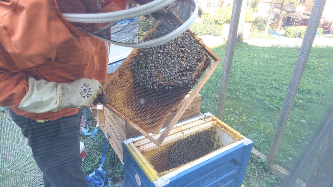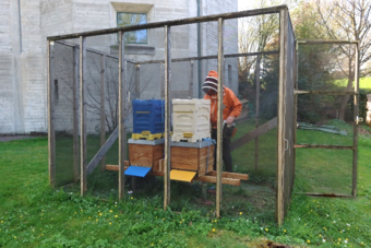 Der Frühling ist in vollem Gange und damit auch die Aktivitäten unserer unverzichtbaren Insekten. Es freut uns sehr, dass wir seit kurzem zwei neue Bienenvölker am Bienenstandort in unserem Quartier Garten beheimaten dürfen.Ich treffe unseren neuen Imker, Rolf Simmen, an einem sonnigen Nachmittag. In der Nacht hat er die Bienen bereits in Transportboxen an ihren neuen Standort hinter der Kirche St. Michael gebracht. Nun geht es darum, sie wieder in ihre „Wohnboxen“, die Holzbeuten, umzusiedeln.Es herrscht bereits reger Flugverkehrt und die Bienen merken, dass Rolf etwas mit ihnen vor hat. Mit einem speziellen Kräuter-Rauch beruhigt er seine Schützlinge und sie lassen ihn vertrauensvoll machen.In den nächsten Tagen werden sich die Neuankömmlinge erstmal an ihre neue Umgebung gewöhnen müssen – auch daran, dass ihre Flugbahn zuerst nach oben aus dem Gitterhaus führt. Das wird allerdings nicht lange dauern, meint Rolf.