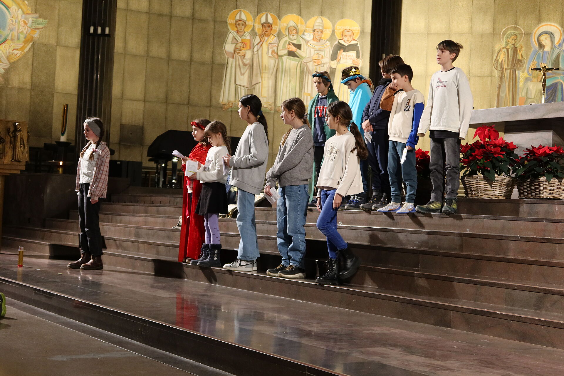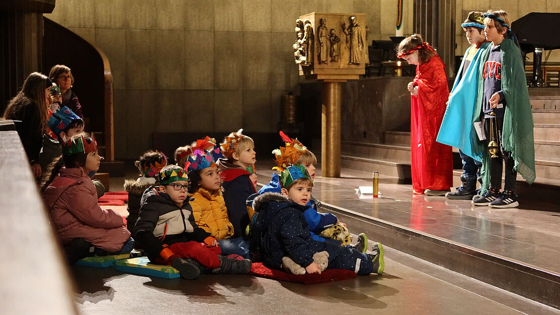Es kamen zum Basteln einige Familien mit ihren Kindern. Unter kundiger Anleitung der Spielgruppenleiterin Nicole Schindler entstanden viele bunte und glitzernde Kronen. Geschichten verkürzten das Warten auf den Stern. Die Religionslehrerin Sara Esposito studierte mit ihrer Klasse die Geschichte der drei Könige ein. Sie und ein Stern holten alle Kinder mit ihren Begleitpersonen ab und alle folgten dem Stern in die Kirche. Dort erwarteten die kleinen und grossen Besucher und Besucherinnen ein Chor und zwei Erzählerinnen. Gespannt empfingen sie die drei Könige, die gleich drauf in die Kirche traten. Die Kinder staunten ob der Geschenke, die die Könige dem Jesuskind brachten und durften durchs Fernrohr schauen. Bei Dreikönigskuchen und Tee fand ein fröhlicher Anlass sein Ende.