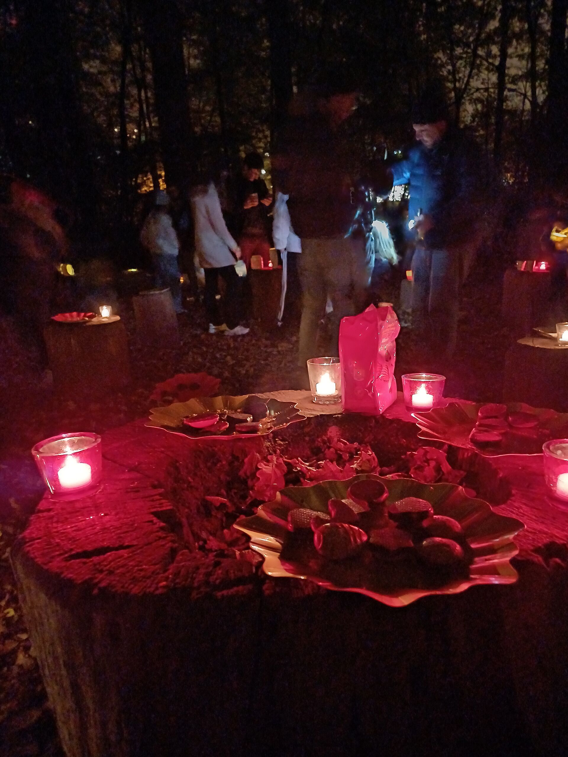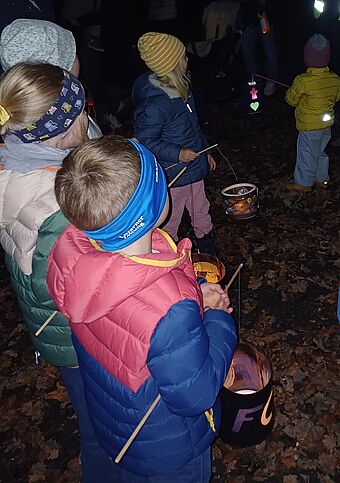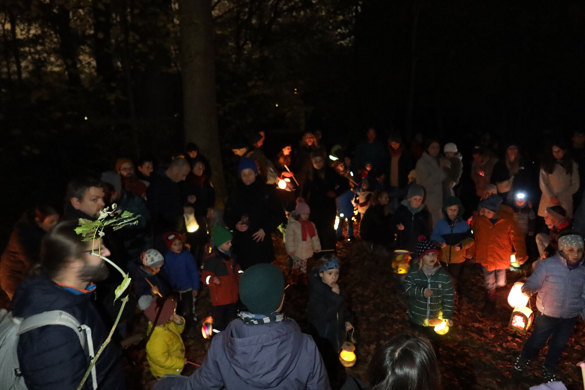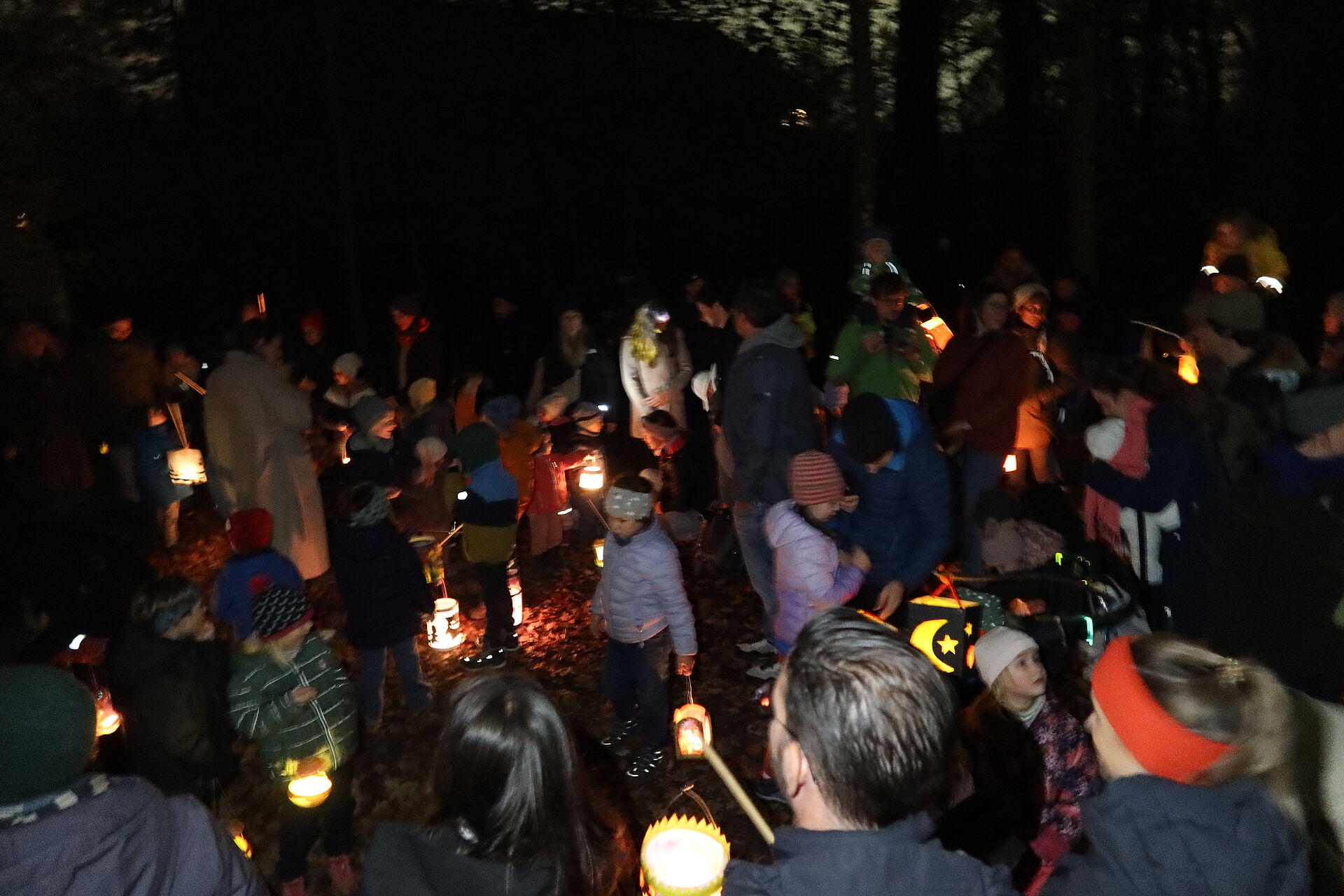 Nach einer musikalischen Einstimmung mit dem Blockflöten-Duo Siggi und Marie ging der Umzug los, übers Freigleis bis ins Eichwäldli. Dort, im dunklen Wald, kamen die schönen Muster der Räbeliechtli und der Laternen noch viel besser zur Geltung. Wie schön das aussah, die lange Lichterkette, die sich langsam durch den Wald bewegte.