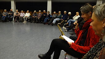 Ergänzt wurden die Erzählungen mit ausgewählten Gedichten u.A. von Hilde Domin, Rainer-Maria Rilke: Worte, welche die Gefühle verdichten und dadurch zugänglich machen. Es waren viele Worte an diesem Abend, aber keines zu viel. Unterbrochen wurde das gesprochene Wort von Mathias Dilliers eindrücklicher Improvisationskunst mit dem Saxophon. Mit viel Einfühlungsvermögen interpretierte er das Gesagte auf überraschende und neuartige Art und Weise. Wer hätte zum Beispiel gedacht, dass sich die letzten Atemzüge eines Menschen mit diesem Instrument derart plastisch nachempfinden lassen?