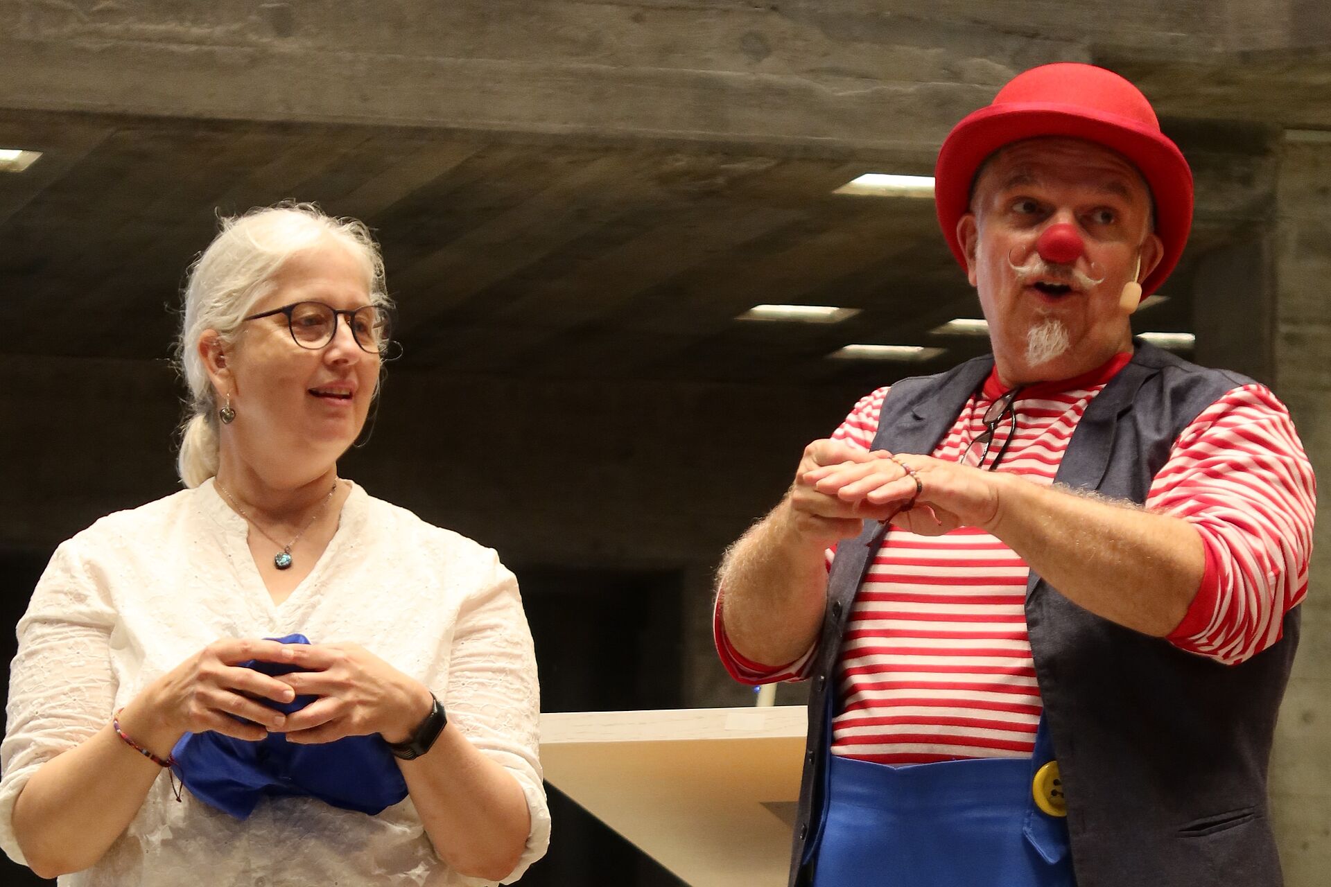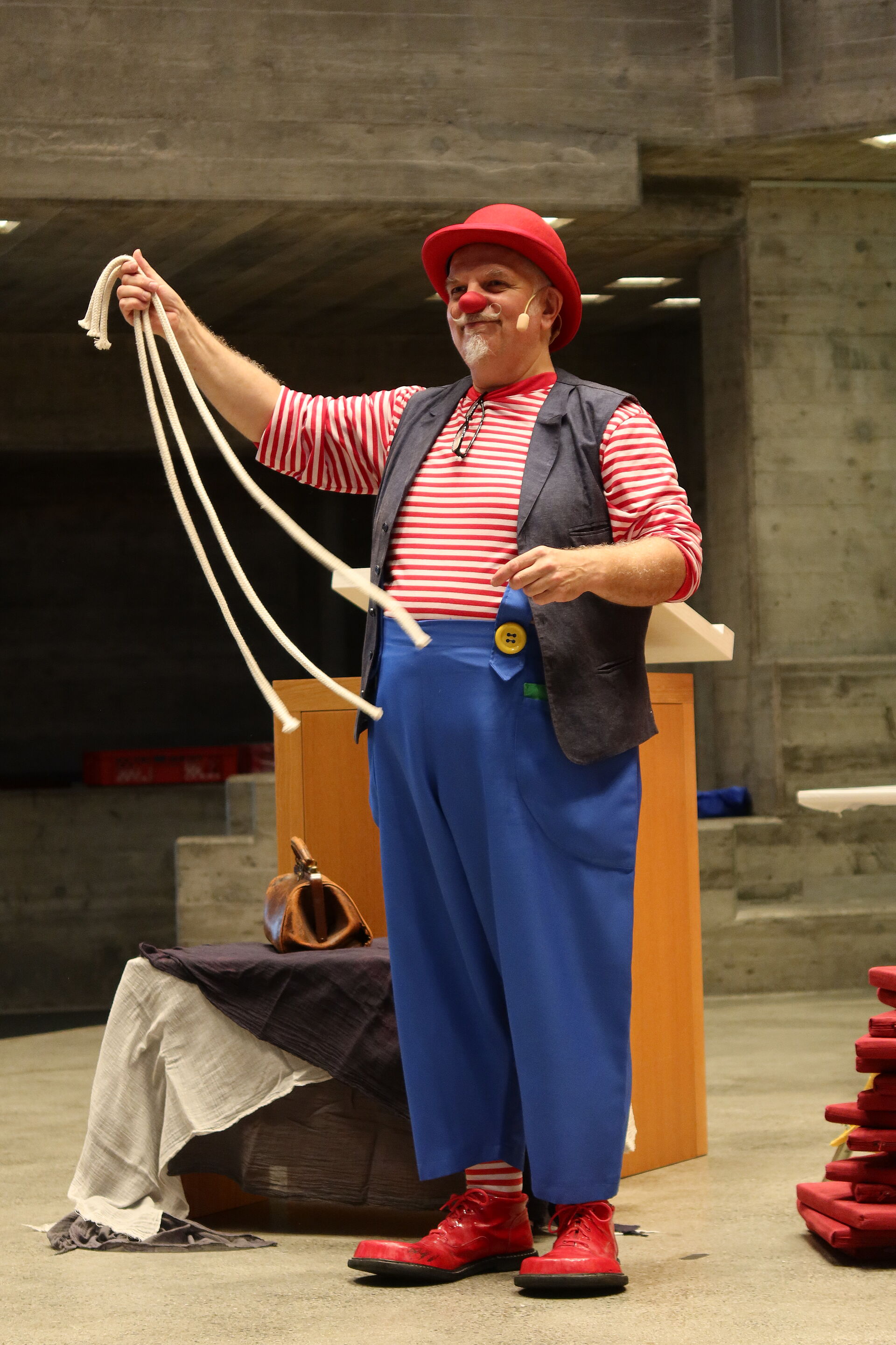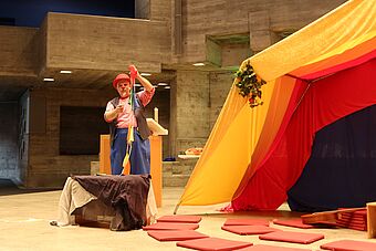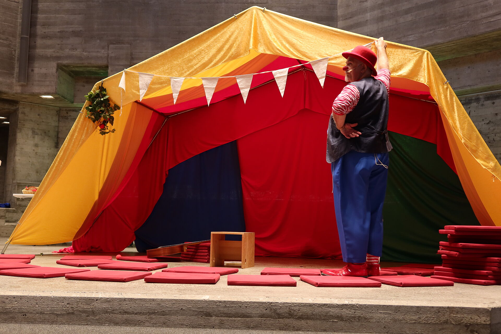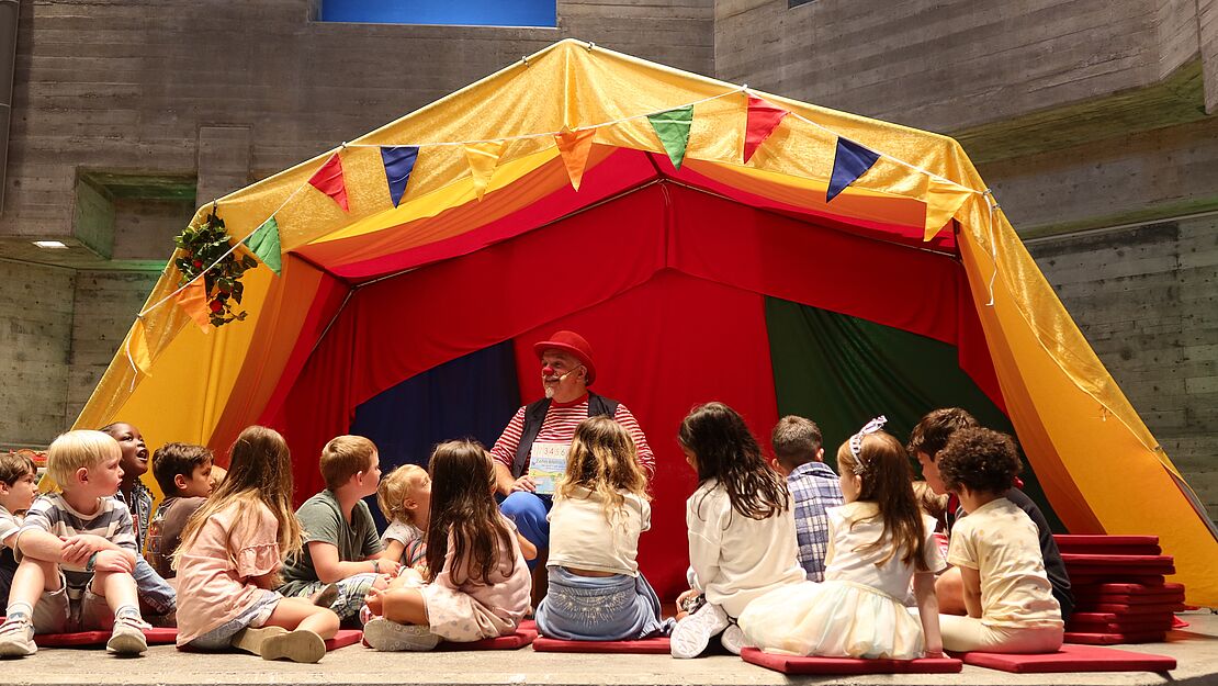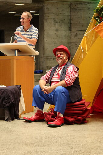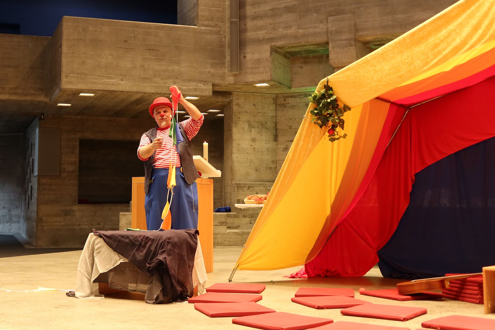 In der Bibelgeschichte hörten wir von Moses und den Israeliten, wie sie gemeinsam ein Zelt für Gott nähen. Gemeinsam und in Freundschaft lässt sich grosses erreichen. Passend zum Schulbeginn hat uns auch Clown Fidibus diese Botschaft in humorvoller Art vermittelt.