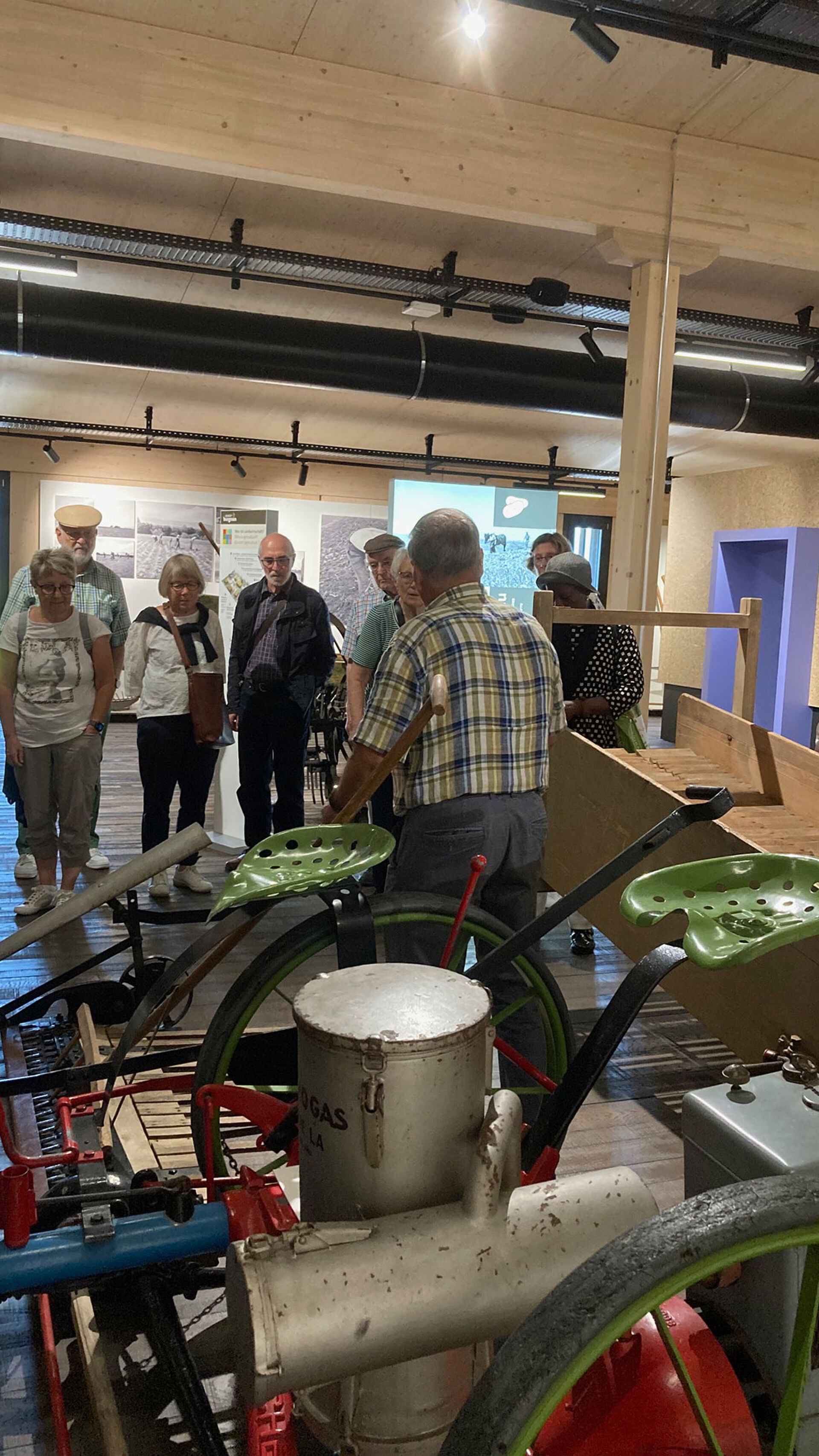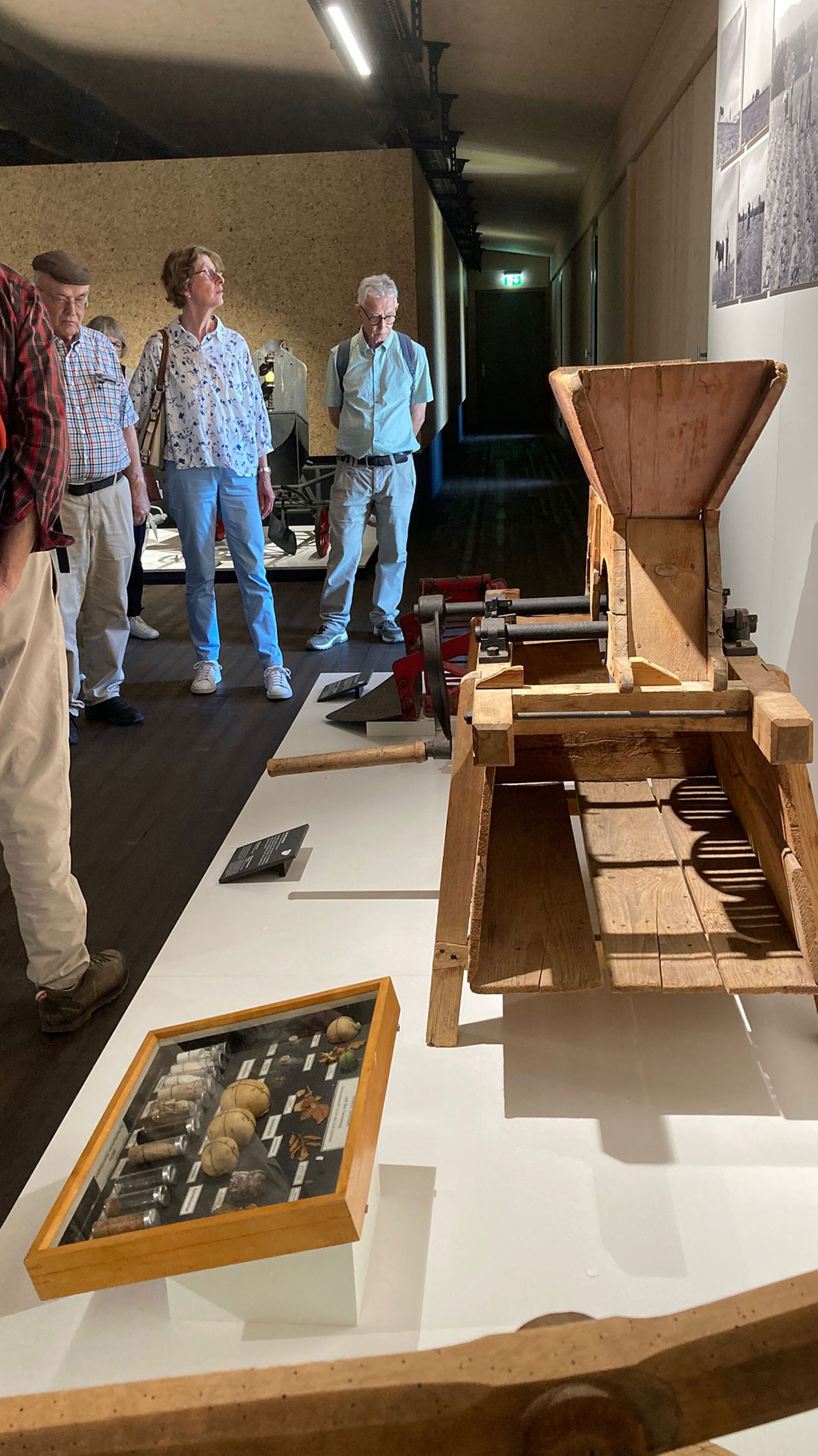 Als erstes wird uns ein Film präsentiert, welcher die Entwicklung der Landwirtschaft seit den Anfängen aufzeigt. Im Ausstellungsteil werden uns verschiedene Themen wie der Boden als Grundlage für die Landwirtschaft, die Gefahren für die Biodiversität und die Herausforderungen durch die globale Wirtschaft vor Augen geführt. Daneben weist unser Leiter immer wieder auf einfache Geräte und «Erfindungen» hin wie eine Kartoffelsetzmaschine oder eine Kartoffelausgrabmaschine oder eine Sense mit einer Halterung für die Ähren. Am Beispiel einer Vorrichtung zum Quetschen von Mostobst zeigte er auf, wie früher die ganze Familie von Klein bis Gross in den Arbeitsprozess eingeteilt wurde. Zum Abschluss seiner Führung gab er uns ein paar selbstkritische Gedanken mit. Am Beginn seiner aktiven Bauernzeit, ging es vor allem darum, die wachsende Bevölkerung zu ernähren. Die Steigerung der Produktion war das Motto. Dabei habe man gewisse Themen wie Biodiversität und Schonung des Bodens und des Wassers zu wenig berücksichtigt.