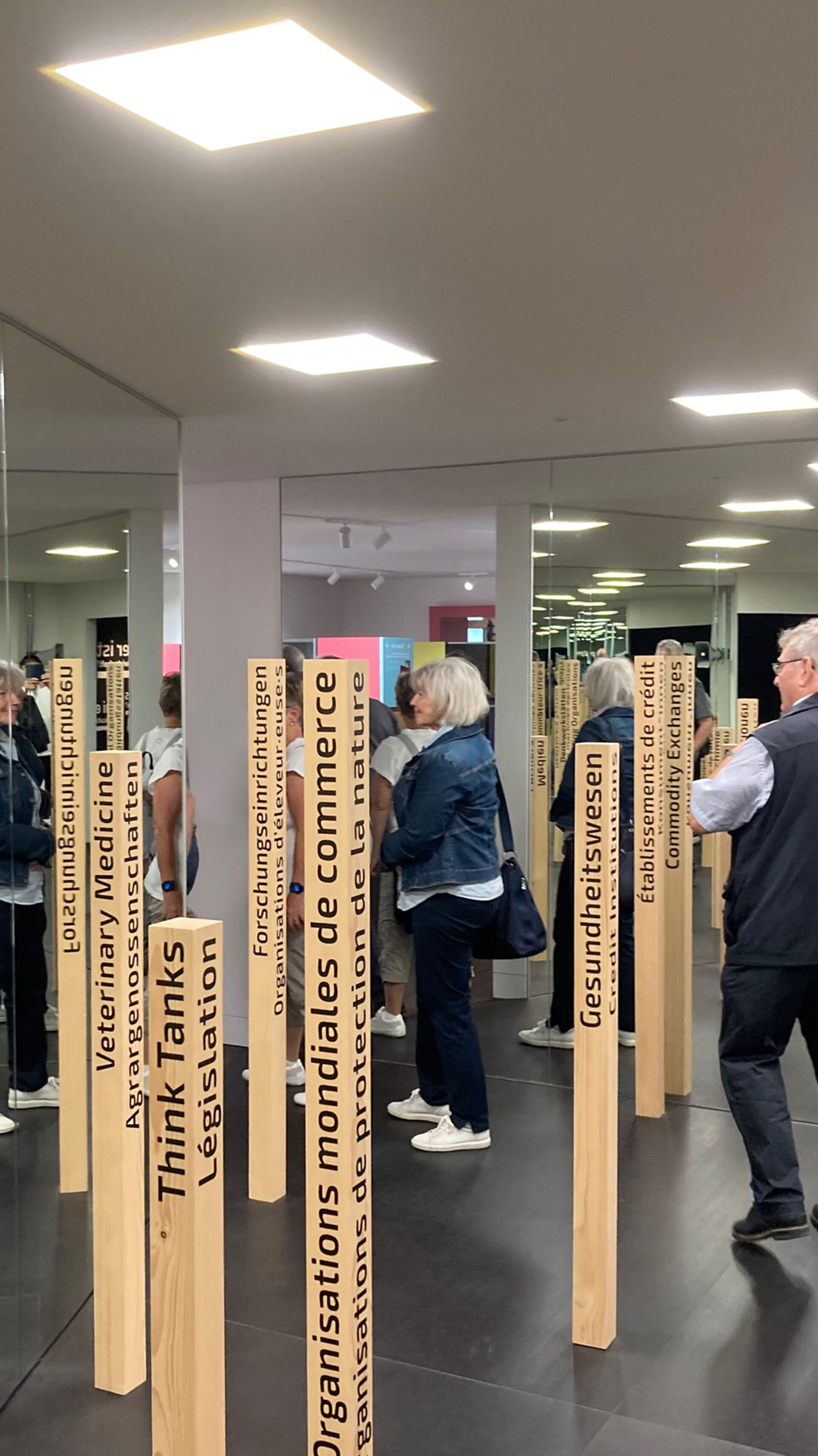 Dieser erklärte kurz seinen beruflichen Werdegang auf verschiedenen Bauernhöfen bis zum eigenen Hof in Luthern. Dann umriss er, wie er seine Führung vorgesehen habe: Er möchte sich auf die interaktive Hauptausstellung «Was ist Landwirtschaft» beschränken. Diese zeigt anhand von einem Dutzend Themen die Entwicklung einer nachhaltigen Produktion von Lebensmitteln mit Fotos, Grafiken und historischen Objekten. Dazu sind auf Tablets noch viele weitere Details abfragbar. Er bat uns aber, diese Einblicke auf später, nach der offiziellen Führung, zu verschieben. Auch die Ausstellung in den weiteren Gebäuden: die Remise mit der Sammlung landwirtschaftlicher Geräte und das alte Bürgerheim mit Ausstellungen zu den Themen Bienen, Foodwaste und Spanschachteln können anschliessend individuell besichtigt werden.