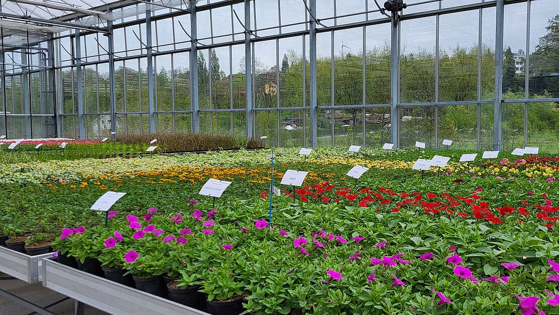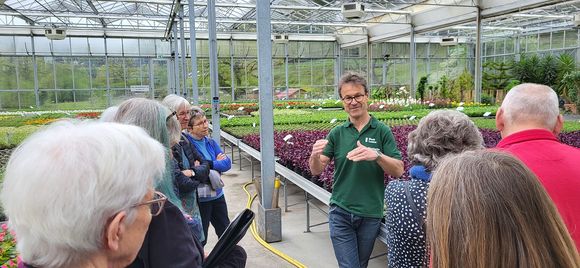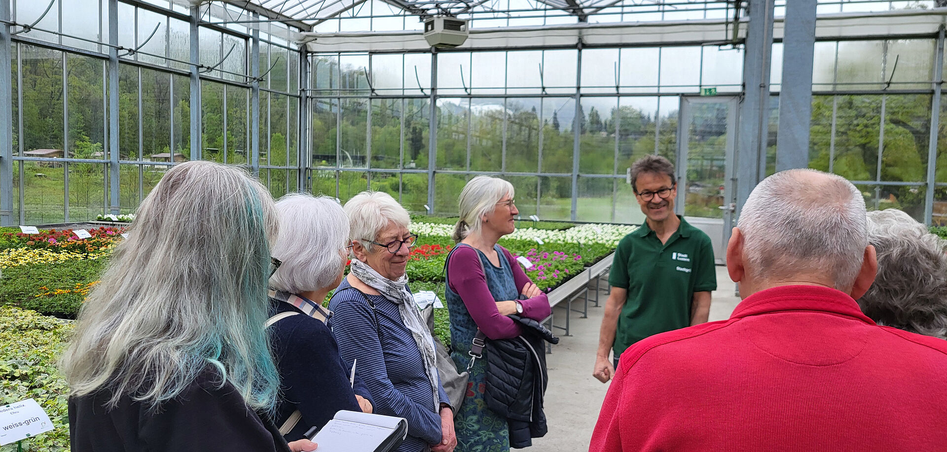 Die Temperaturen waren eher winterlich, als die Gruppe den Spaziergang in den Landschaftspark und zur Stadtgärtnerei machte. Umso angenehmer war es, sich in den dortigen Gewächshäusern die frisch gezogenen Blumen anzuschauen und viele Informationen zum biologischen Anbau und zur biologischen Schädlingsbekämpfung zu bekommen. Auch für Hobbygärtner:innen gab es vielfältige, nützliche Tipps. Beeindruckt von der kreativen und experimentierfreudigen Arbeit bei «Stadtgrün» genossen wir zum Abschluss einen Kaffee mit Ausblick auf überwinternde Palmen.