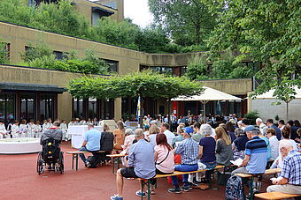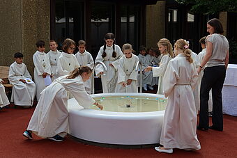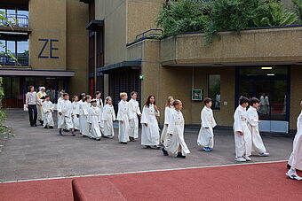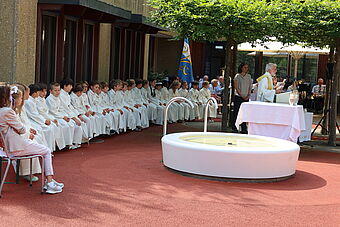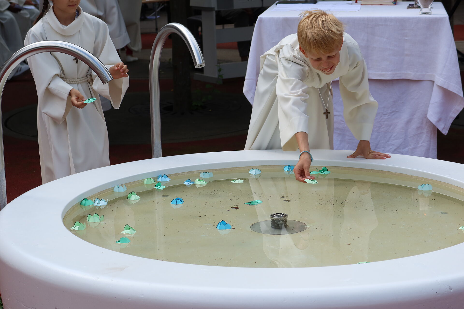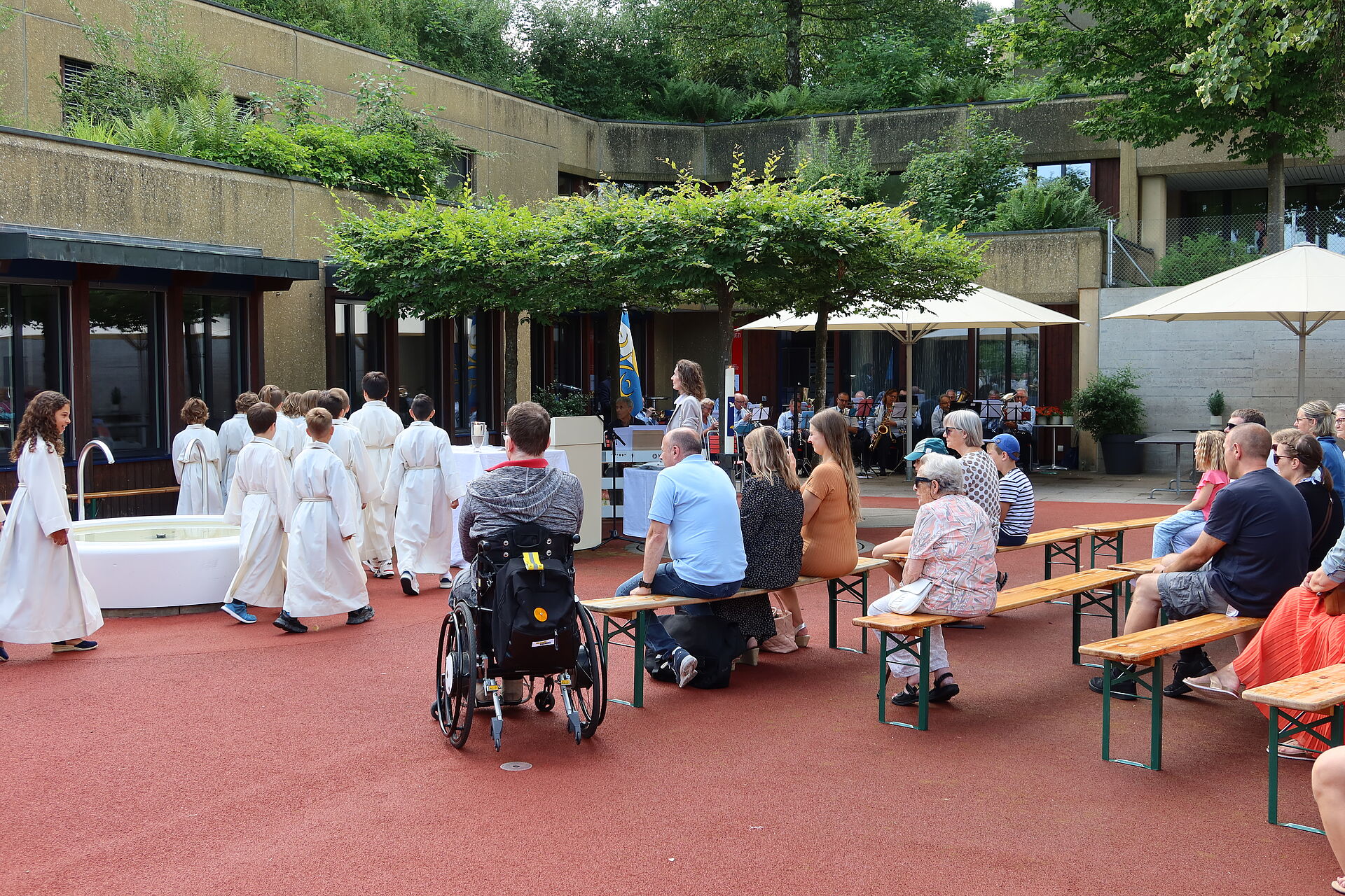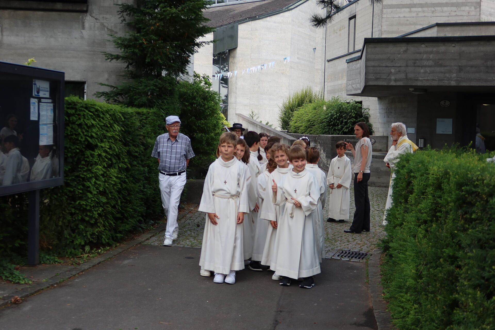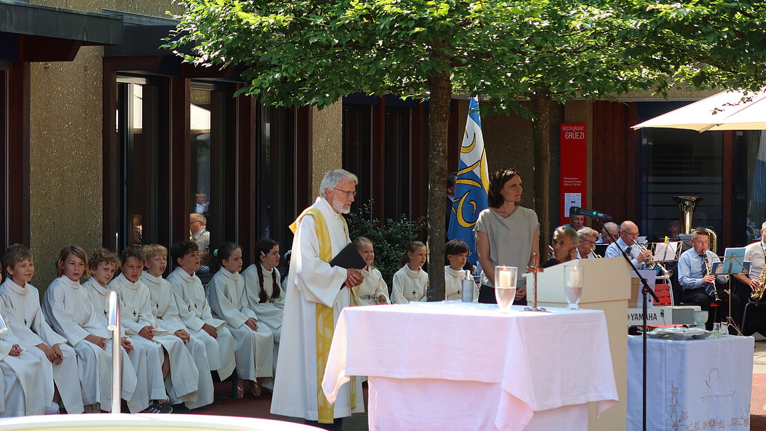 Zu Fronleichnam kamen die diesjährigen Erstkommunion-Kinder noch einmal zusammen. Der Gottesdienst konnte bei schönem Wetter auf dem Rodten Platz der Stiftung Rodtegg durchgeführt werden. Für die musikalische Begleitung sorgten die Musikantinnen und Musikanten der VBL-Musik.