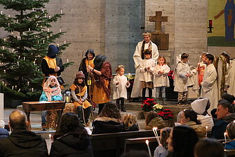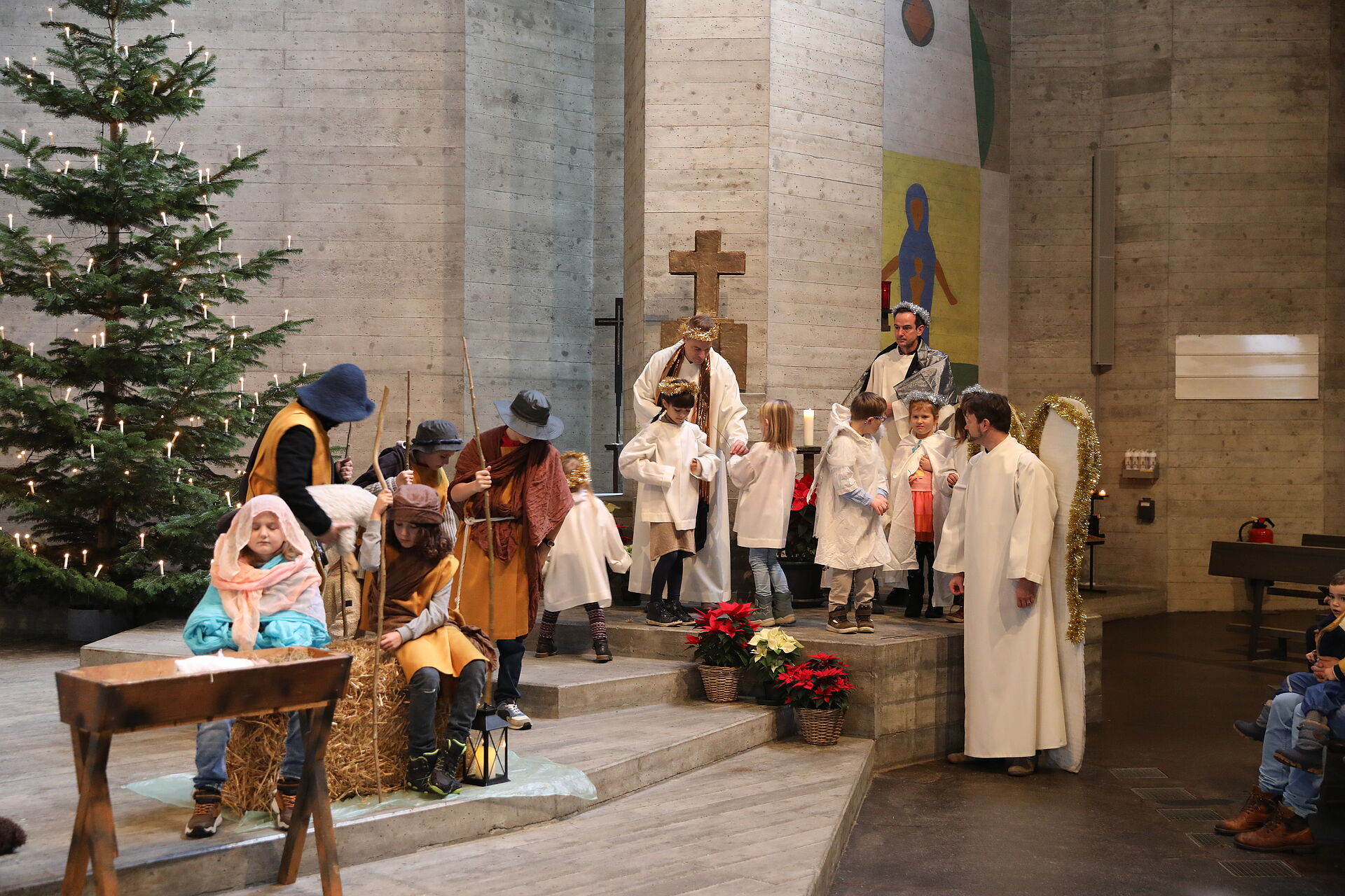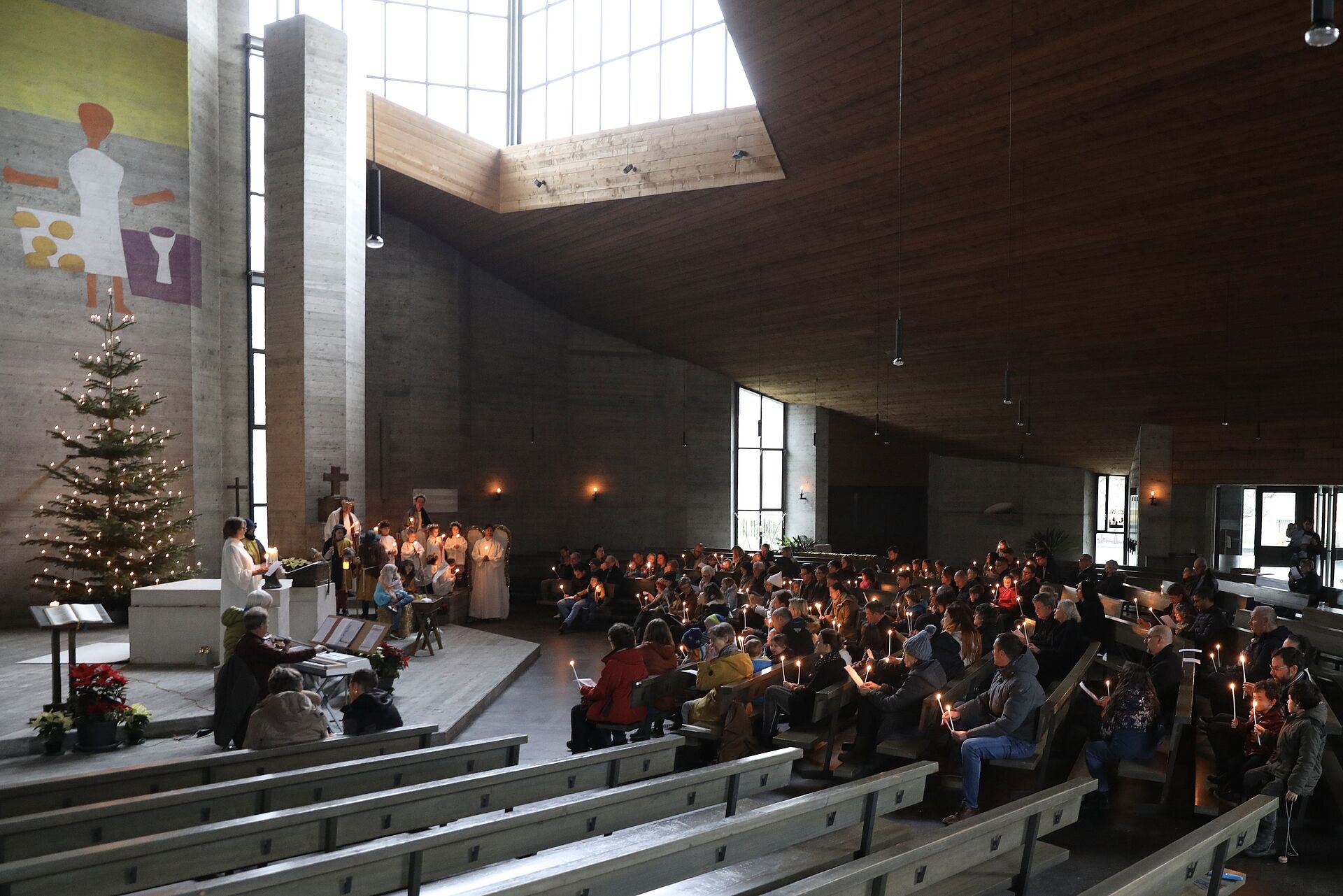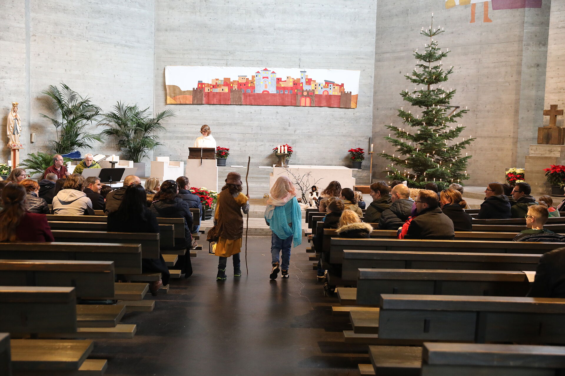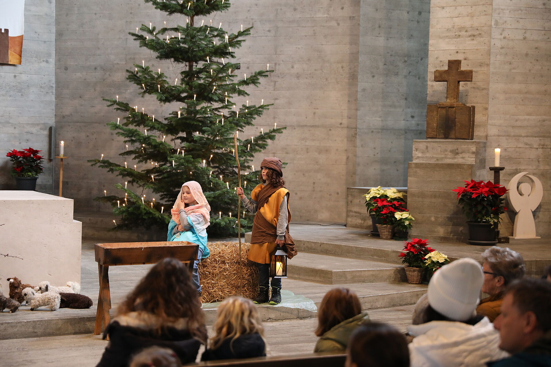 Viele Kinder und Eltern spielten an der Mitmachkrippenfeier die Weihnachtsgeschichte nach: Maria und Josef gingen ihren Weg, die Hirten kamen zum Stall, die Engel verkündeten eine grosse Freude. Die weihnächtlichen Lieder und der Kerzenschein brachten eine schöne Stimmung in die Kirche St. Michael.