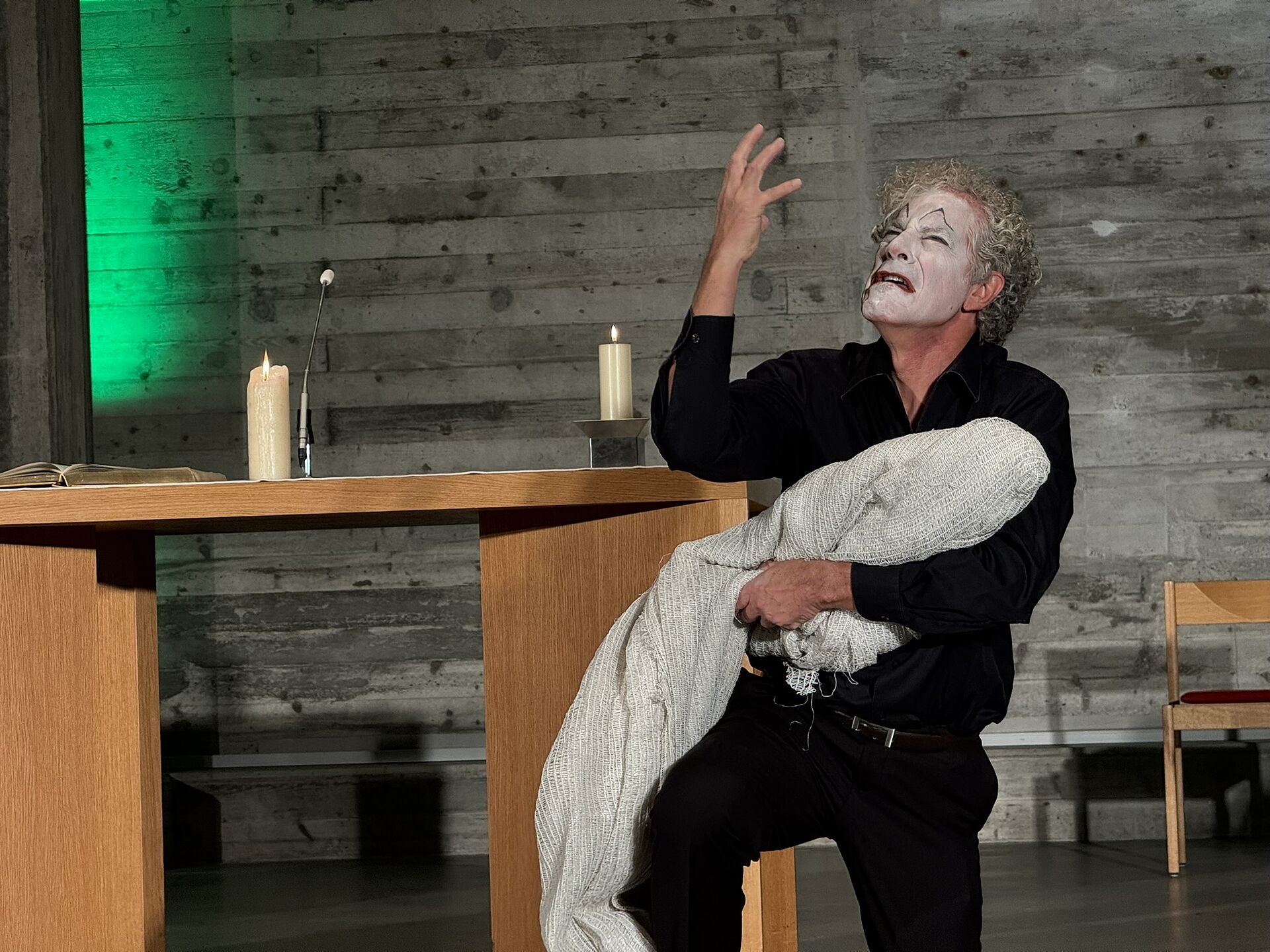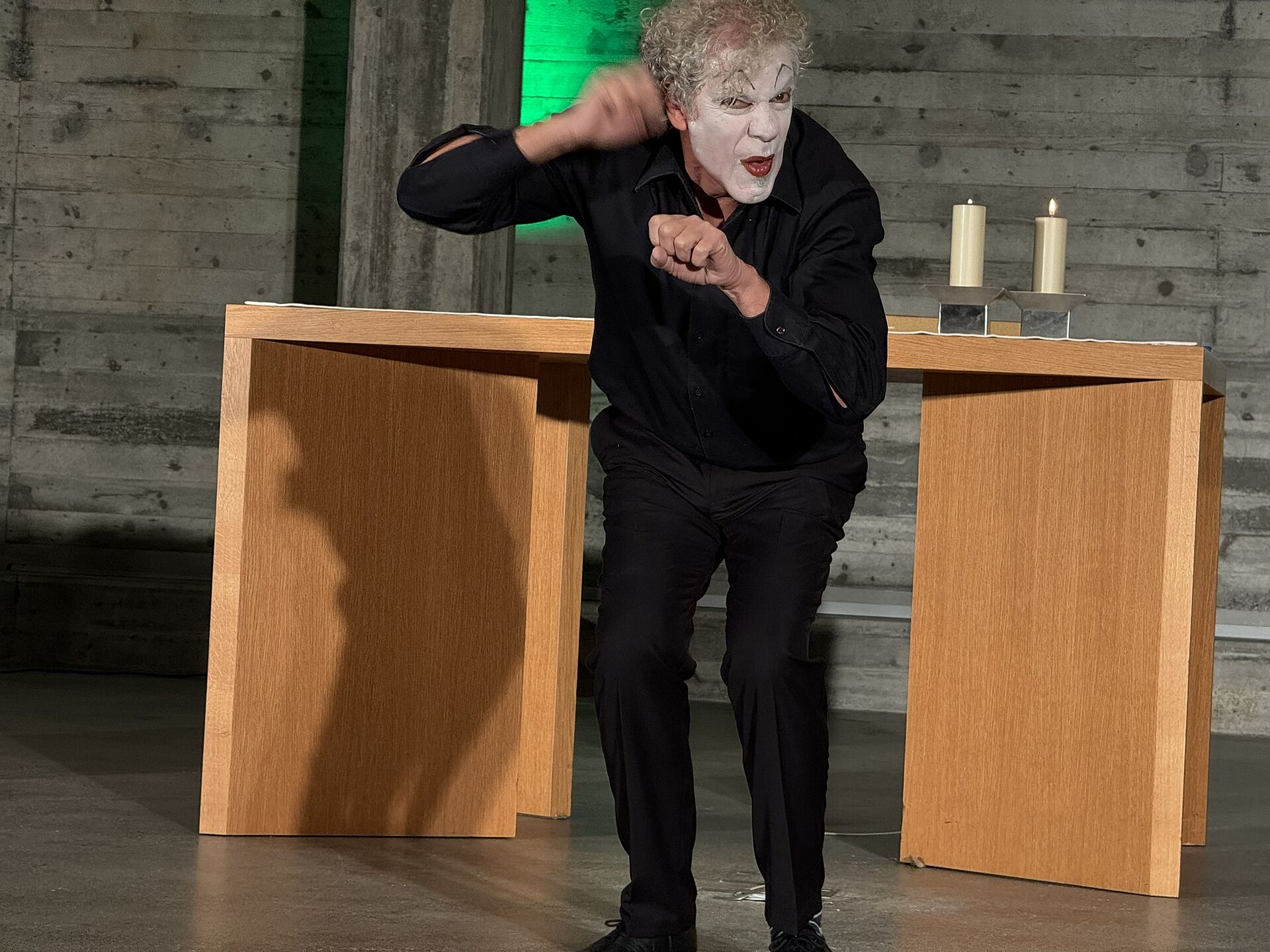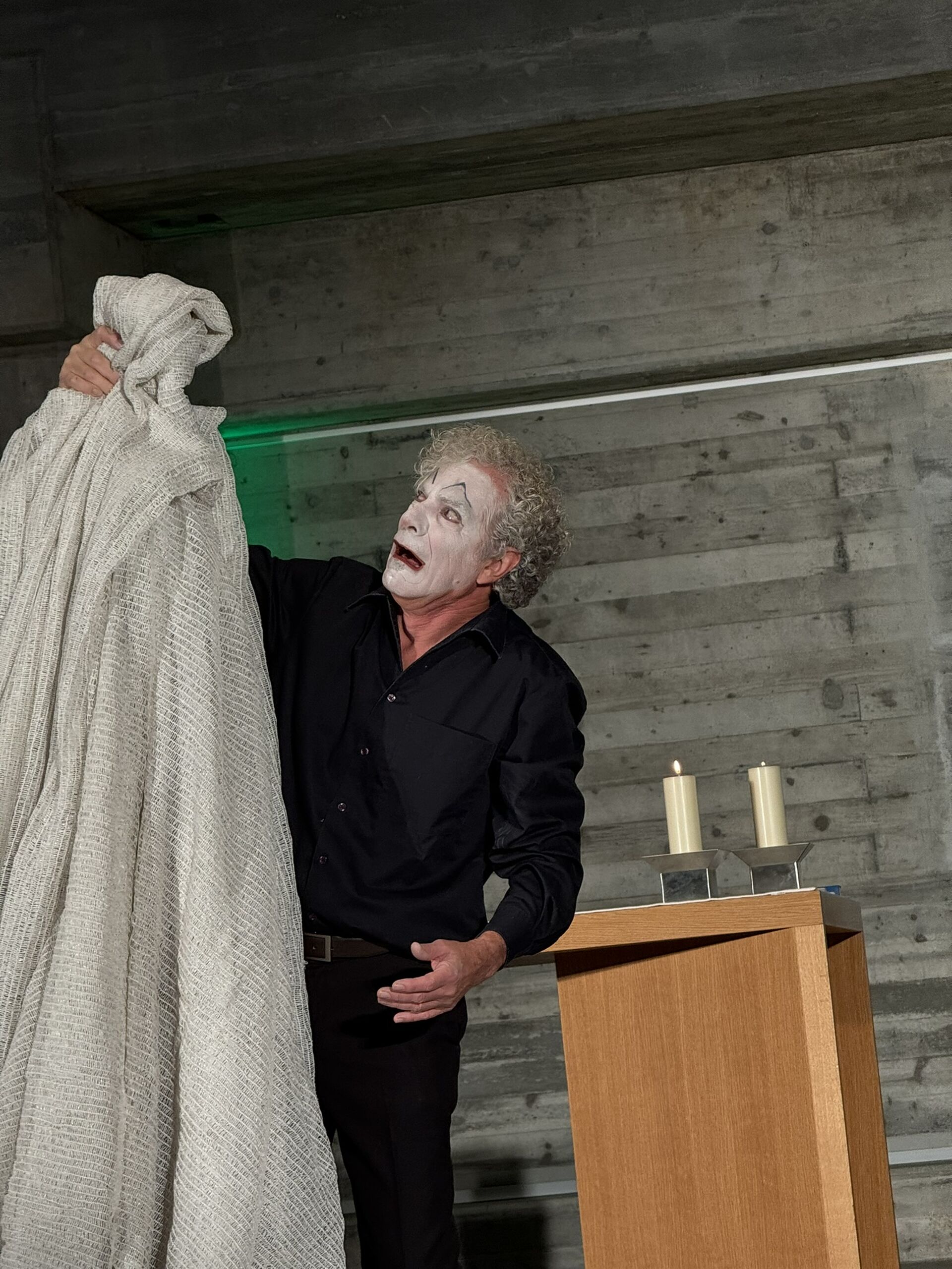 Die Erschaffung der Welt und des Menschen, das menschliche Leben von der Geburt bis zum Tod und die Heilung der durch ihr schweres Lebensschicksal gekrümmten Frau wurden den Gottesdienstteilnehmenden sehr anschaulich vor Augen geführt. Die biblischen Texte wurden so neu lebendig und bekamen durch die ausdrucksstarke Körpersprache von Christoph Schwager einen Bezug zum eigenen Leben.
