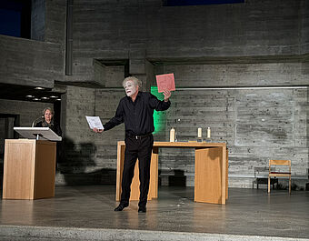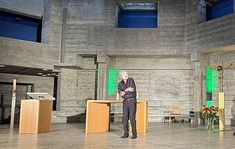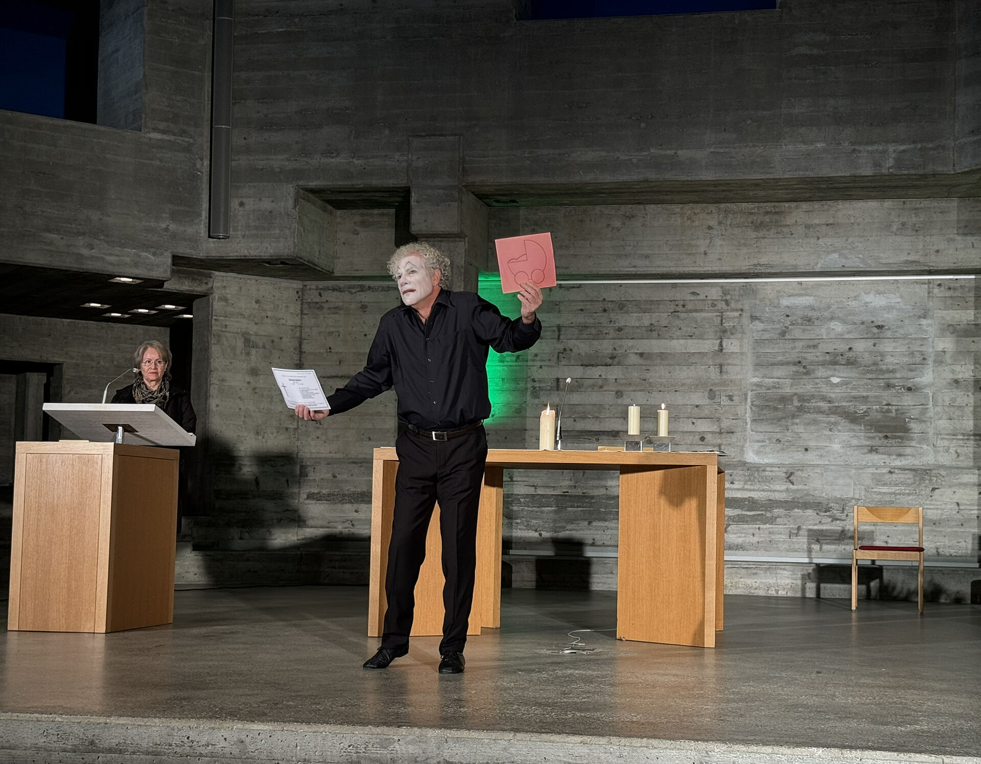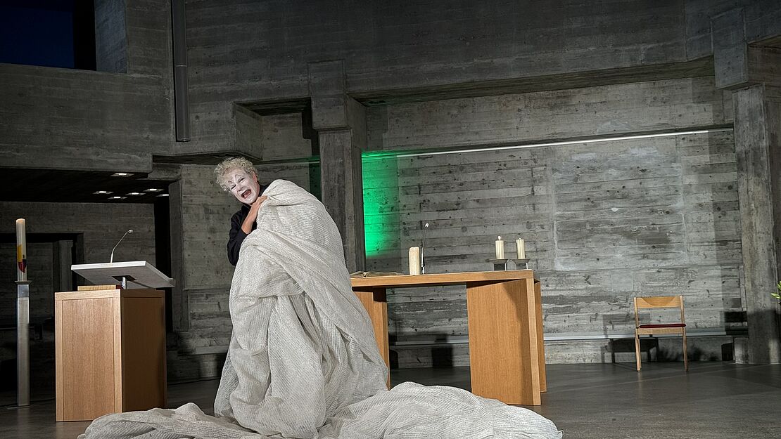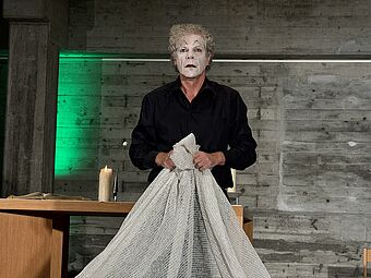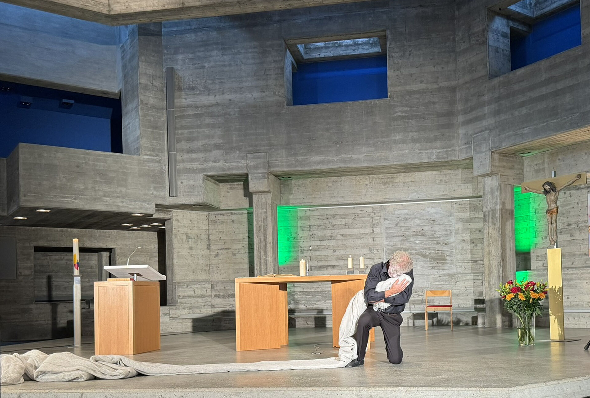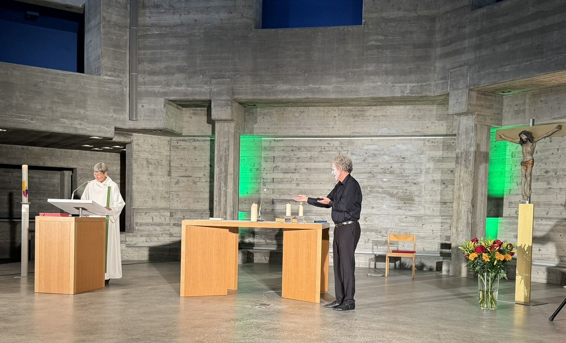 Die Erschaffung der Welt und des Menschen, das menschliche Leben von der Geburt bis zum Tod und die Heilung der durch ihr schweres Lebensschicksal gekrümmten Frau wurden den Gottesdienstteilnehmenden sehr anschaulich vor Augen geführt. Die biblischen Texte wurden so neu lebendig und bekamen durch die ausdrucksstarke Körpersprache von Christoph Schwager einen Bezug zum eigenen Leben.