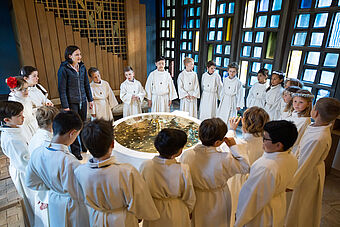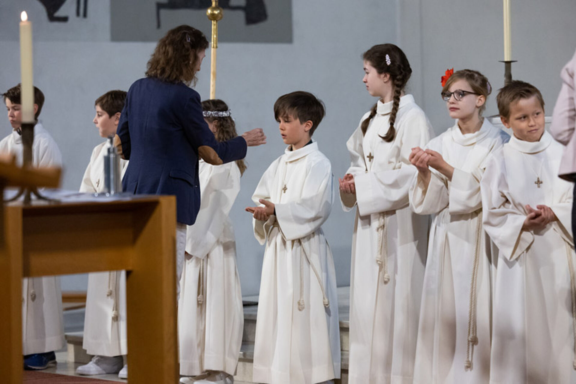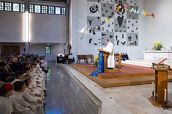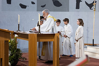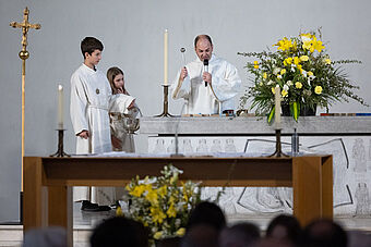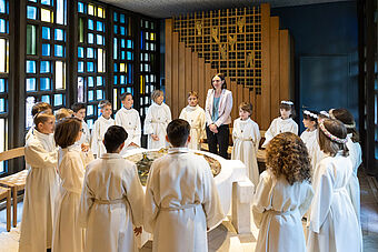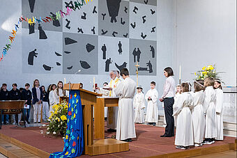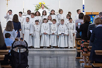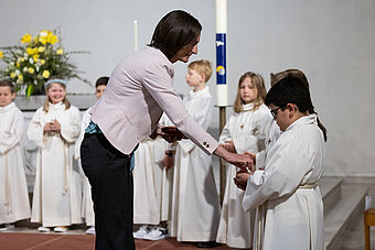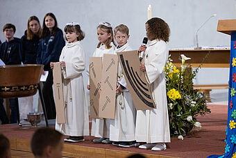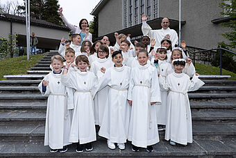 Die Feier des Abendmahls und die Begegnung mit Jesus stand natürlich auch im Zentrum der zwei Erstkommunion-Feiern. Nach dem Hochgebet durch Priester Franz Scherer durften die Kinder zum ersten Mal die Heilige Kommunion empfangen.