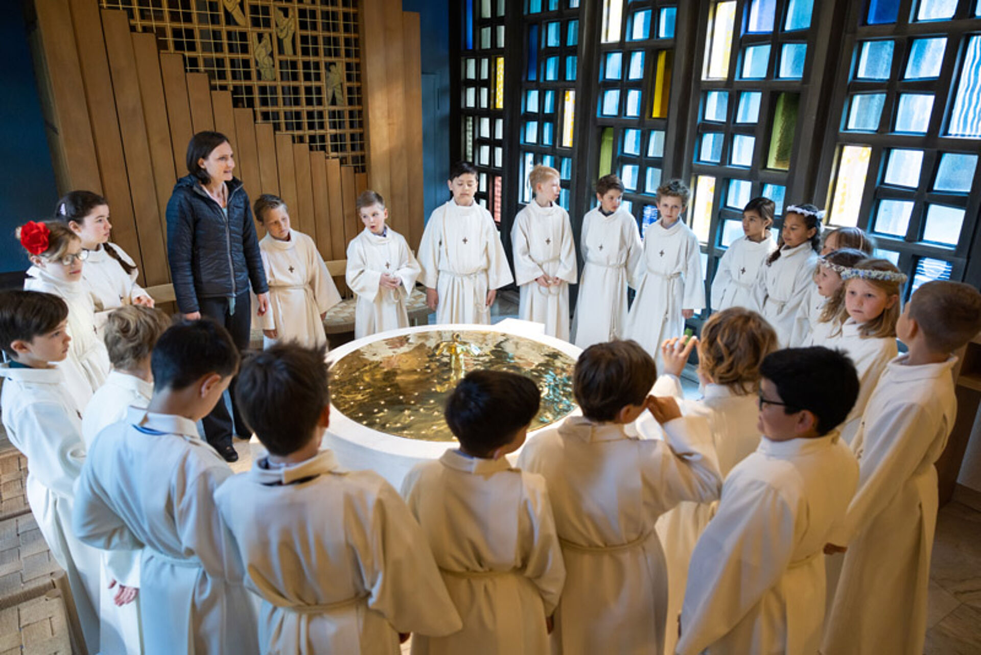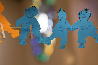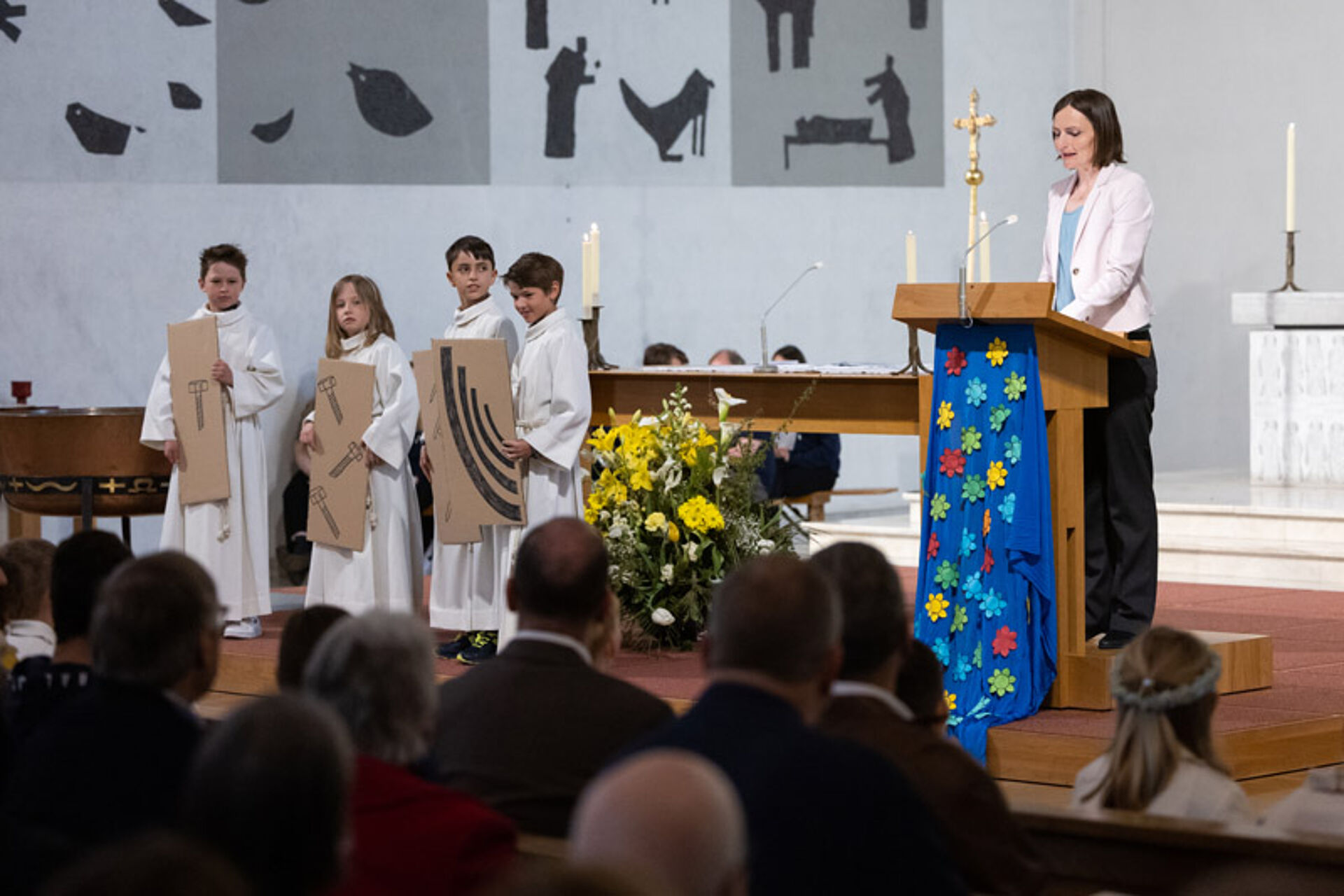 Farbige Menschengirlanden schmücken an diesem Weissen Sonntag die Kirche St. Anton. Die Erstkommunion-Kinder haben sie am Vorbereitungstag gebastelt und die Namen all ihrer Liebsten darauf geschrieben. So entstand eine grosse Menschenkette, in der jedes Glied zählt.