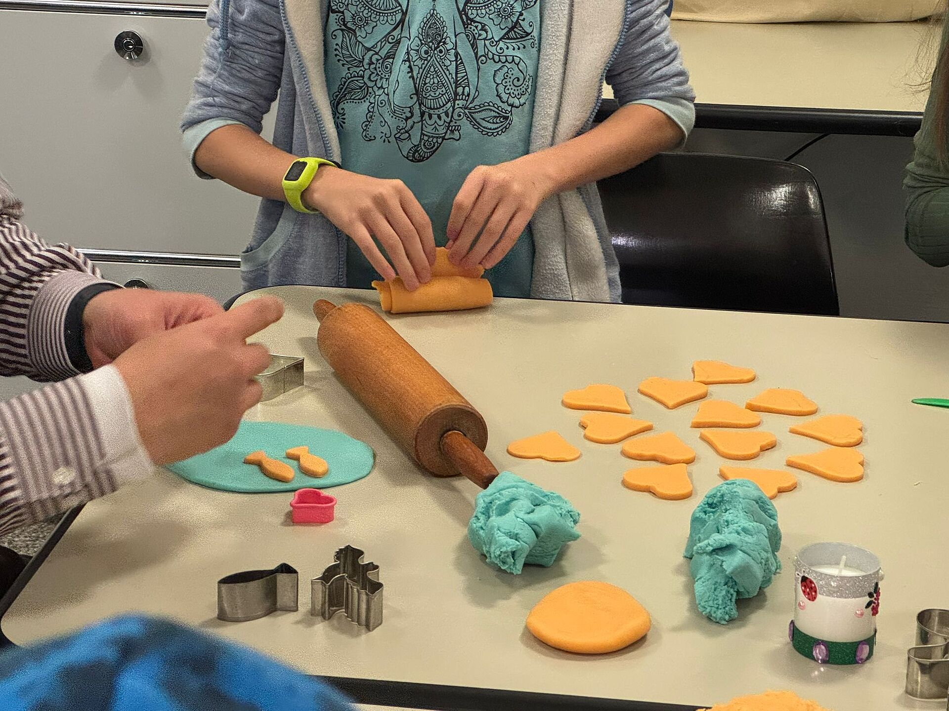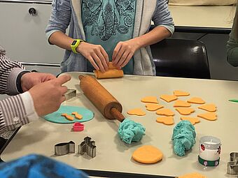 Nach der Geschichte und dem Singen von Peter Räbers "I wünsche dir" ging es in die Ateliers: Hier konnten wir basteln, kneten, Kerzen verzieren, Rücken zeichnen, in Fühlboxen blind Gegenstände erraten, und im Treppenhaus einmal so laut schreien, wie wir konnten. Das war ein Spass! Beim letzten Atelier konnten wir, wie Bartimäus, unsere Herzenswünsche aufschreiben.