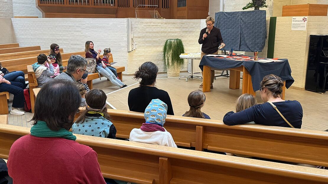 Die Kirche Kunterbunt startete auch an diesem kühlen Novembermorgen mit einem gemütlichen Ankommen bei Kaffee, Sirup und Zopf. Dann ging es in die Kirche Weinbergli, wo wir die Geschichte von Bartimäus hörten. Während dem Lauschen der Geschichte haben wir uns die Augen verbunden - um ganz genau hinzuhören. Denn Bartimäus hatte einen Herzenswunsch: Er wollte wieder sehen können! Und Jesus hat Bartimäus geheilt.