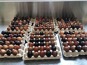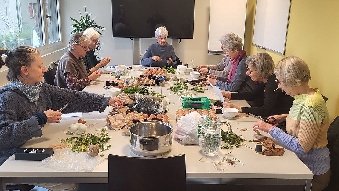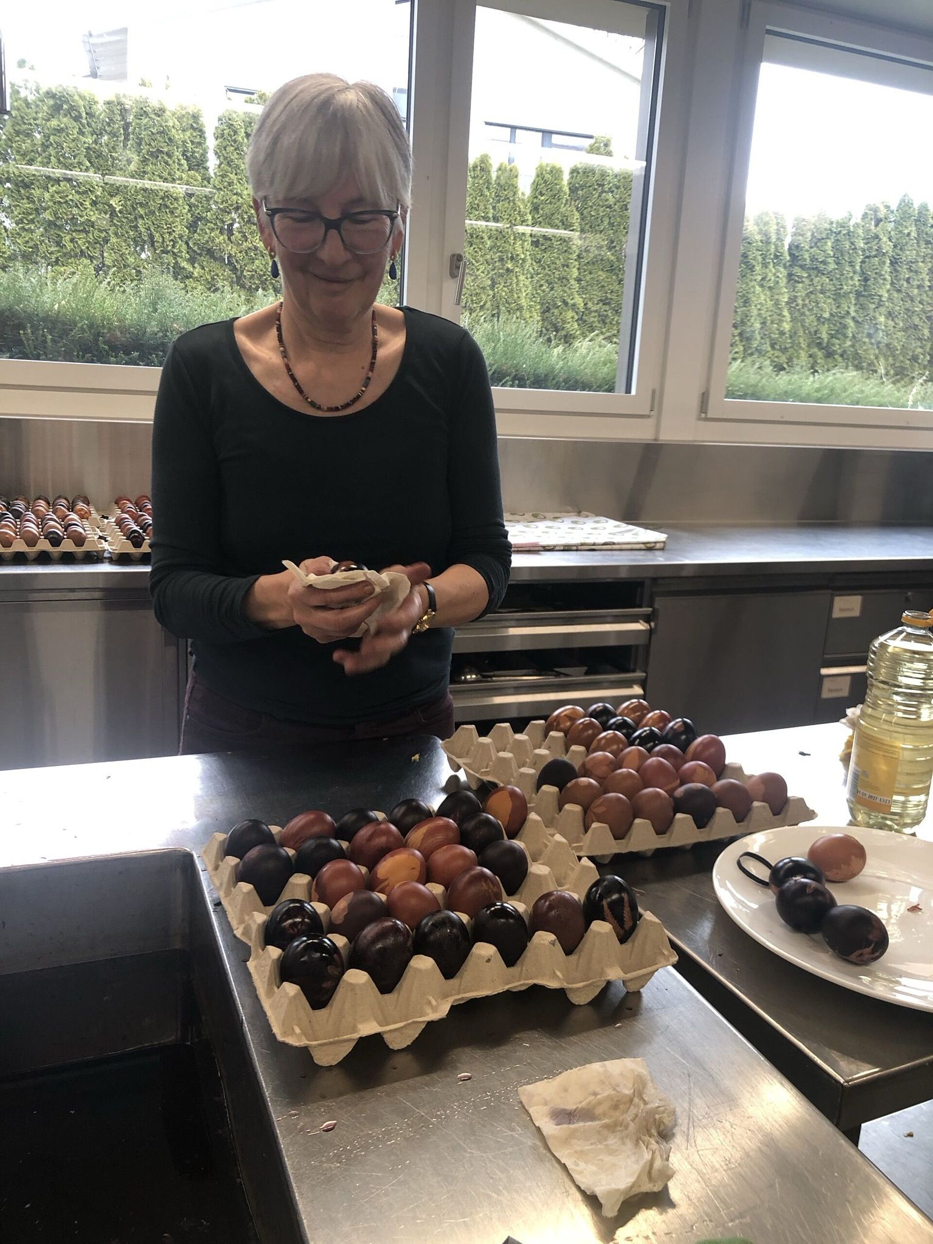 Unsere engagierten Frauen haben mit Kräutern, Zwiebelschalen und viel Geduld wunderschöne Ostereier gestaltet.