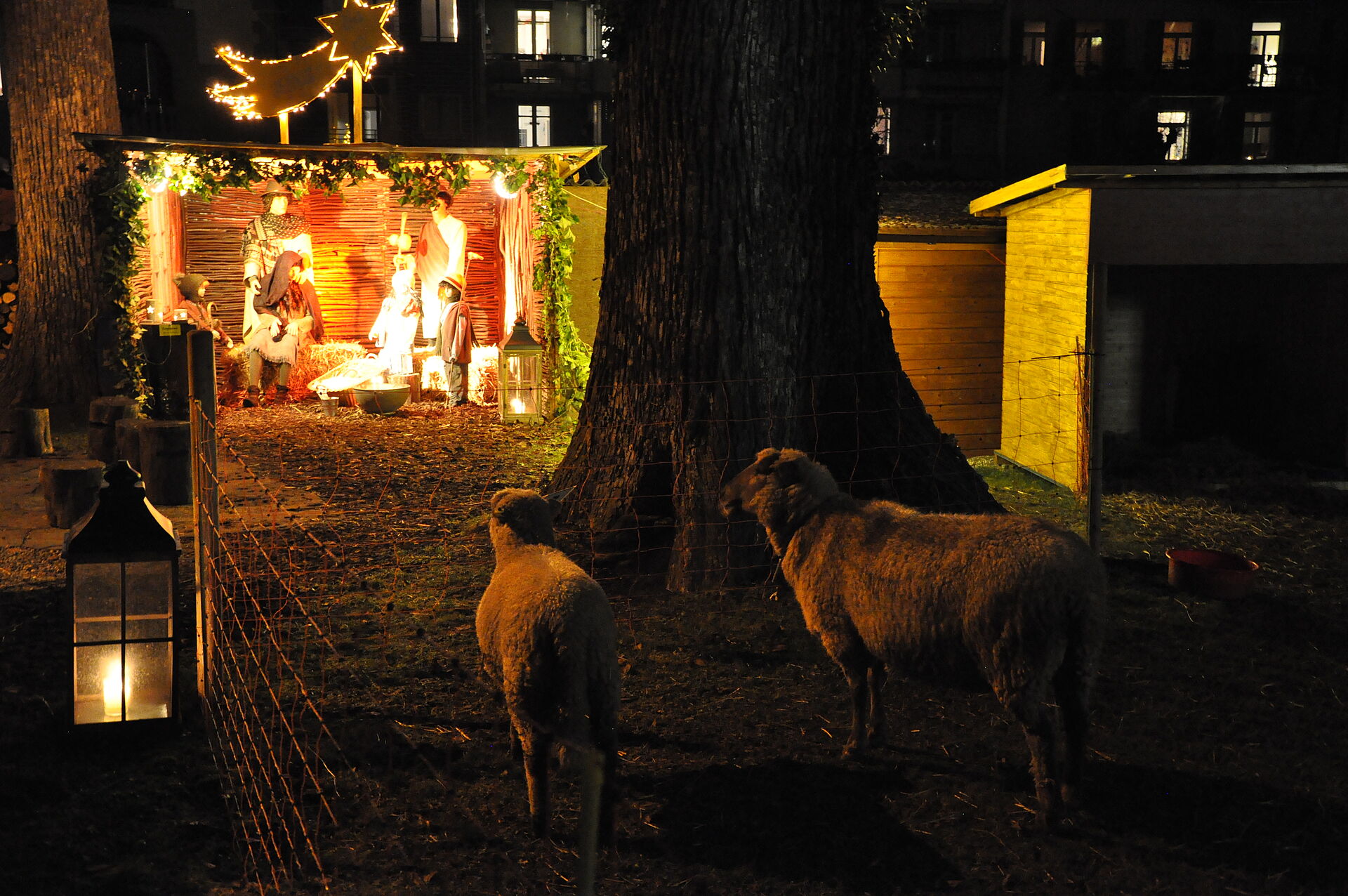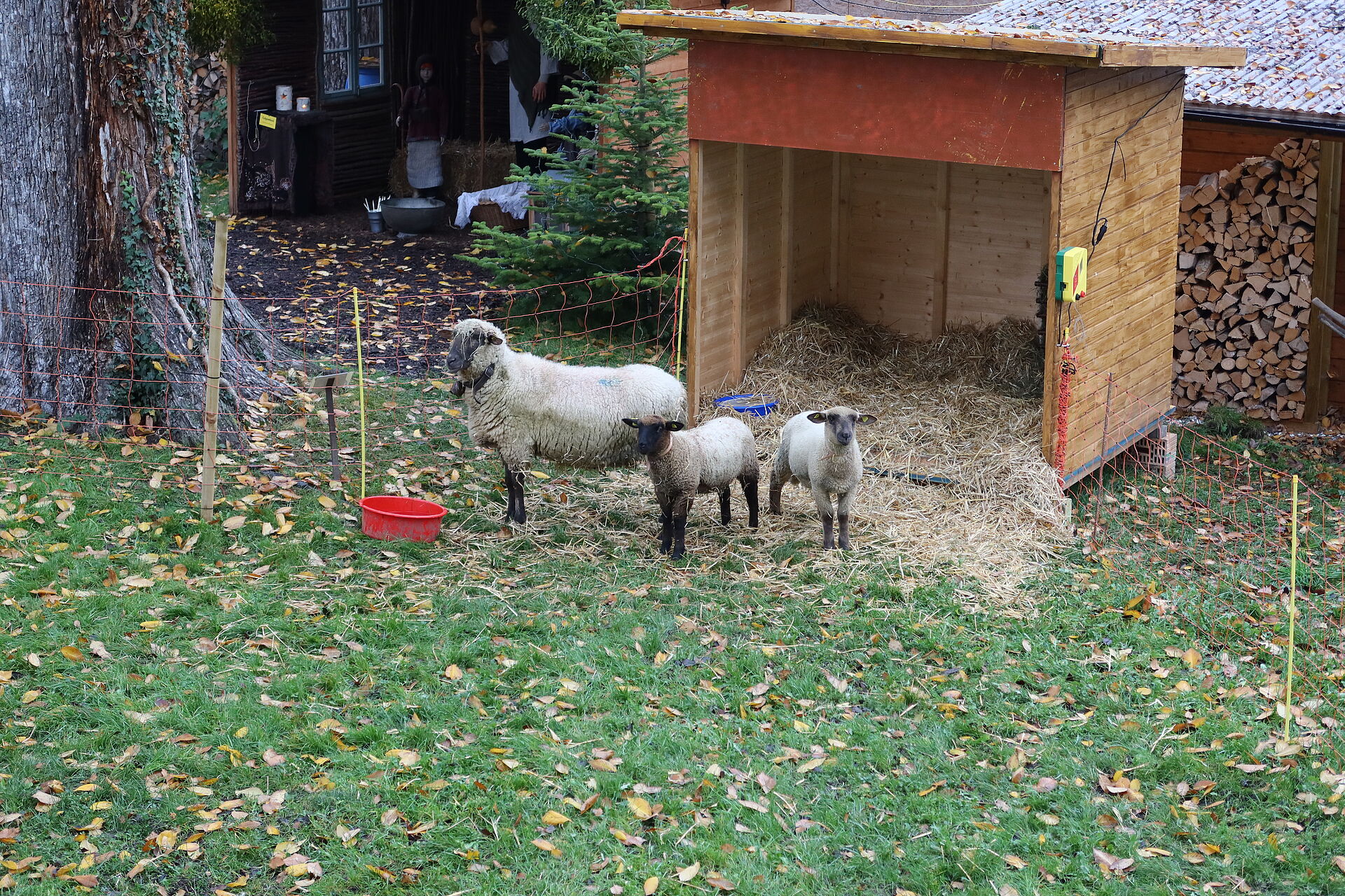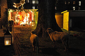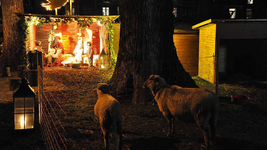 Die Schafe, Mutter Frieda mit Liselotte und Max, freuen sich, von den Besucherinnen und Besuchern mit hartem Brot oder Apfelschnitzen verwöhnt zu werden. Am 24. Dezember erreichen auch Maria und Josef die Krippe und sie wandelt sich von der Hirten- zur Weihnachtskrippe mit dem Jesuskind.