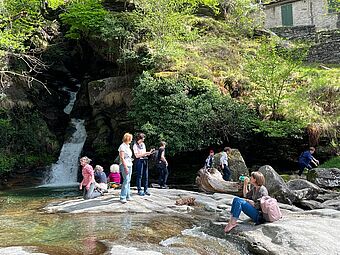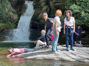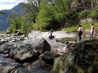 Wir konnten bis zuletzt nicht ahnen, auf welch lauschigem Plätzchen, mit flachen Felsen und zum Baden einladenden Teichen wir antreffen würden. Es blieb genügend Zeit zur Erholung und Entspannung, bis wir wieder auf sanftem Weg zur Terrasse des «al Giardinetto» zusteuerten. Dort gab es zu Trinken und (etwas staubiger) Kuchen zu essen. Wir konnten danach ohne Stau wieder nach Hause fahren und waren zufrieden mit dem geglückten und abwechslungsreichen Ausflug ins Tessin. San Pietro beglückte uns mit mildem und regenlosem Wetter.