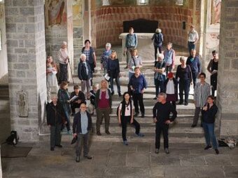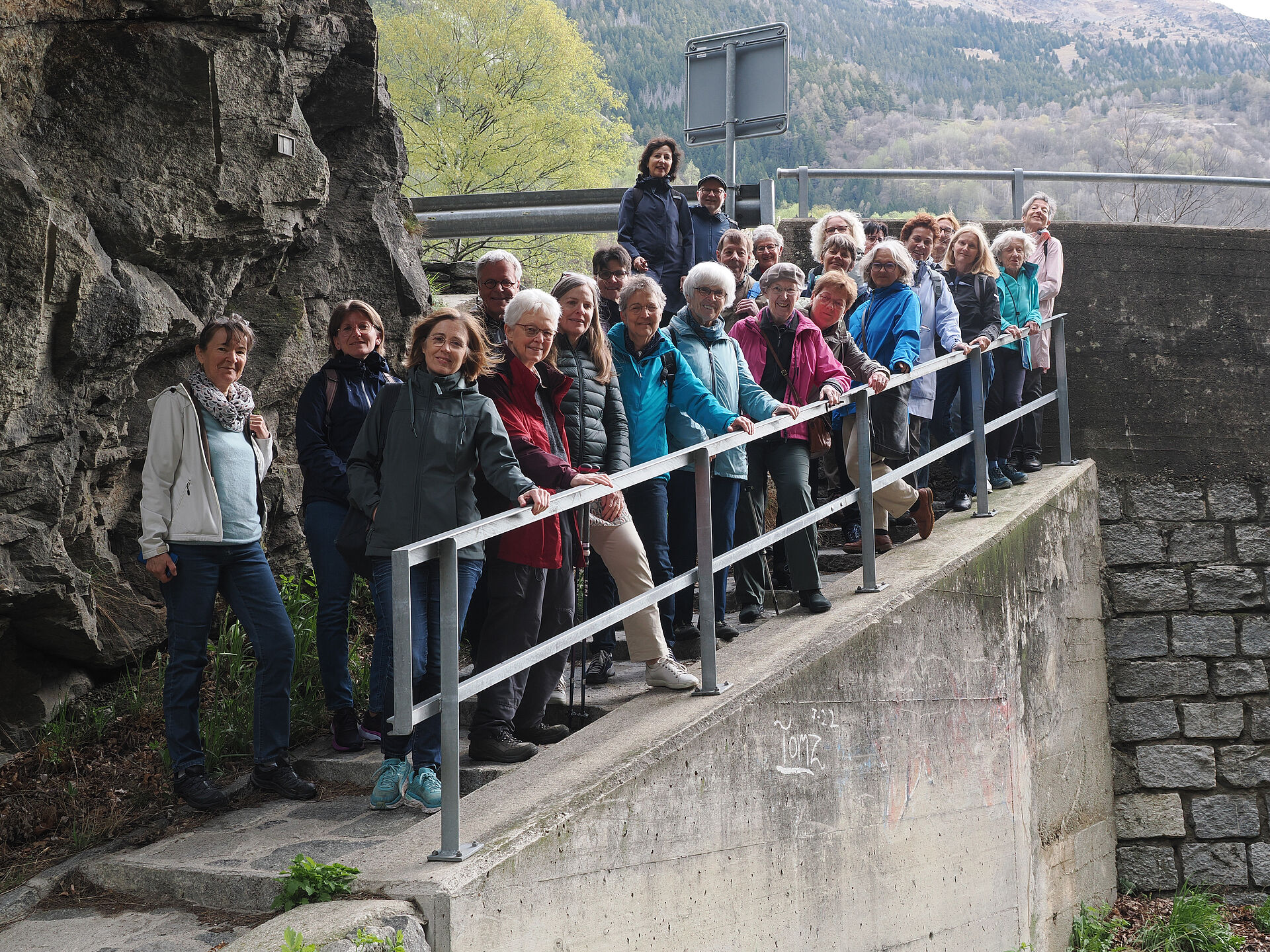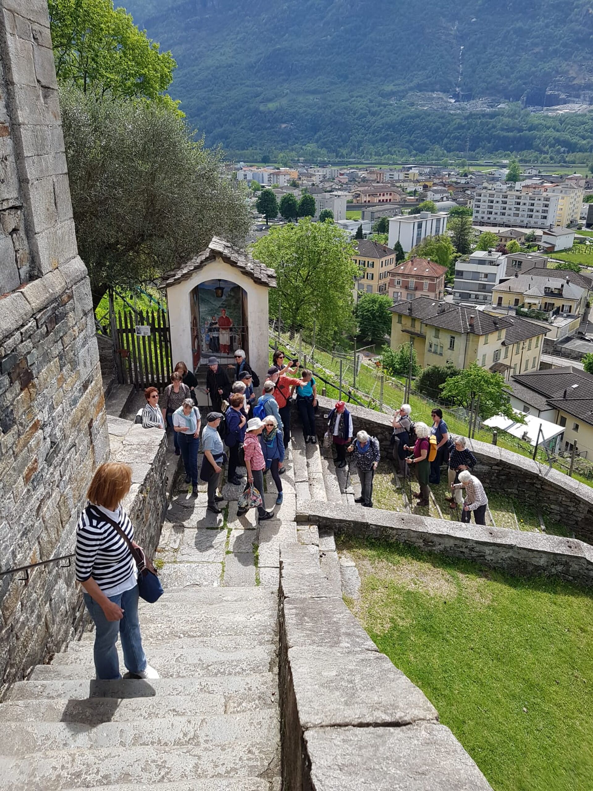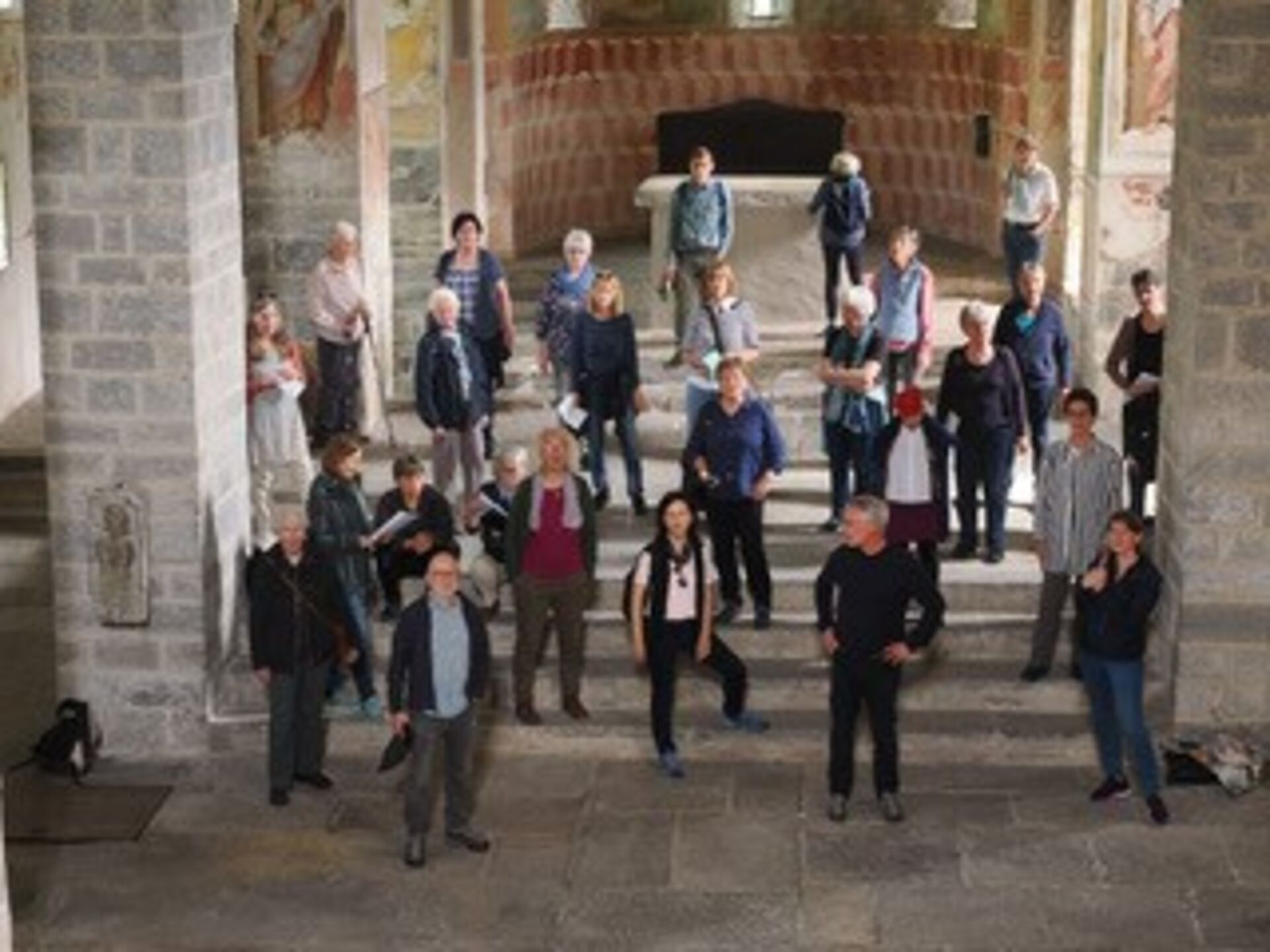 Der Car, umsichtig und sicher gelenkt von Gössi-Fahrer Stefan, führte uns nach Biasca, Mittelpunkt der drei Täler, Leventina, Bleniotal und Riviera. Alle Choristinnen und Choristen entschlossen sich den steilen Weg zur romanischen Kirche San Pietro e Paolo in Angriff zu nehmen. Oben angekommen konnte man eindrücklich in der heutigen Landschaft noch erahnen, welche Ausmasse der Bergsturz von 1513 gehabt hatte. Dem Dammbruch im 1515 folgte die sogenannte „Buzza di Biasca“, eine riesige Flut die in kürzester Zeit enorme Verwüstungen verursachte, bis zur Mündung in den Lago Maggiore. Die Handelsschiffahrt auf dem Fiume Ticino wurde verunmöglicht, die ganze Landschaft von Riviera und Piano di Magadino hatte sich total verändert.