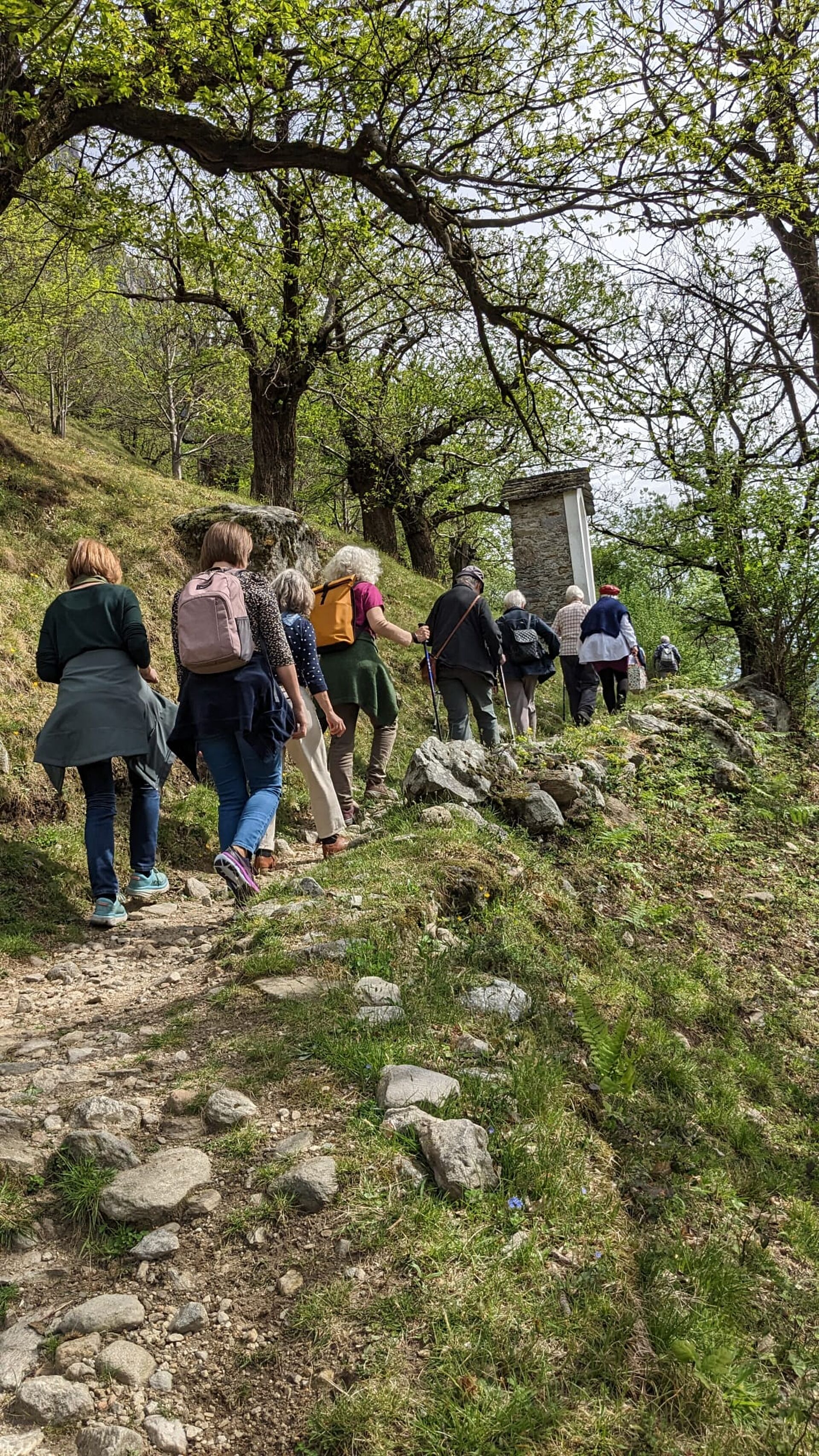Zurück an der wärmenden Sonne spazierten wir entlang des von zeitgenössischen Tessiner Künstlern mit Mosaiken geschmückten Kapellen des Kreuzwegs, durch einen Kastanienhain, der im Sommer gewiss kühlender Schatten spendet. Wir gelangten zum Oratorio di Santa Petronilla, oberhalb des gleichnamigen Wasserfalls, der im Moment wieder genügend Wasser hat.