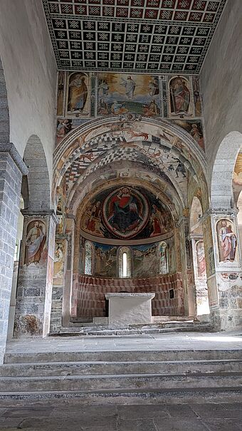 Die Kirche San Pietro e Paolo wurde nach Osten gegen den Hang gebaut. Aus diesem Grund verläuft ihr Boden markant aufwärts zum Berg. Im 20. Jh. wurden die barocken Altäre entfernt und die Fresken aus der Zeit der Gotik bis Renaissance erstrahlen an den Pilastern und in der Apsis, wo ein Christus in der Mandorla, umgeben von den 4 Evangelisten mit ihren Symbolen (davon S. Marco mit Brille!) zu sehen ist.