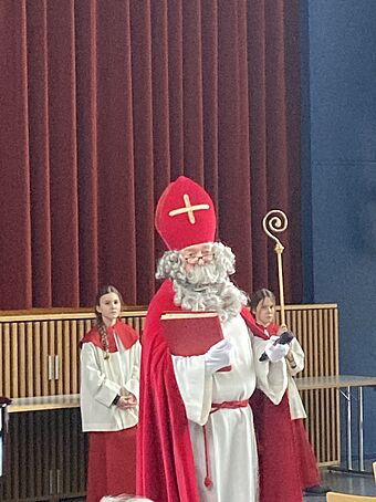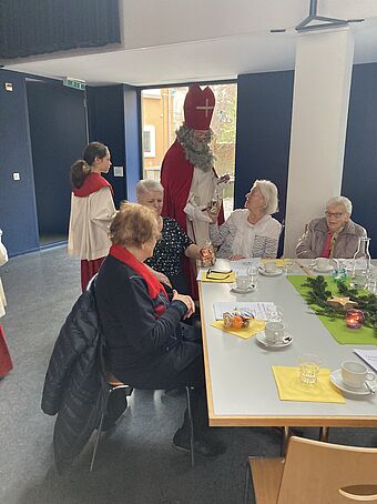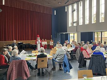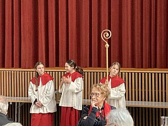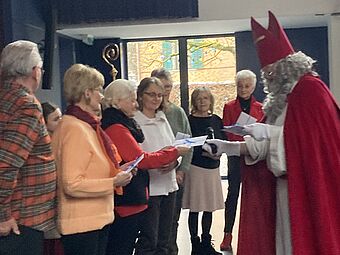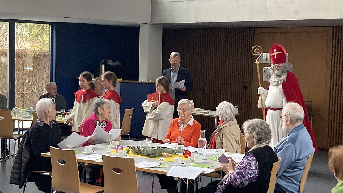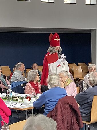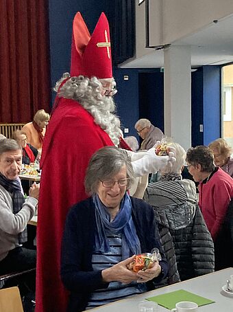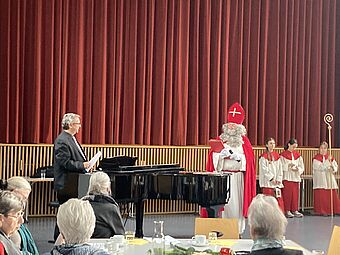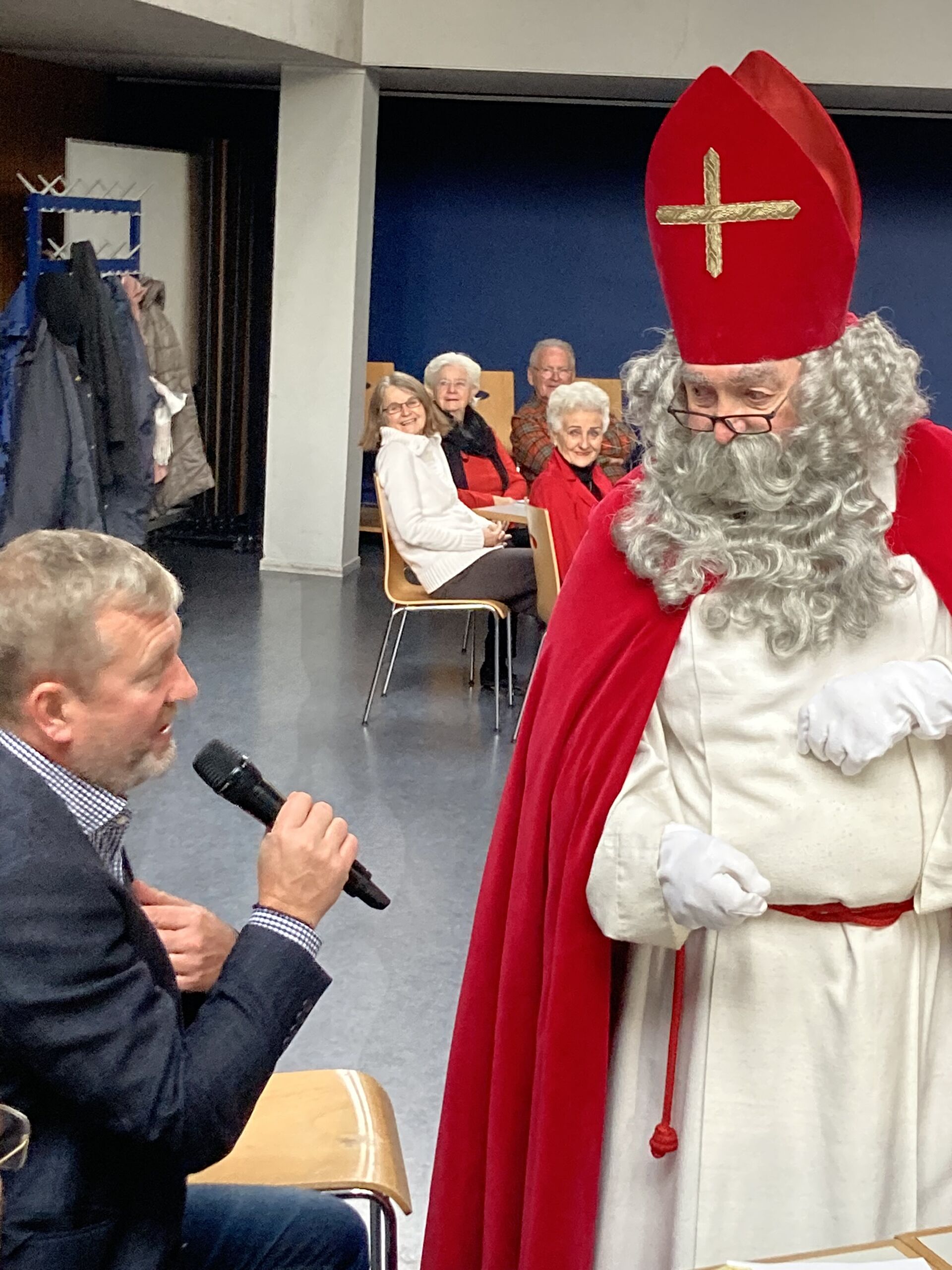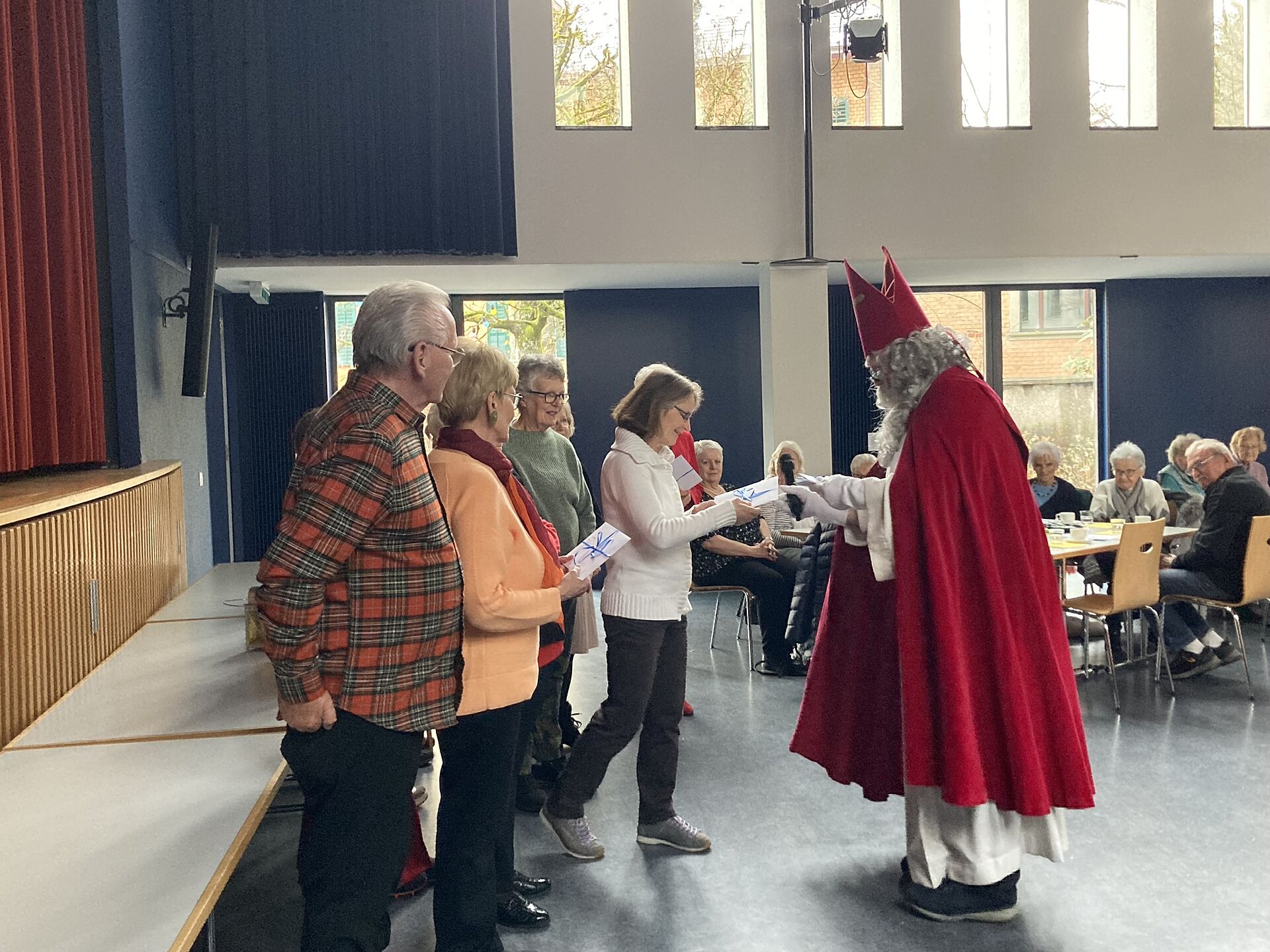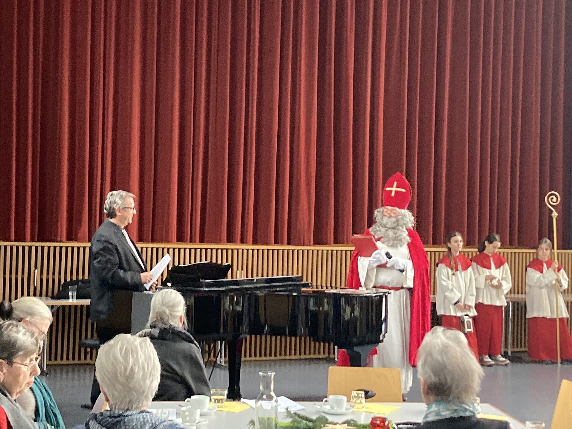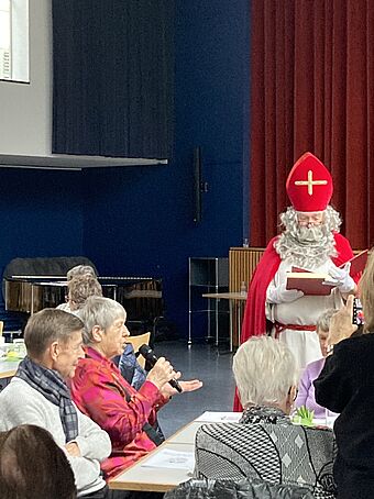 «Die Schmutzli’s seien wohl im Wald steckengeblieben und müssten die Räder am Schlitten montieren», meinte der Samichlaus schmunzelnd, als er den Paulussaal, gefolgt von Dienerinnen mit Laterne und Glöcklein betrat. Er und sein Gefolge wurde von den rund 60 anwesenden Frauen und Männern singend begrüsst. Mathias Inauen begleitete die Sänger:innen am Piano, Pfarrer Rafal Lupa, Quartierarbeiterin Susanne Wallimann und das Seniorentreff-Team unterstützten tatkräftig. Der Samichlaus legte den Anwesenden ans Herz, aufeinander zuzugehen, soziale Kontakte zu pflegen und weiterzusagen, was für tolle Anlässe während dem Jahr im Paulusheim stattfinden. Es wurden Gedichte vorgetragen, Samichlaussäckli verteilt, gemütlich bei Kaffee und Gritibänz zusammengesessen und nicht zuletzt wurde das Seniorentreff-Team verdankt für ihr grossartiges Engagement. Das neue Jahresprogramm 2024 finden Sie hier.