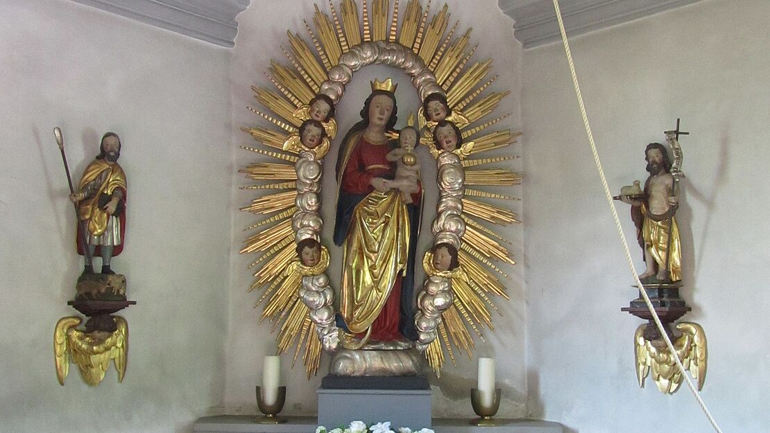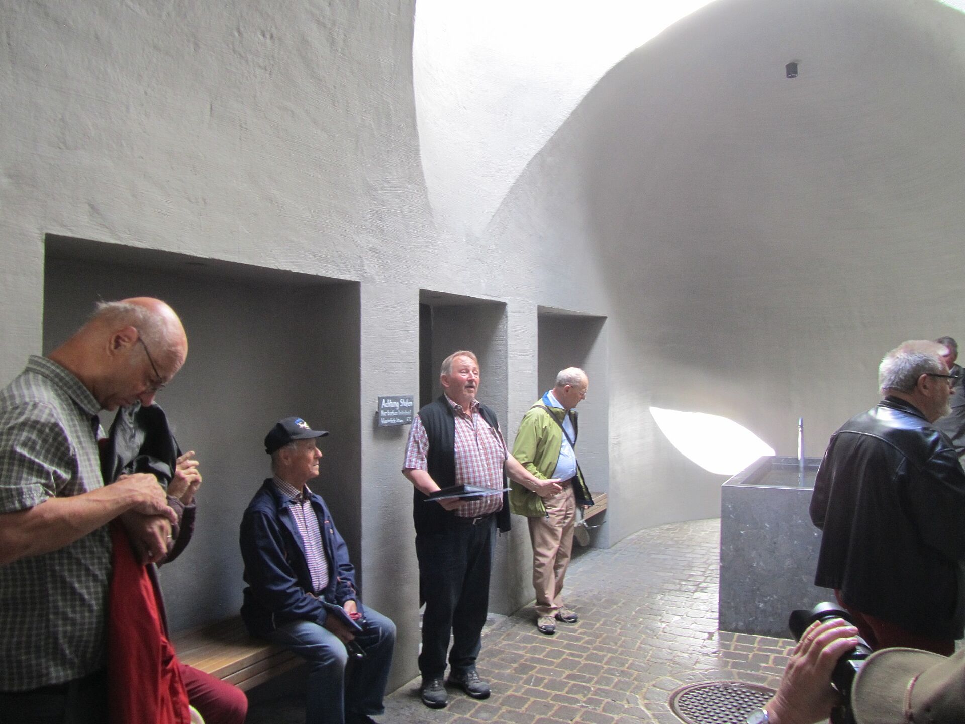 Mit Abbildungen von alten Stichen und Fotos erläuterte unser Führer die Geschichte des Ortes, so des ehemaligen Eremitenklosters, welches von 1846-1904 als Zentrale und Noviziat der Waldbrüder und Eremiten für die Bistümer Basel und Chur diente. Er beschrieb die verschiedenen Kapellenbauten bis zur heutigen Kirche «Maria Heilbronn», welche der Luzerner Architekt August Broyer 1950 baute. In der Eingangshalle steht das Gnadenbild der Einsiedler Madonna . Farbige Glasfenster von Eduard Renggli erzählen die Gründungsgeschichte des Wallfahrtsortes.