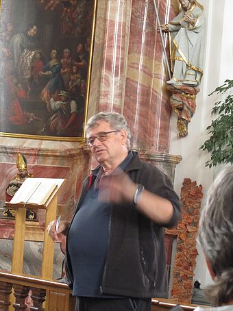 Mit dem Postbus fuhren wir anschliessend nach Luthern zurück, wo uns Markus Lustenberger auf die Sehenswürdigkeiten rund um den schönen Dorfplatz hinwies und in die Geschichte der Pfarrkirche einführte. Sie wurde 1751/52 unter den Äbten Robert Balthasar und Augustin Müller von St. Urban durch Jakob Singer aus Luzern und Johann Josef Purtschert aus Pfaffnau erbaut.