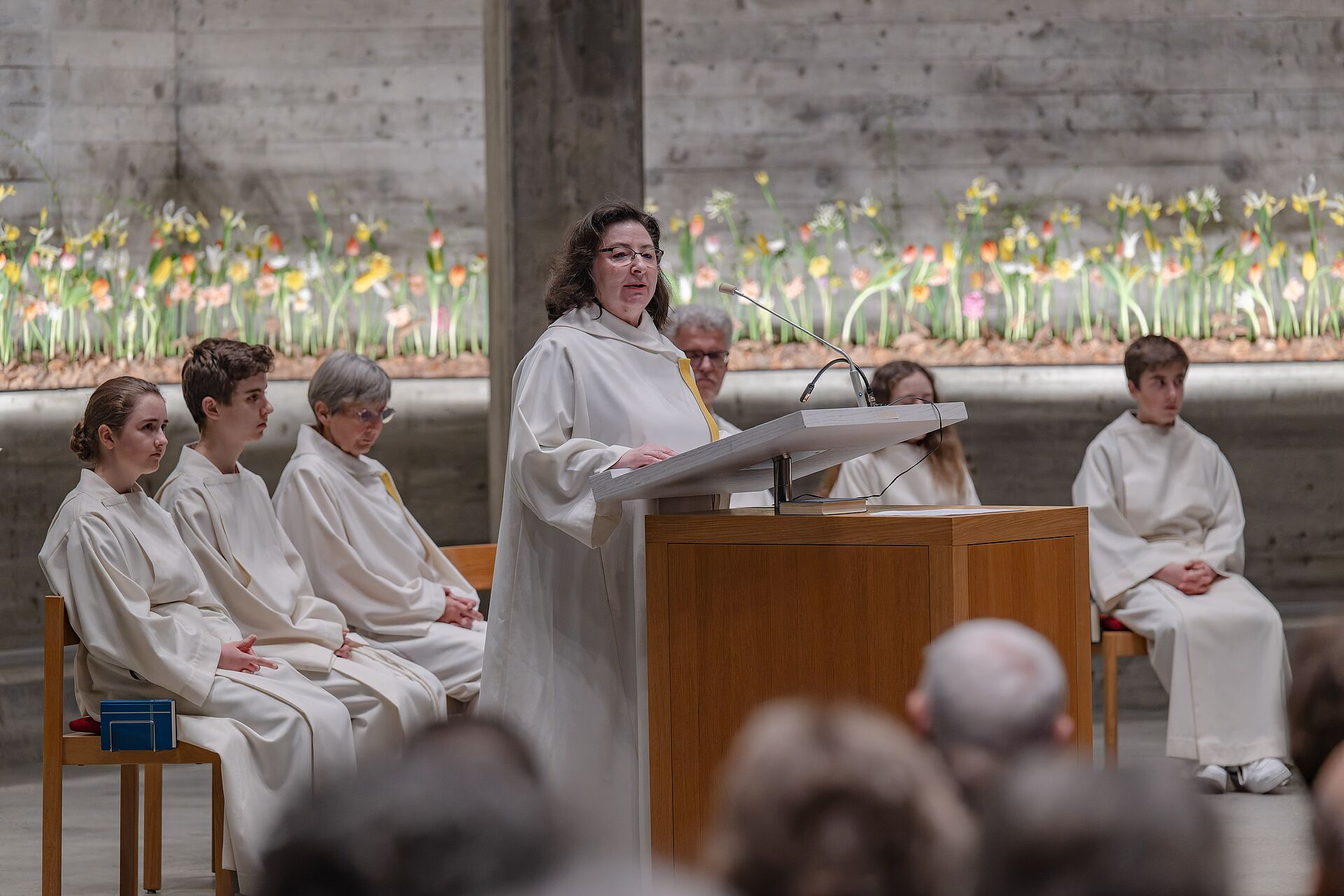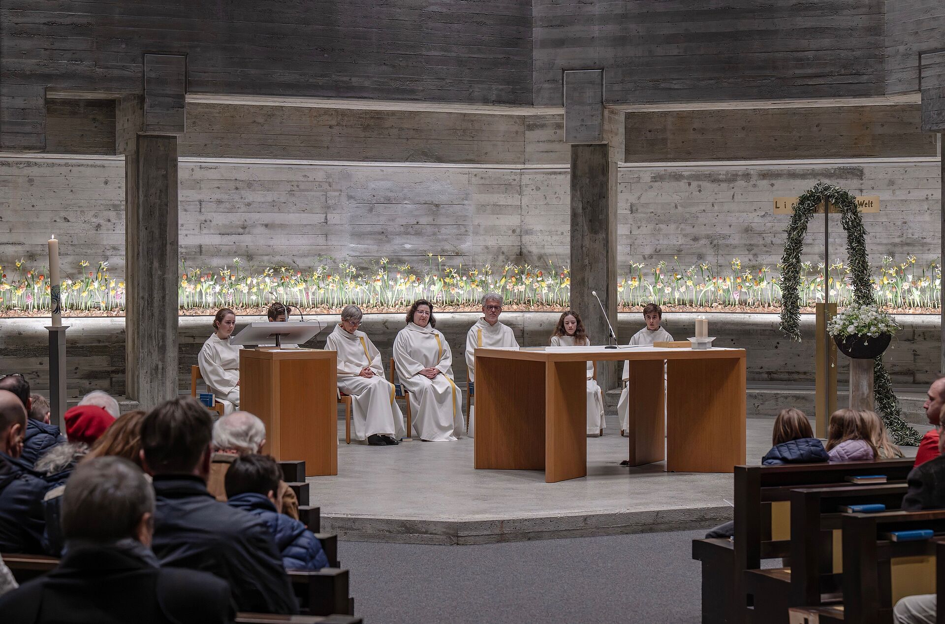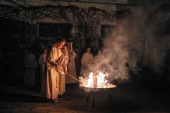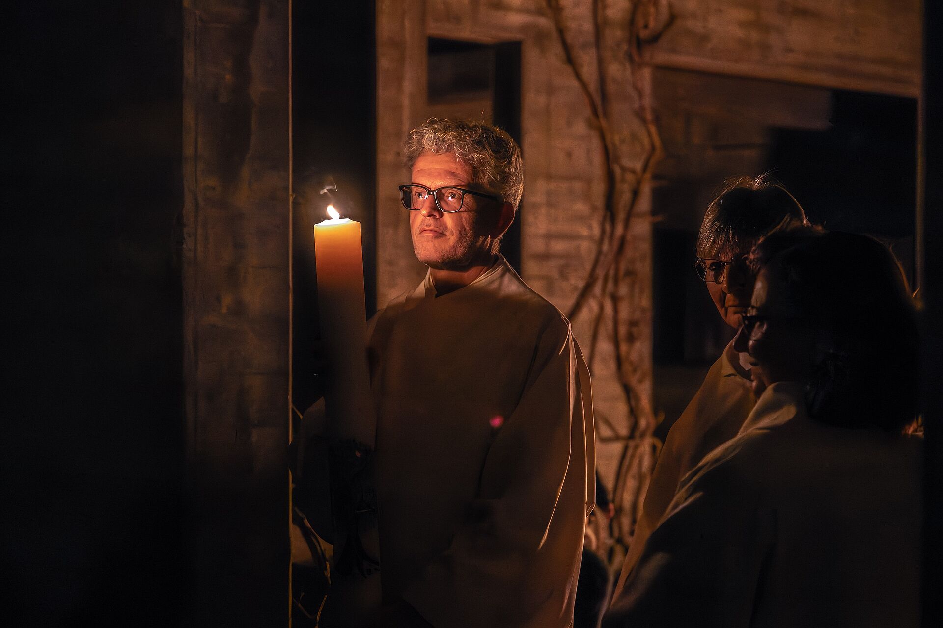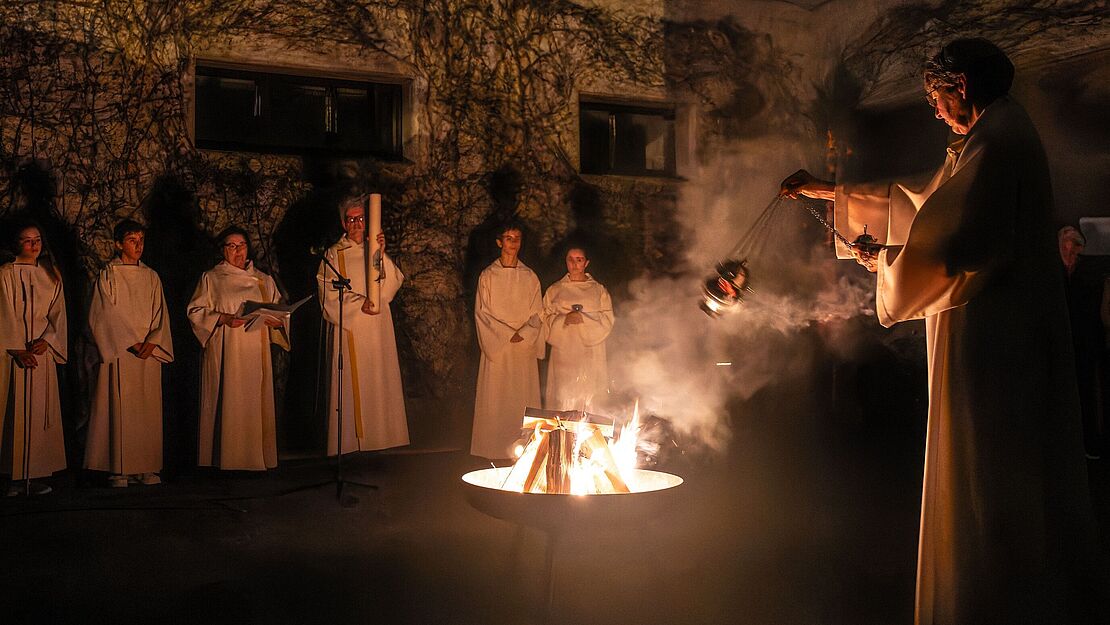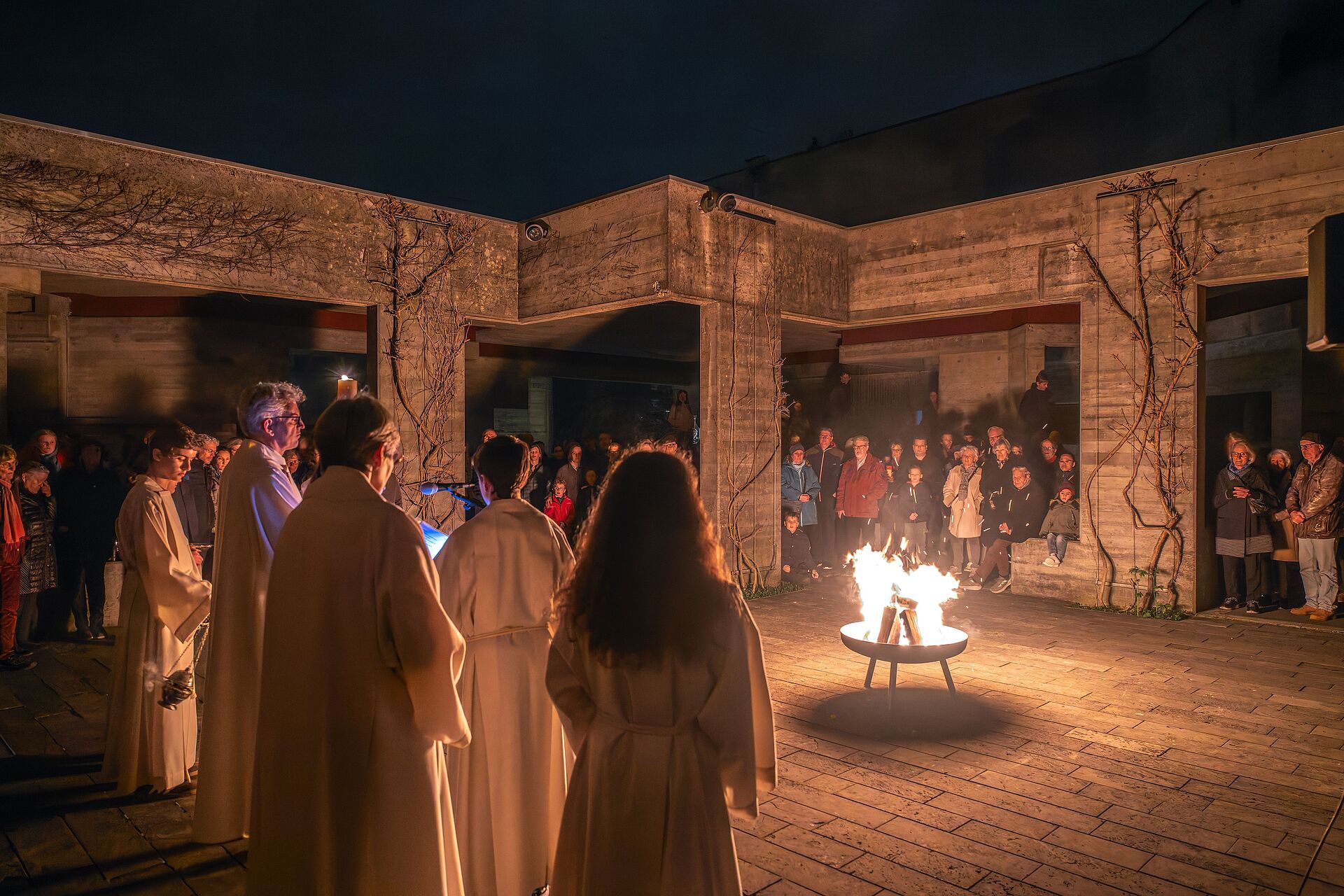 Stimmungsvolle Bilder von der Nacht der Nächte: Osterfeuer, Lichter anzünden in der dunklen Kirche, Osterlob von Sebastian Lipp, Segnung der neuen Osterkerze, JohannesChor, Spring String Quartet, anschliessend Eiertütschen im Innenhof.