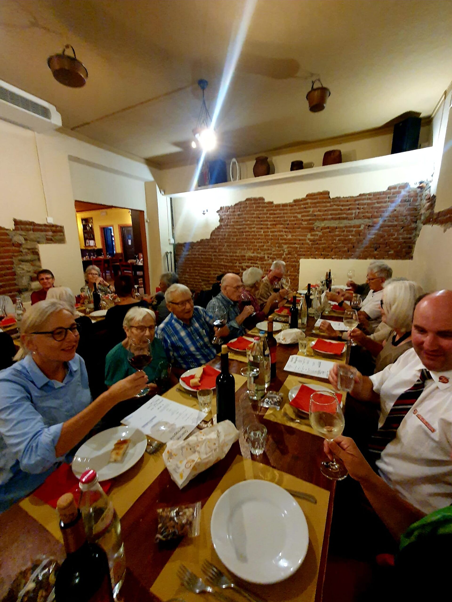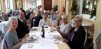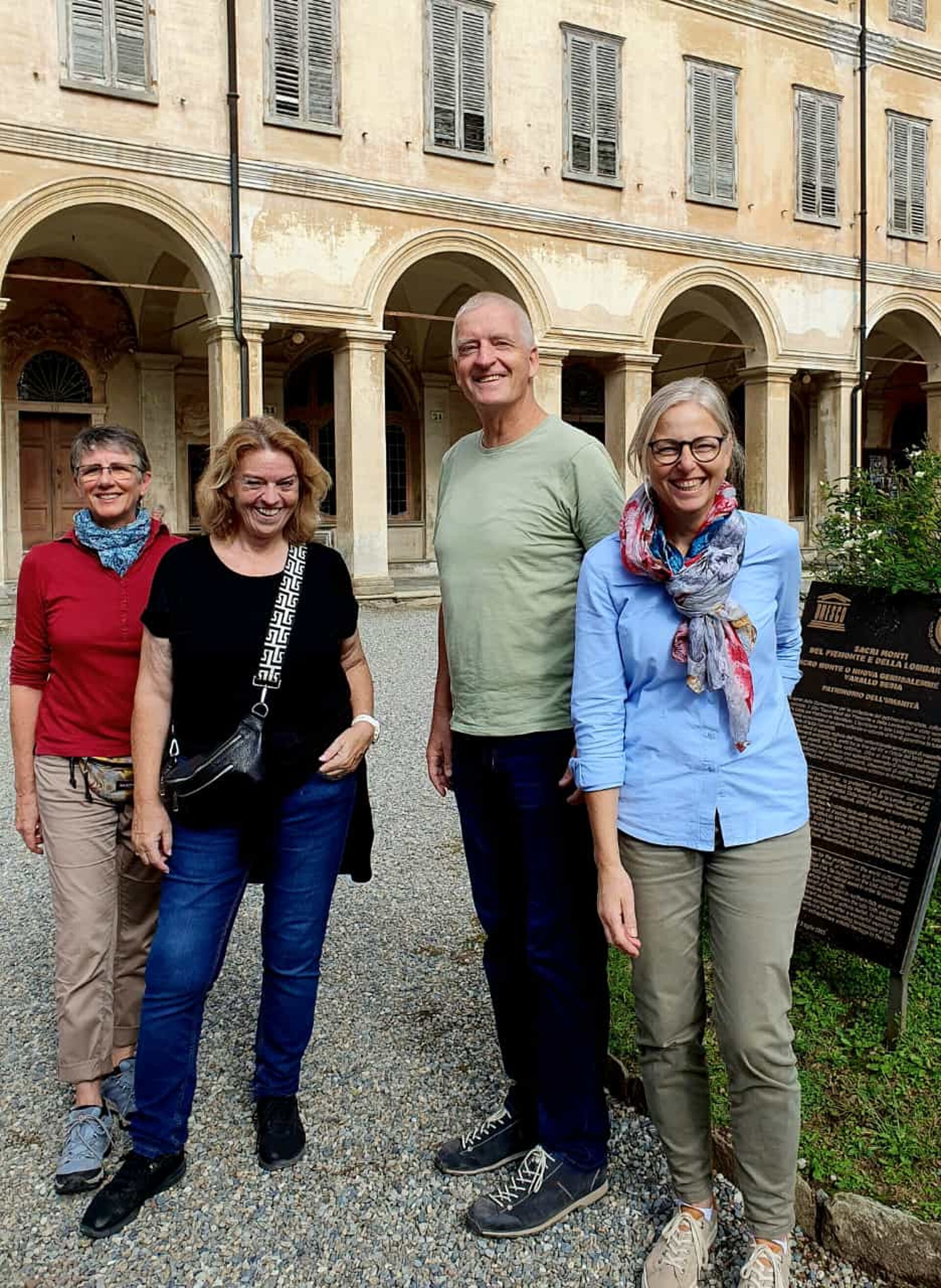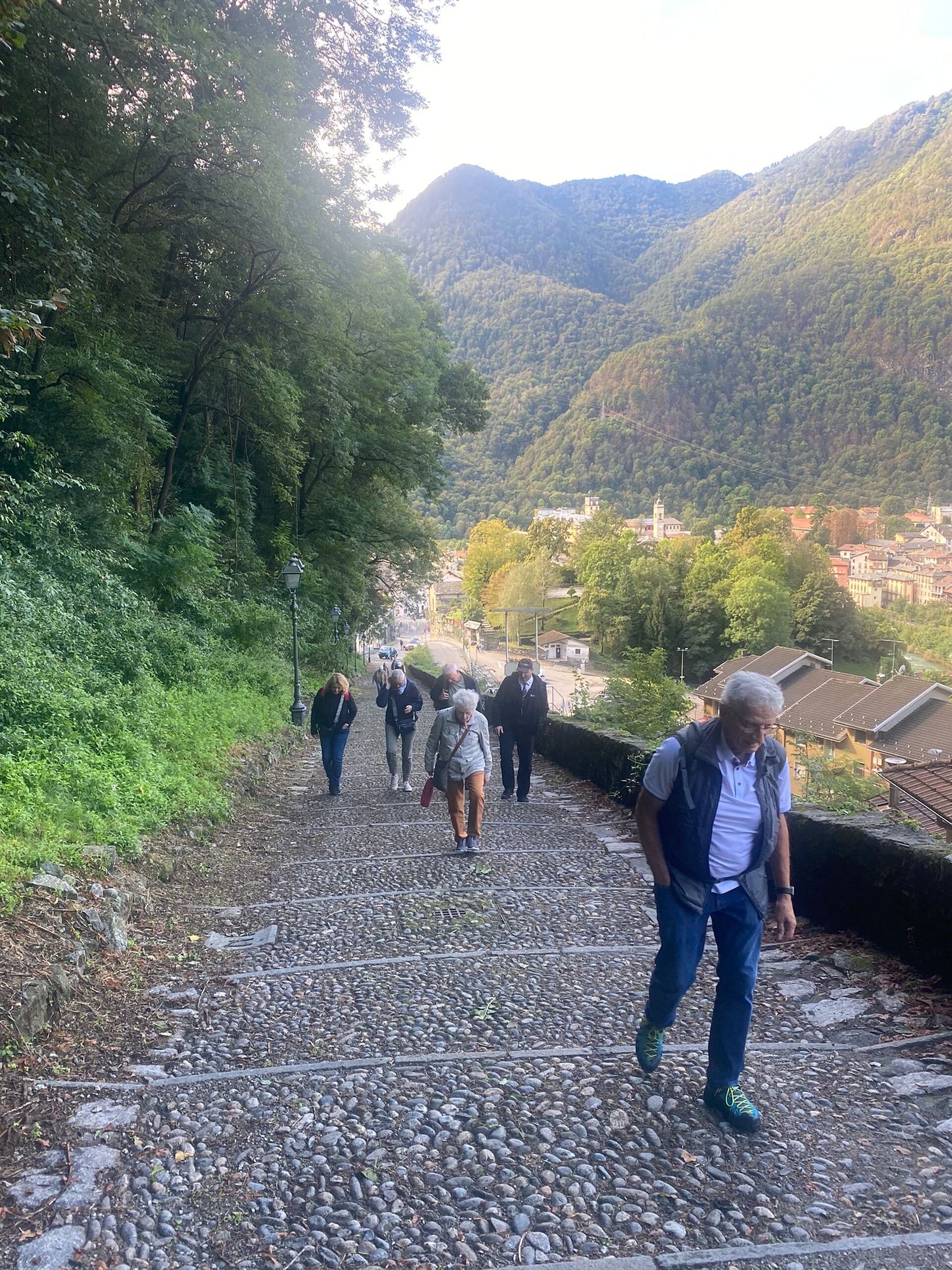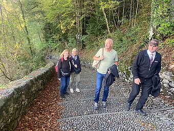 Am Samstag besuchten wir das UNESCO Weltkulturerbe, den Wahlfahrtsort Sacre Monte di Varallo, unserem Reisehöhepunkt. Das Wetter wurde immer sonniger. Die einen bestiegen den Berg zu Fuss, andere fuhren per Seilbahn hoch. Die 45 einzelnen Andachtsstätten sollten die für viele Pilger nicht oder nicht mehr erreichbaren Stätten im Heiligen Land versinnbildlichen. In Varallo begann man im Jahre 1491, auf Veranlassung des Franziskanerbruders Bernard Caimi diese Bauwerke mit den biblischen Bildern mit Figuren und Wandmalereien zu bauen. Am Mittag wurden wir mit piemontesischen Spezialitäten verwöhnt. Auf dem Rückweg machten wir Halt in Sizzano, in einem Agriturismo, wo wir alle Speisen auf den Tisch serviert bekamen und es wurde einheimischer Wein dazu getrunken. Leider hielt uns auf dem Weg zum Hotel ein platter Reifen zurück und der Chauffeur und Männer mussten Hand anlegen, bevor die Reise weiter ging. Zum Glück waren alle satt vom üppigen Znacht.