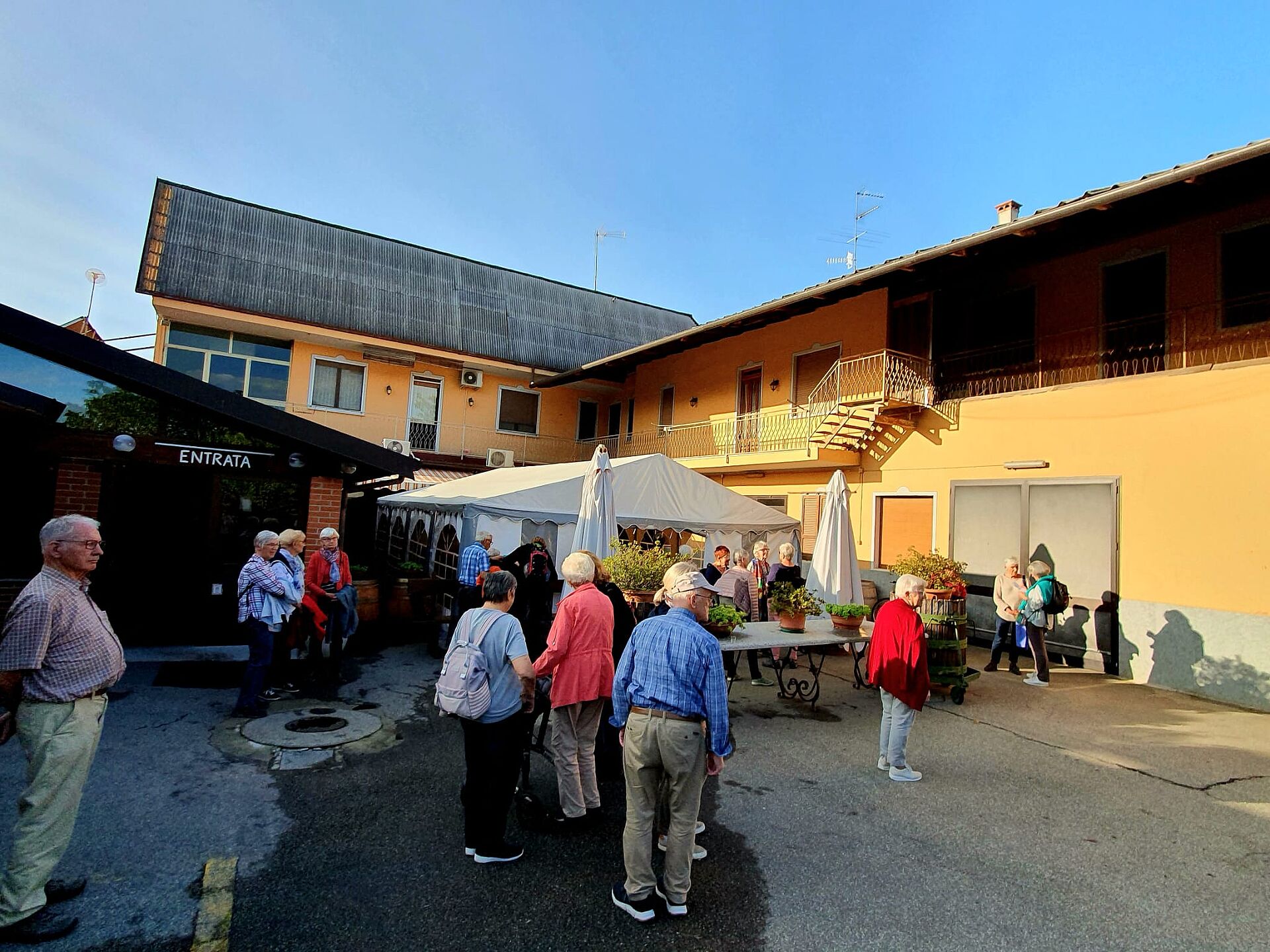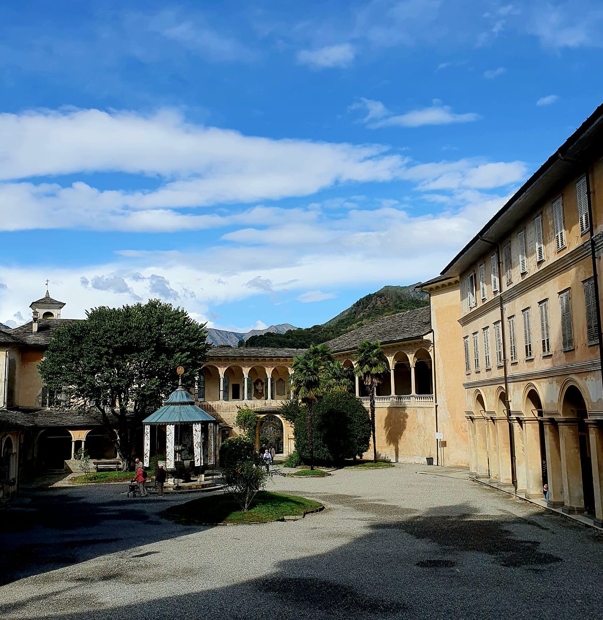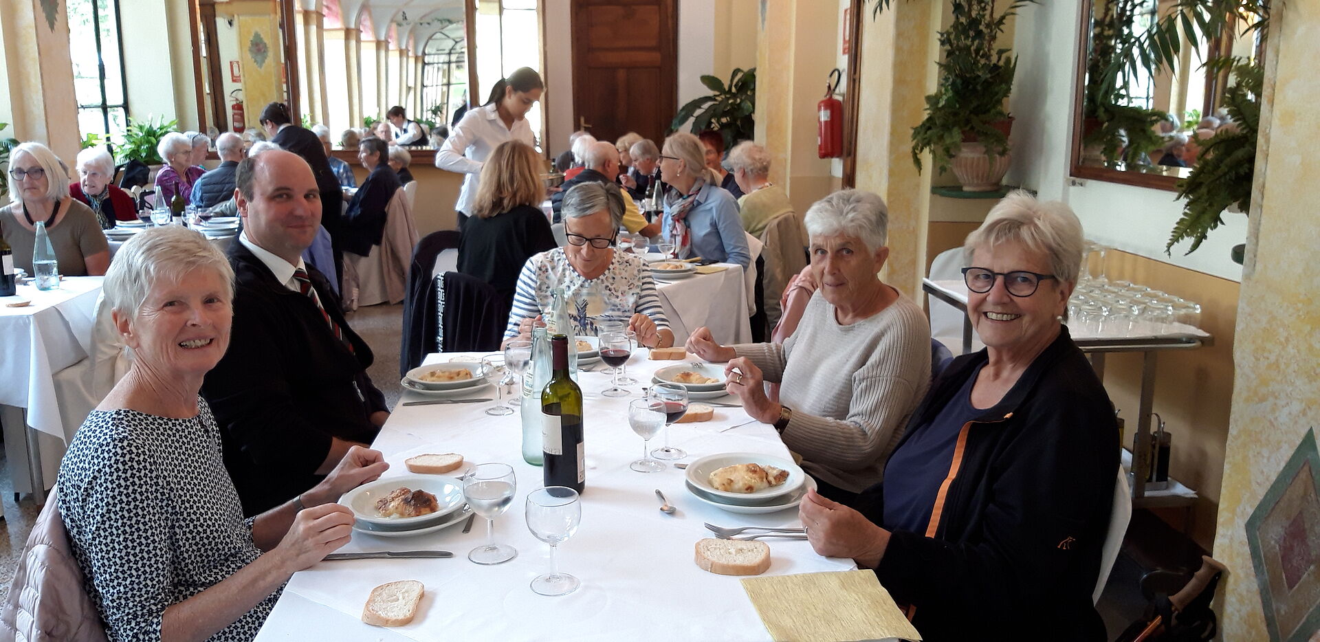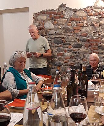 Am Samstag besuchten wir das UNESCO Weltkulturerbe, den Wahlfahrtsort Sacre Monte di Varallo, unserem Reisehöhepunkt. Das Wetter wurde immer sonniger. Die einen bestiegen den Berg zu Fuss, andere fuhren per Seilbahn hoch. Die 45 einzelnen Andachtsstätten sollten die für viele Pilger nicht oder nicht mehr erreichbaren Stätten im Heiligen Land versinnbildlichen. In Varallo begann man im Jahre 1491, auf Veranlassung des Franziskanerbruders Bernard Caimi diese Bauwerke mit den biblischen Bildern mit Figuren und Wandmalereien zu bauen. Am Mittag wurden wir mit piemontesischen Spezialitäten verwöhnt. Auf dem Rückweg machten wir Halt in Sizzano, in einem Agriturismo, wo wir alle Speisen auf den Tisch serviert bekamen und es wurde einheimischer Wein dazu getrunken. Leider hielt uns auf dem Weg zum Hotel ein platter Reifen zurück und der Chauffeur und Männer mussten Hand anlegen, bevor die Reise weiter ging. Zum Glück waren alle satt vom üppigen Znacht.