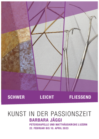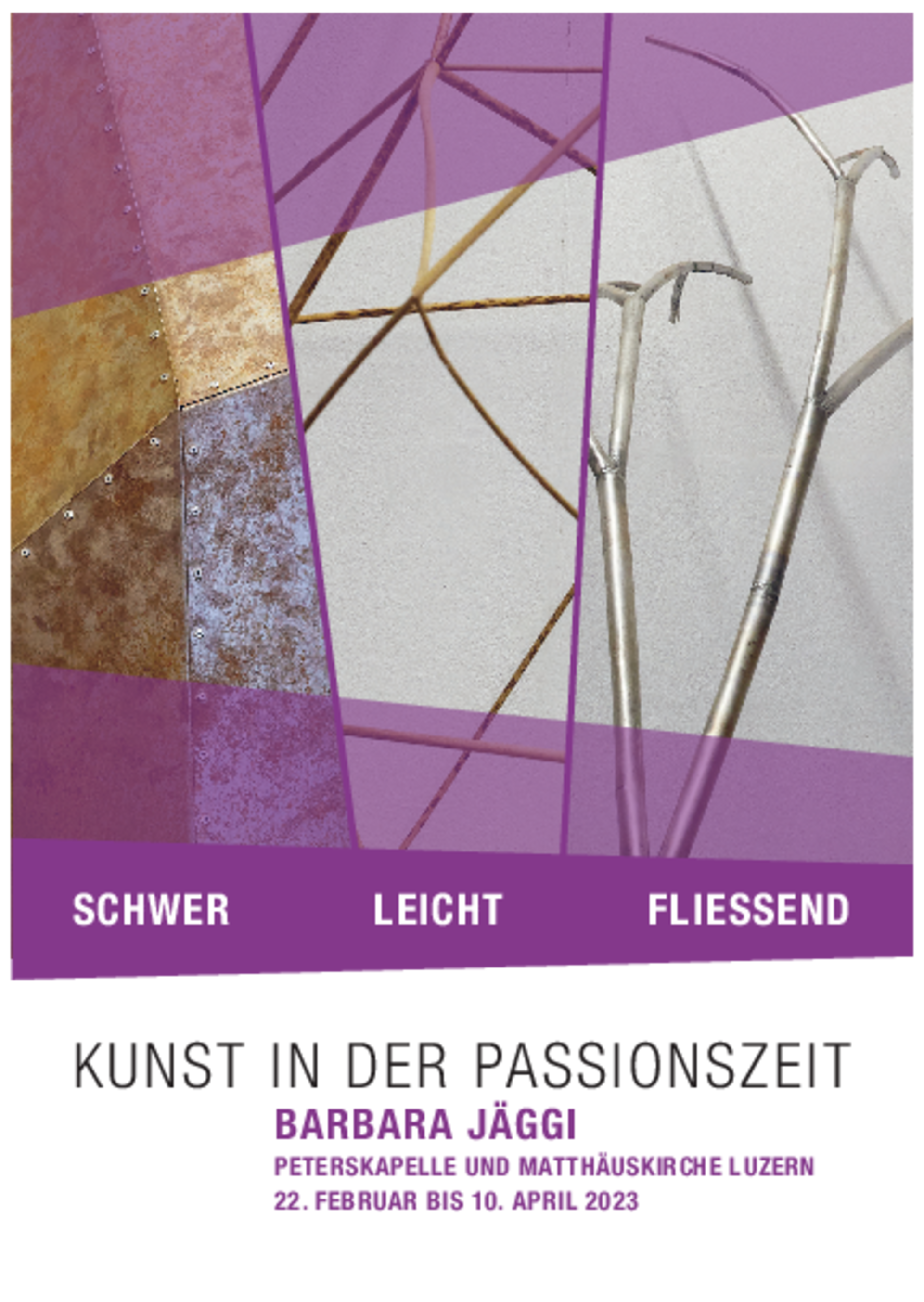 Die Werke von Barbara Jäggi sind vom 22. Februar bis 10. April in der Peterskapelle und in und an der Matthäuskirche zu sehen. Die Vernissage findet am 22. Februar um 18 Uhr, die Finissage am 10. April um 17 Uhr statt, jeweils beginnend in der Matthäuskirche mit einem anschliessenden Weg zur Peterskapelle. Der Sonntagsgottesdienst in der Matthäuskirche vom 26. Februar um 10 Uhr und die Mittagsimpulse «zwölfnachzwölf» in der Peterskapelle an den ersten Tagen der Fastenzeit von Aschermittwoch bis Samstag (22. bis 25. Februar, jeweils um 12 Uhr 12) nehmen Bezug zu Jäggis Werken.