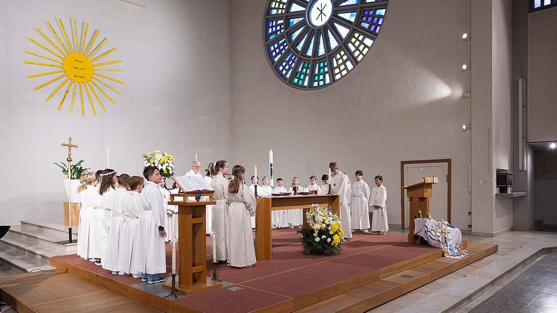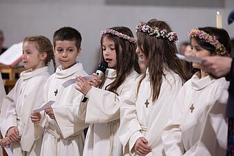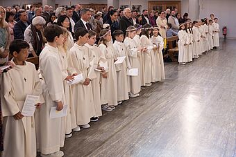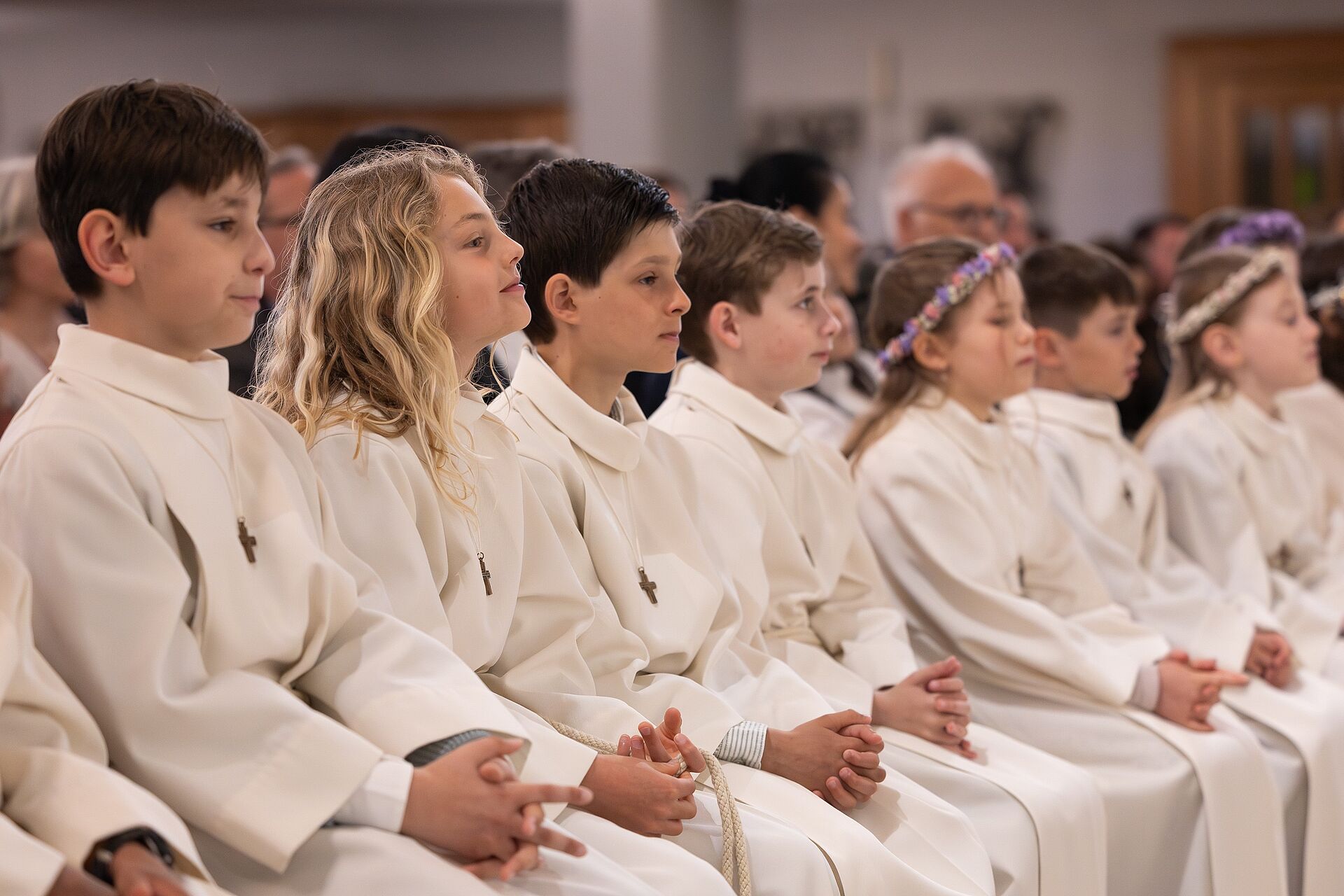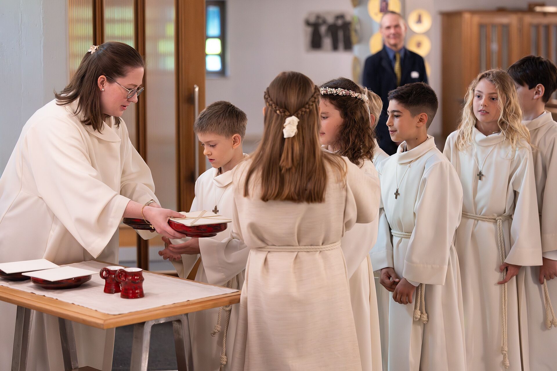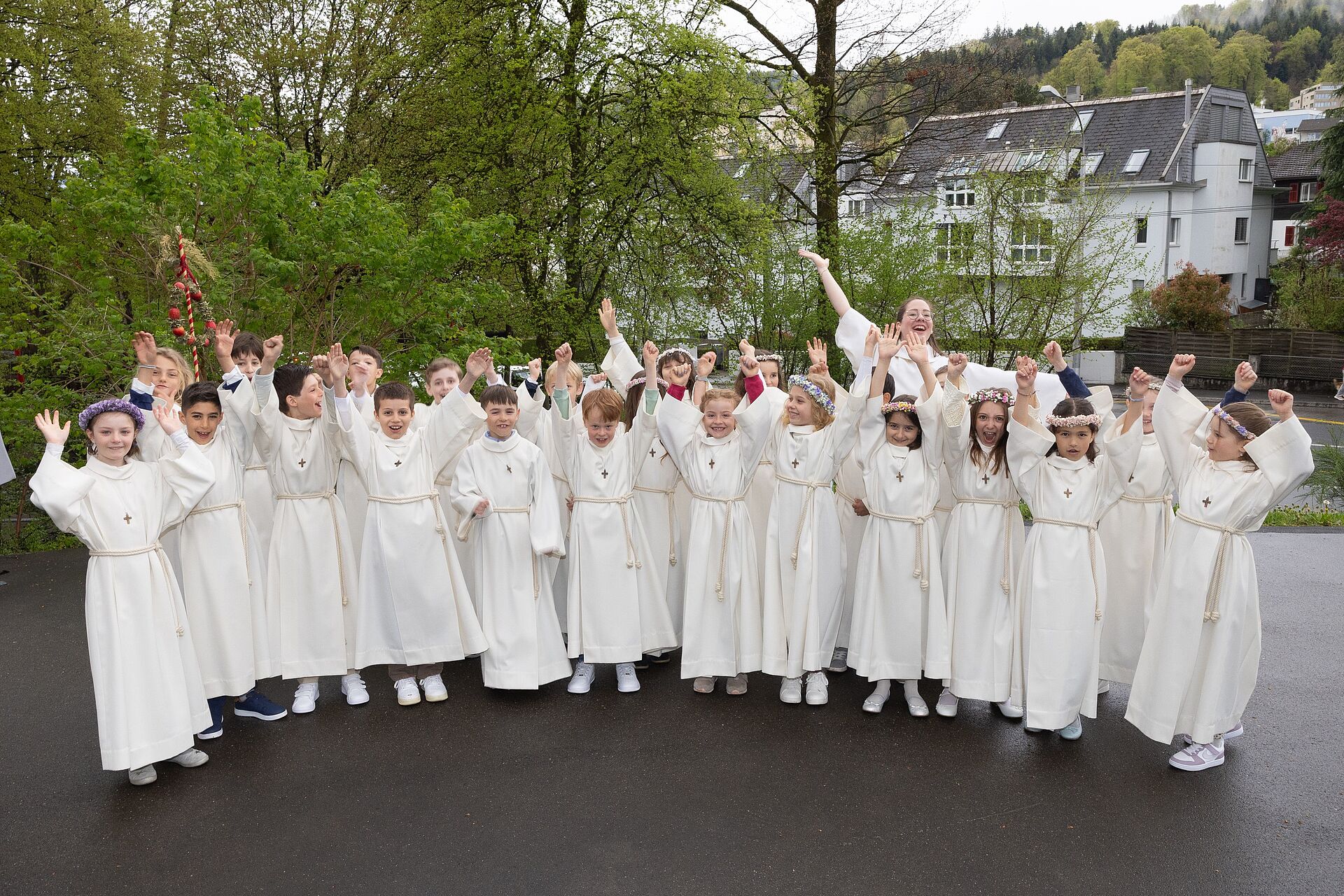 Der Gottesdienst war ein grosses Fest: Die Kinder brachten sich aktiv ein, sie begrüssten, lasen Fürbitten, halfen bei der Gabenbereitung und sangen gemeinsam mit dem Kinder- und Jugendchor. Am Altar versammelt durfen sie erstmals das heilige Brot empfangen und so ganz besonders dem lieben Gott begegnen.