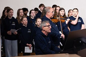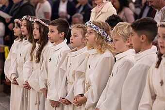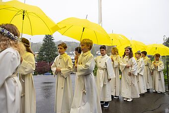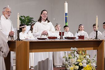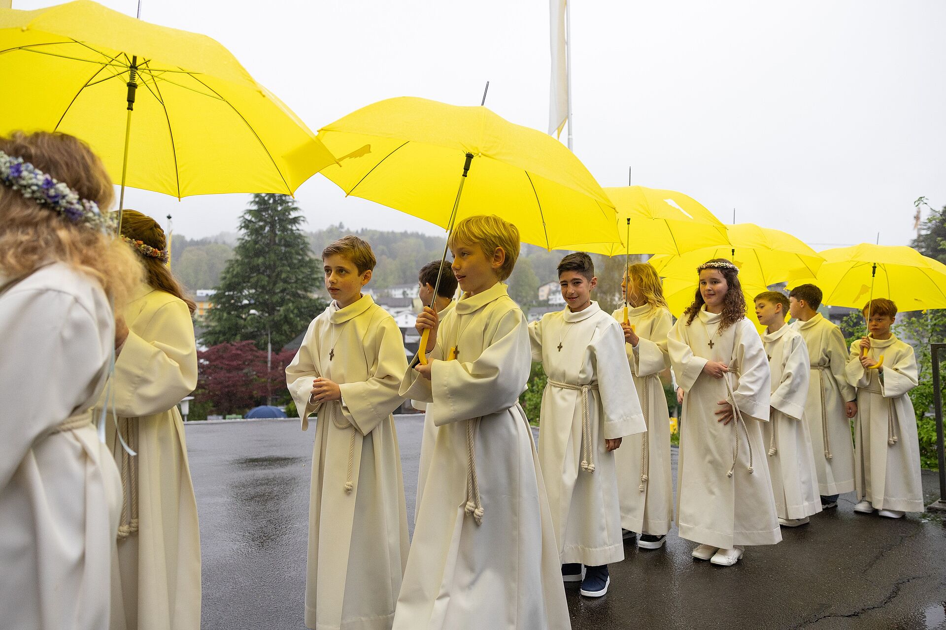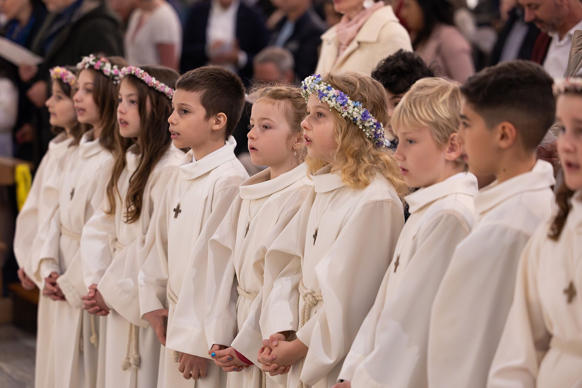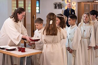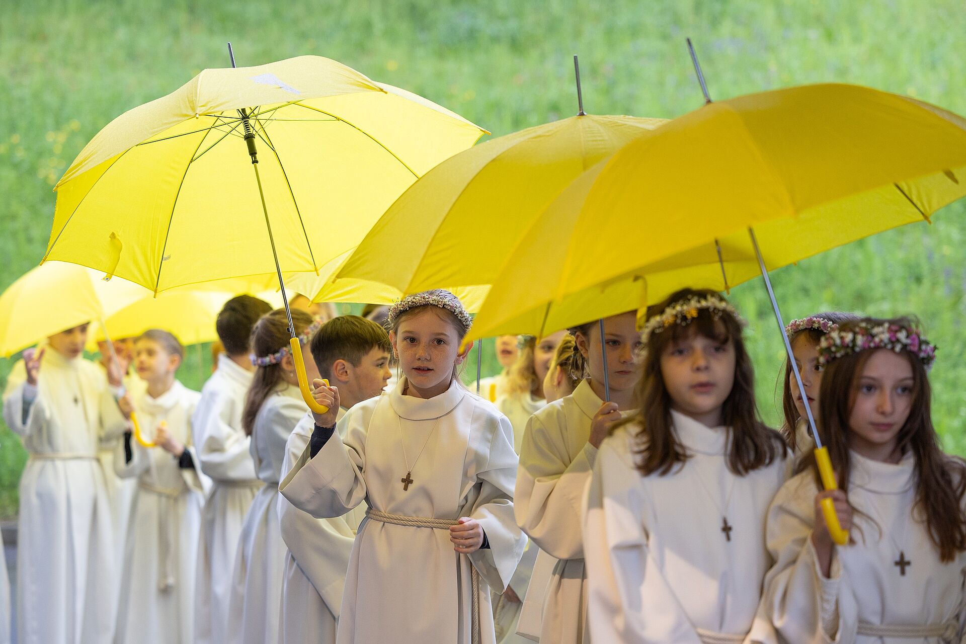Der Gottesdienst war ein grosses Fest: Die Kinder brachten sich aktiv ein, sie begrüssten, lasen Fürbitten, halfen bei der Gabenbereitung und sangen gemeinsam mit dem Kinder- und Jugendchor. Am Altar versammelt durfen sie erstmals das heilige Brot empfangen und so ganz besonders dem lieben Gott begegnen.