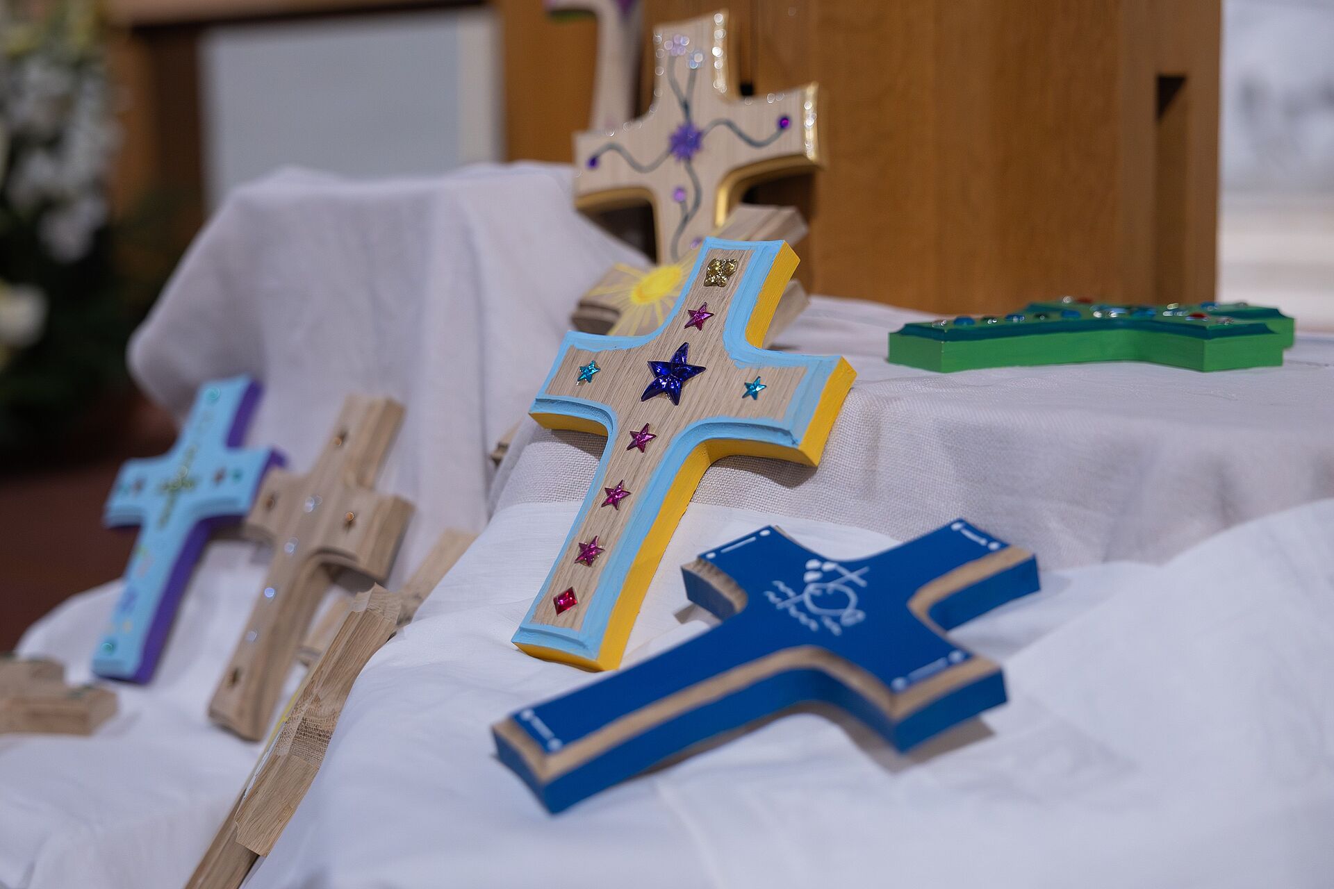 Zum Schluss erhielten die Kinder ihre persönlichen Holzkreuze, welche ihre Bezugspersonen für sie verziert und gestaltet haben. Gestärkt und beschenkt durften die Erstkommunionskinder anschliessend beim Apéro und dann mit ihren Familien weiterfeiern.