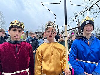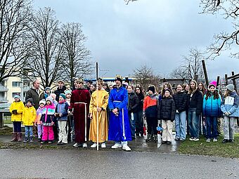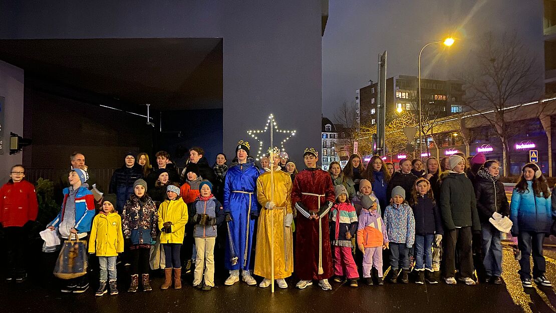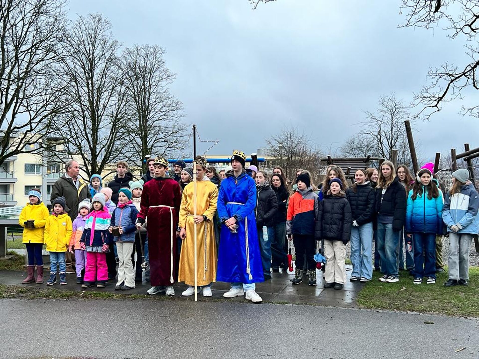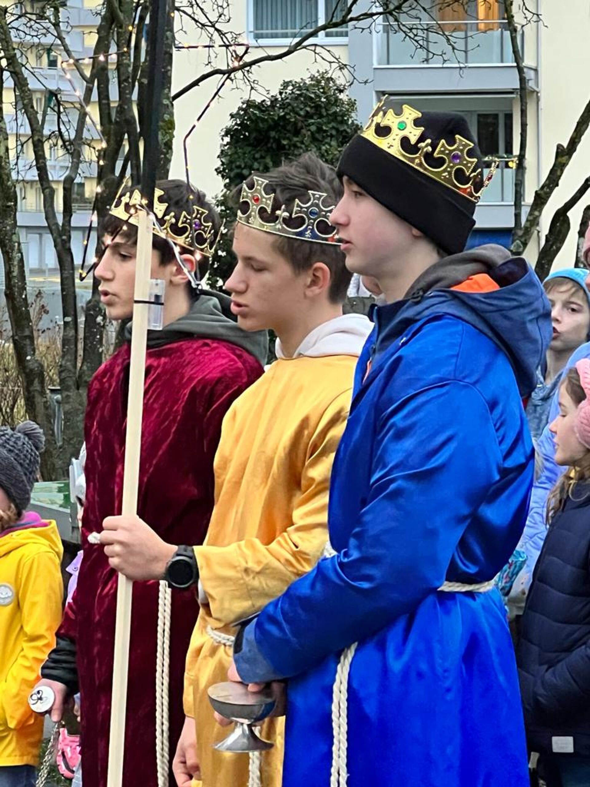 Mit Liedern und Texten machte sich die "Heiligen Drei Könige" mit einer Gruppe des Kinder- und Jugendchors auf den Weg. Sie machten Halt bei der Hirtenhofwiese, beim Spar, im Tribschenquartier beim Peproccini und auf dem Spielplatz St. Anton. Es wurden Lieder dargeboten und Texte aufgesagt. So konnte für die Sternsingeraktion «Gemeinsam für unsere Erde in Amazonien und weltweit» aufmerksam gemacht werden und über 750.-- Franken gesammelt werden.