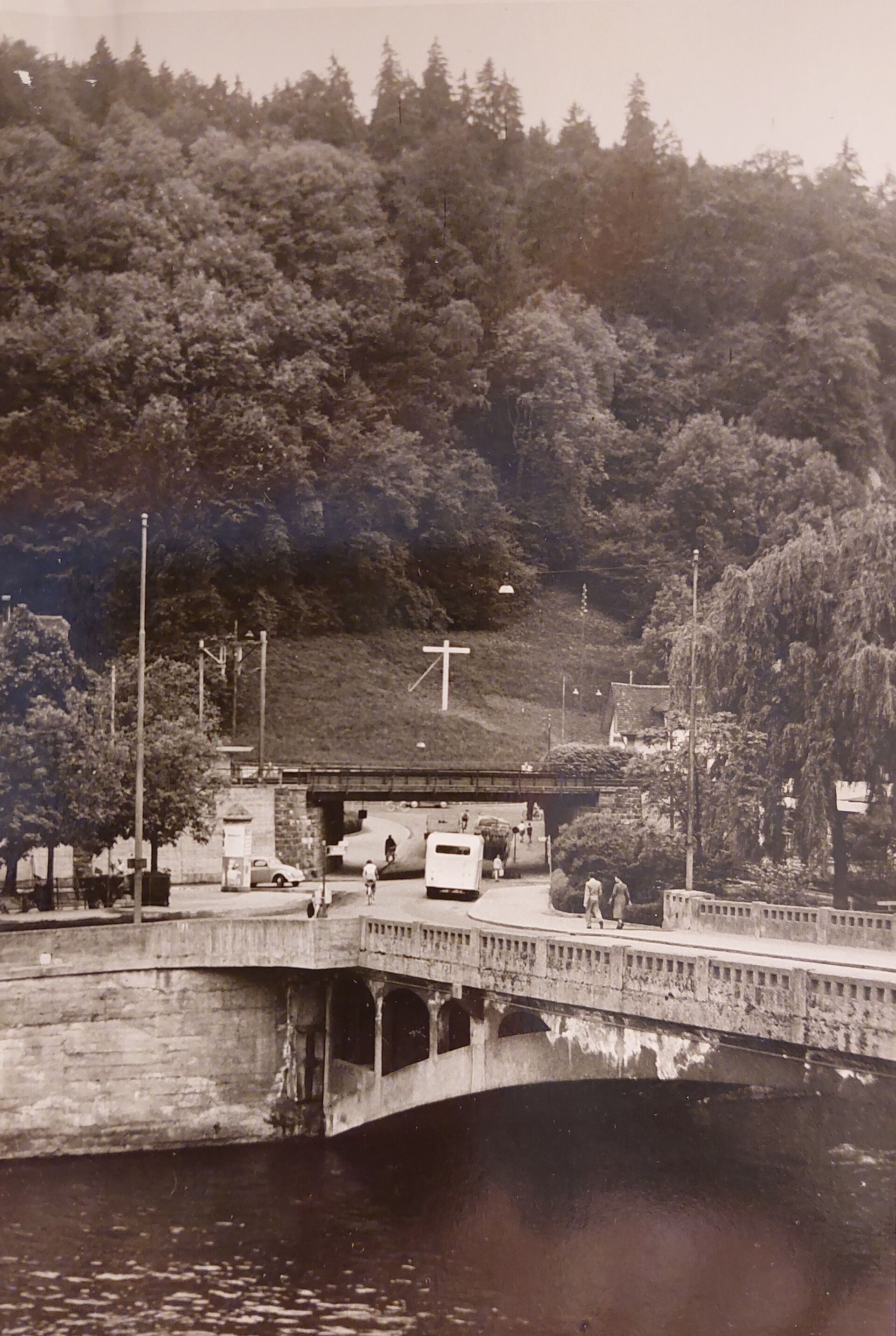 Im Kapitel über die 1950er-Jahre stand jenes Kreuz im Zentrum, für welches die «Aktion Kreuz am Stutz» Geld sammelte (Bild unten links) und den Bildhauer Josef Zurkirchen mit der Gestaltung der 6 Meter hohen Wegmarke betraute. Am 10. Oktober 1954 segnete Pfarrer Moos unter breiter Beteiligung des Volkes dieses Kreuz ein.