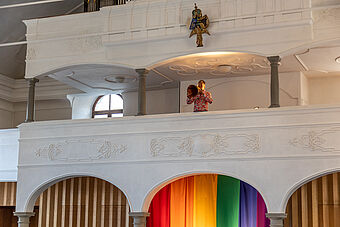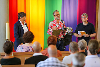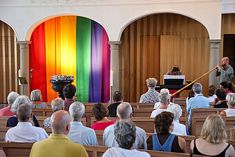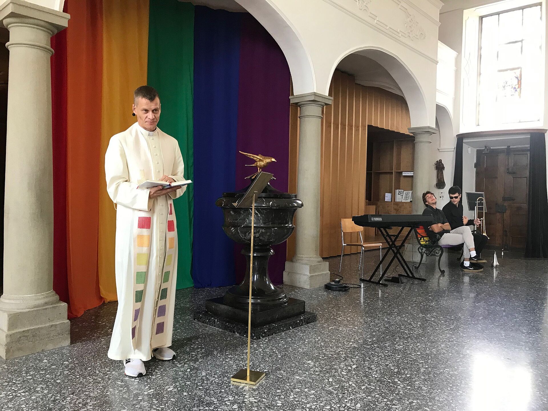 «Wir erzählen die Geschichte eines besonderen queeren Menschen in der Bibel: eine der ersten Personen, die getauft wurde», sagte Meinrad Furrer zu Beginn des Gottesdienstes, Mitorganisator der kirchlichen Pride-Events und Leiter der römisch-katholischen Peterskapelle, der damit auf die Lesung aus der biblischen Apostelgeschichte vorbereitete.